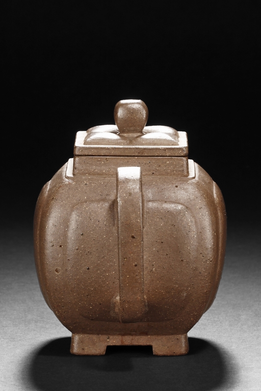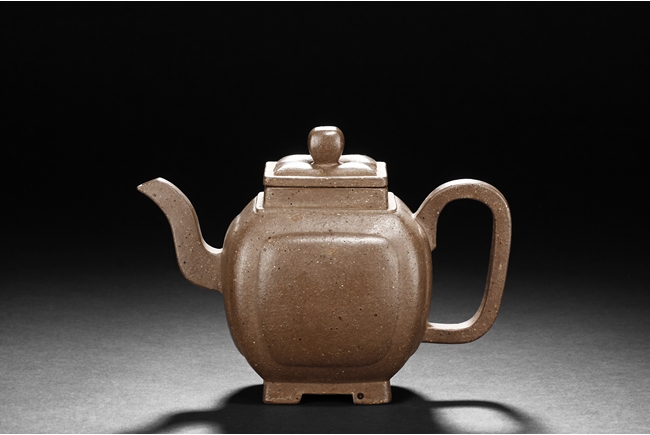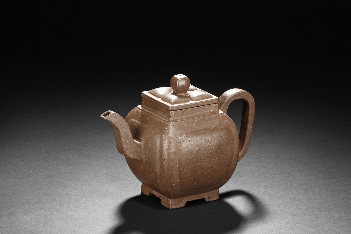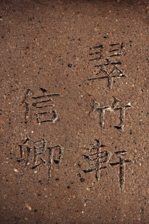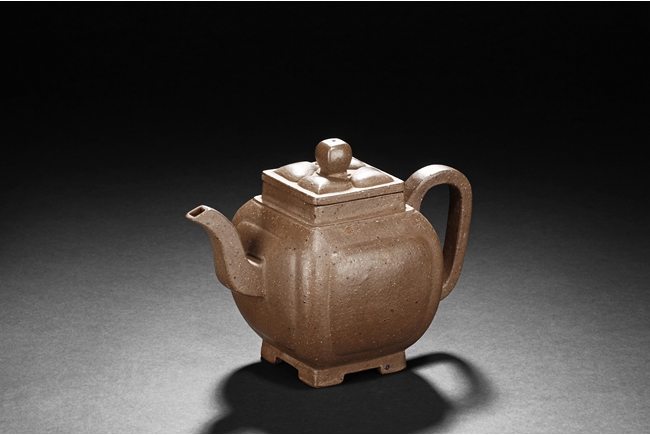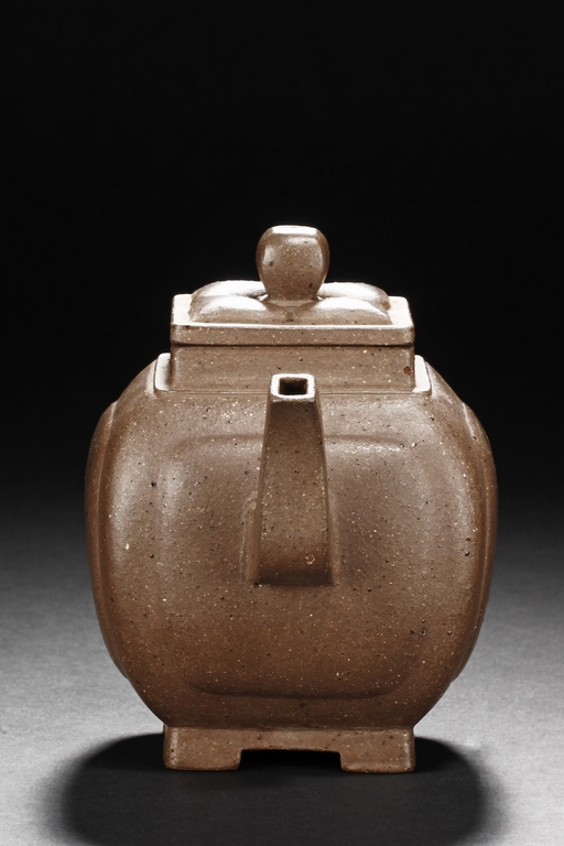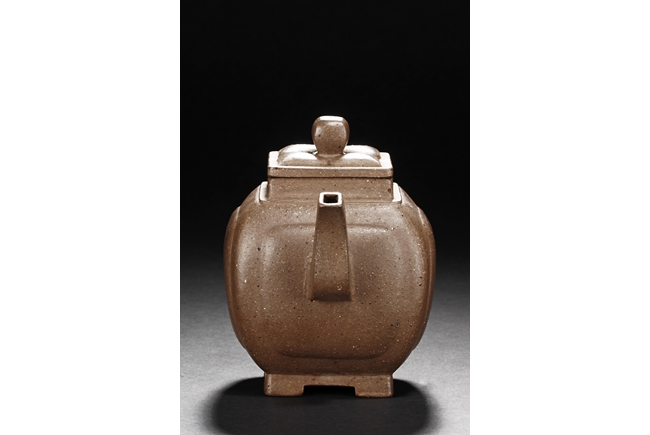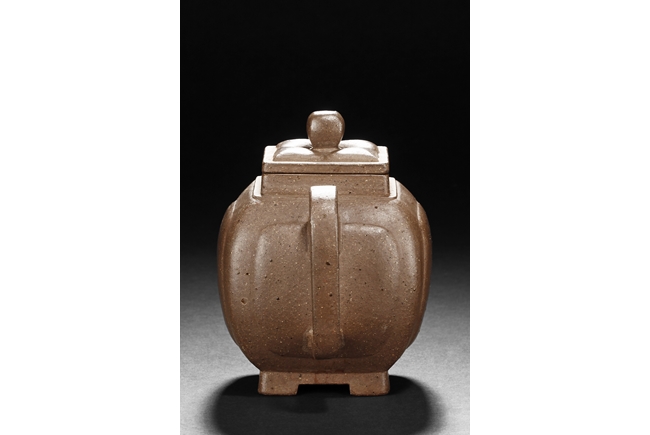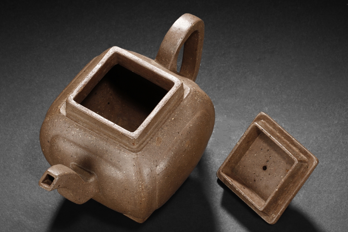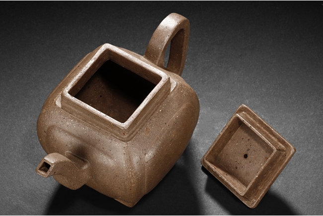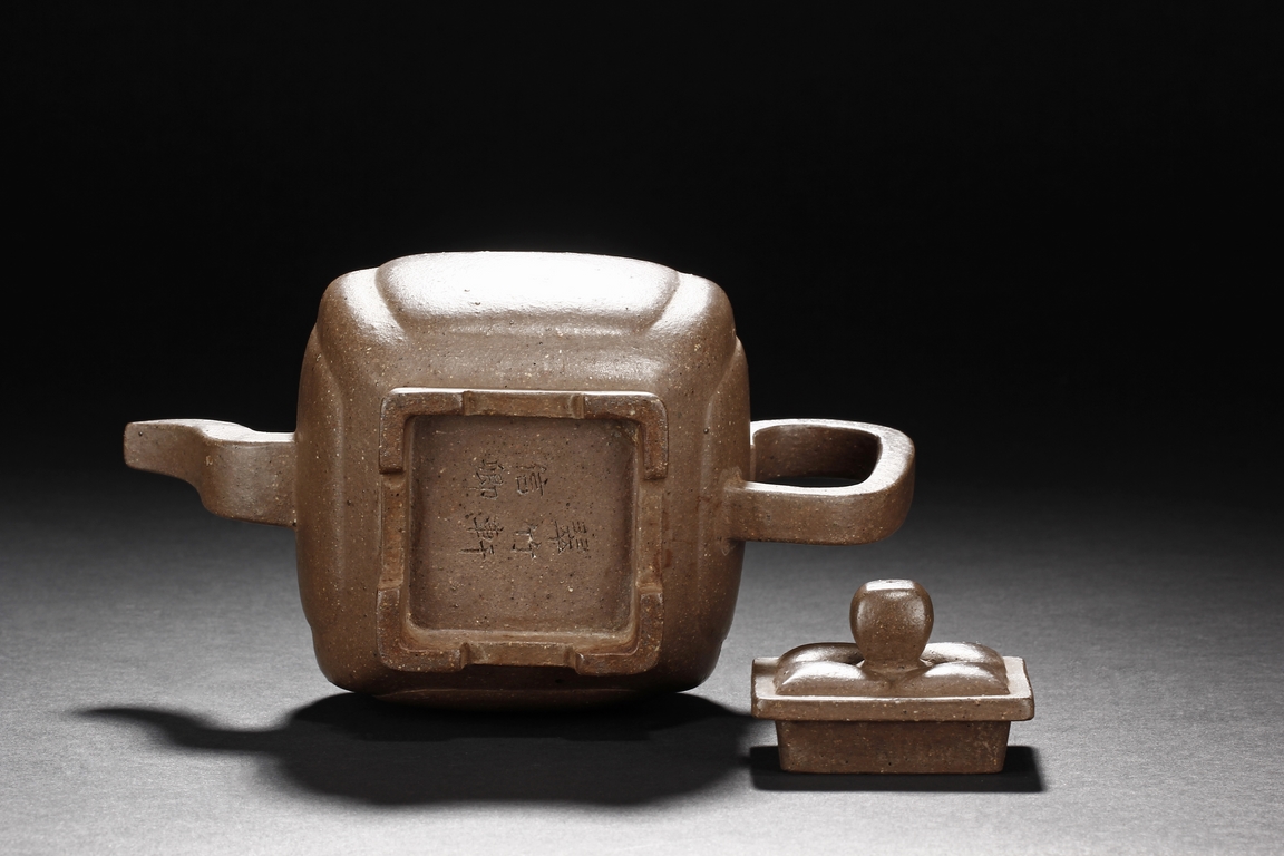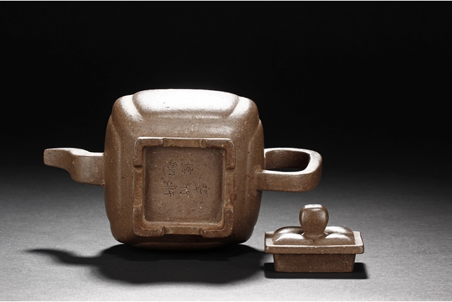 此壺用料精細,壺身發出黯然之光,壺身成型採用了鑲身桶之工藝,由於每一面均外鼓,其工藝難度遠高於平面的四方器,而在銜接初轉折形成倭角,其工藝難度更是達到了極致。壺嘴呈四方三彎流,亦帶倭角,壺把成圓角方形,方頸,方蓋,蓋面飾以四瓣葵花形,環飾壺鈕,亦為四方倭角型,底落款翠竹軒信卿。
