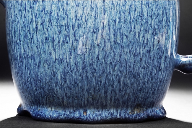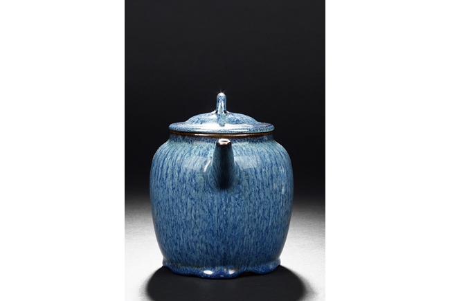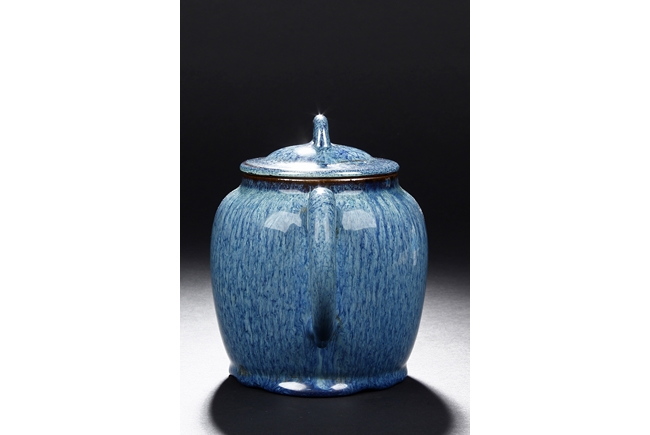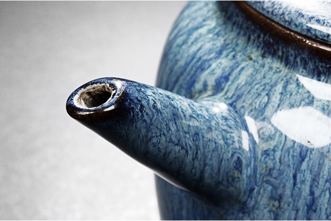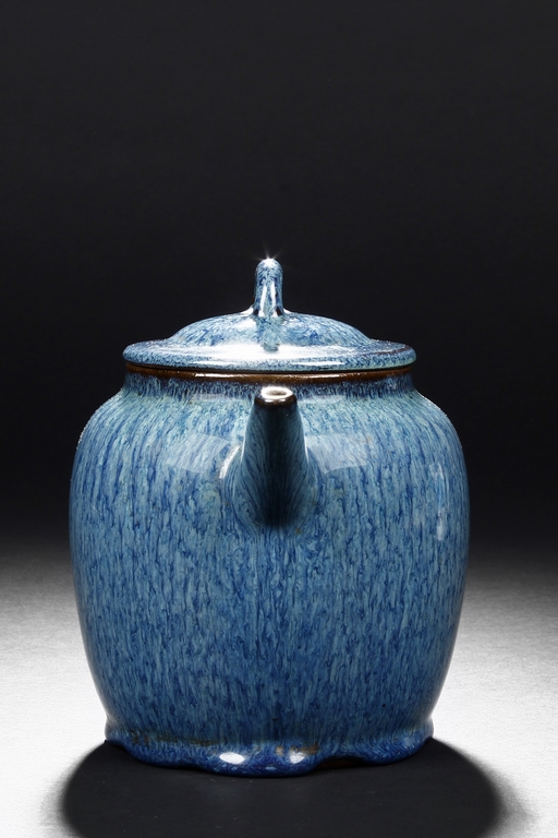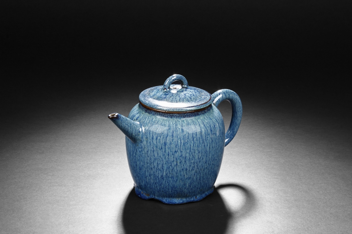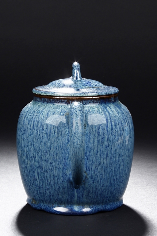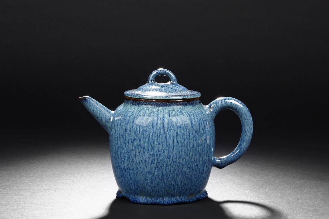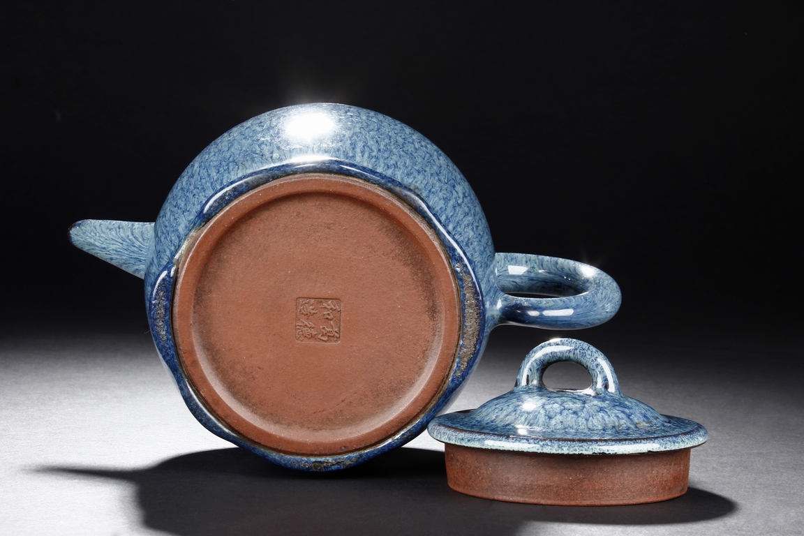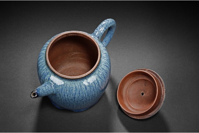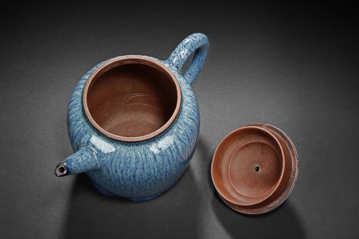 Of bulbous form, the teapot's body with robin's egg glaze, the interior remains unglazed, the bottom bears four character mark "Ge De He Zao".