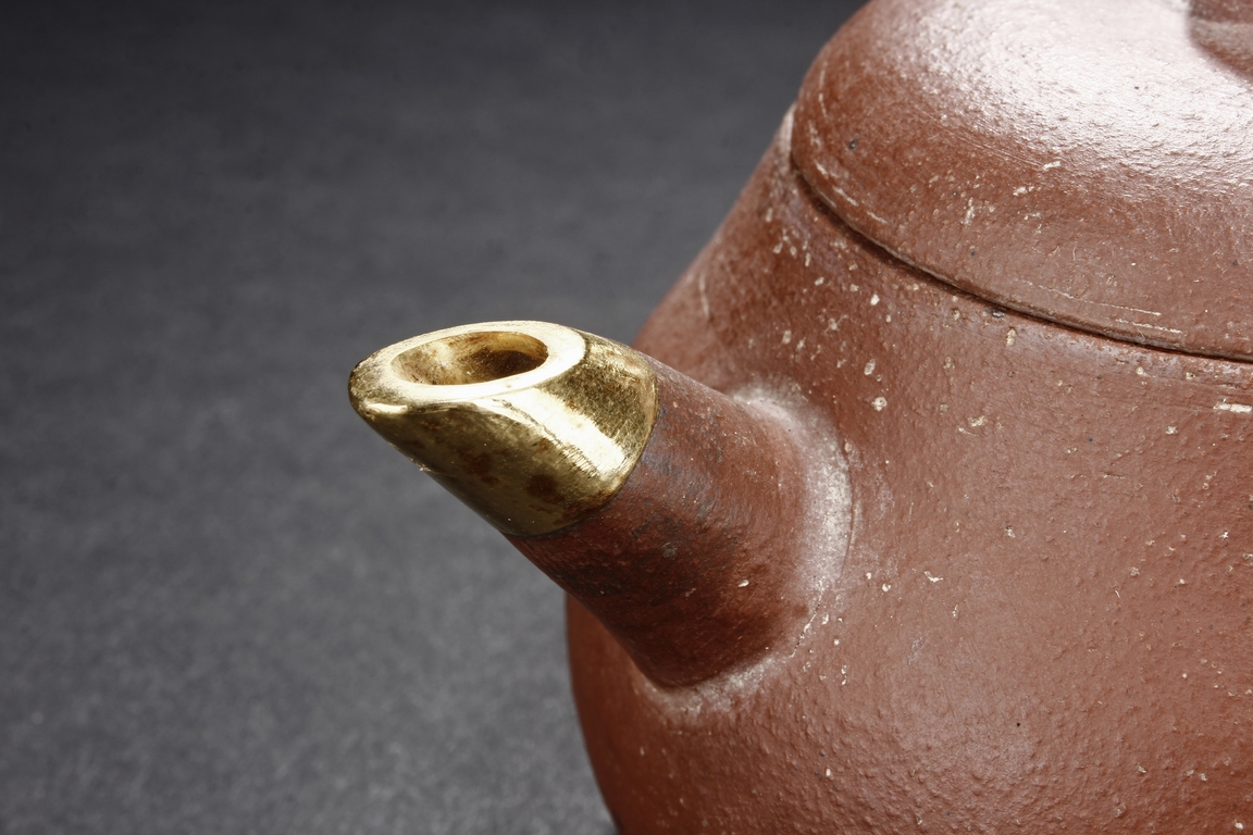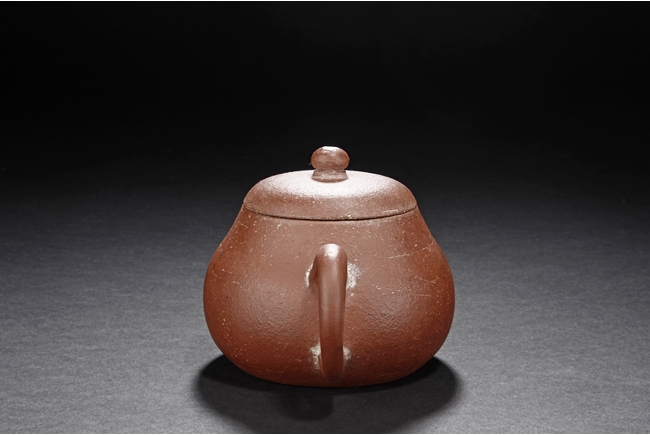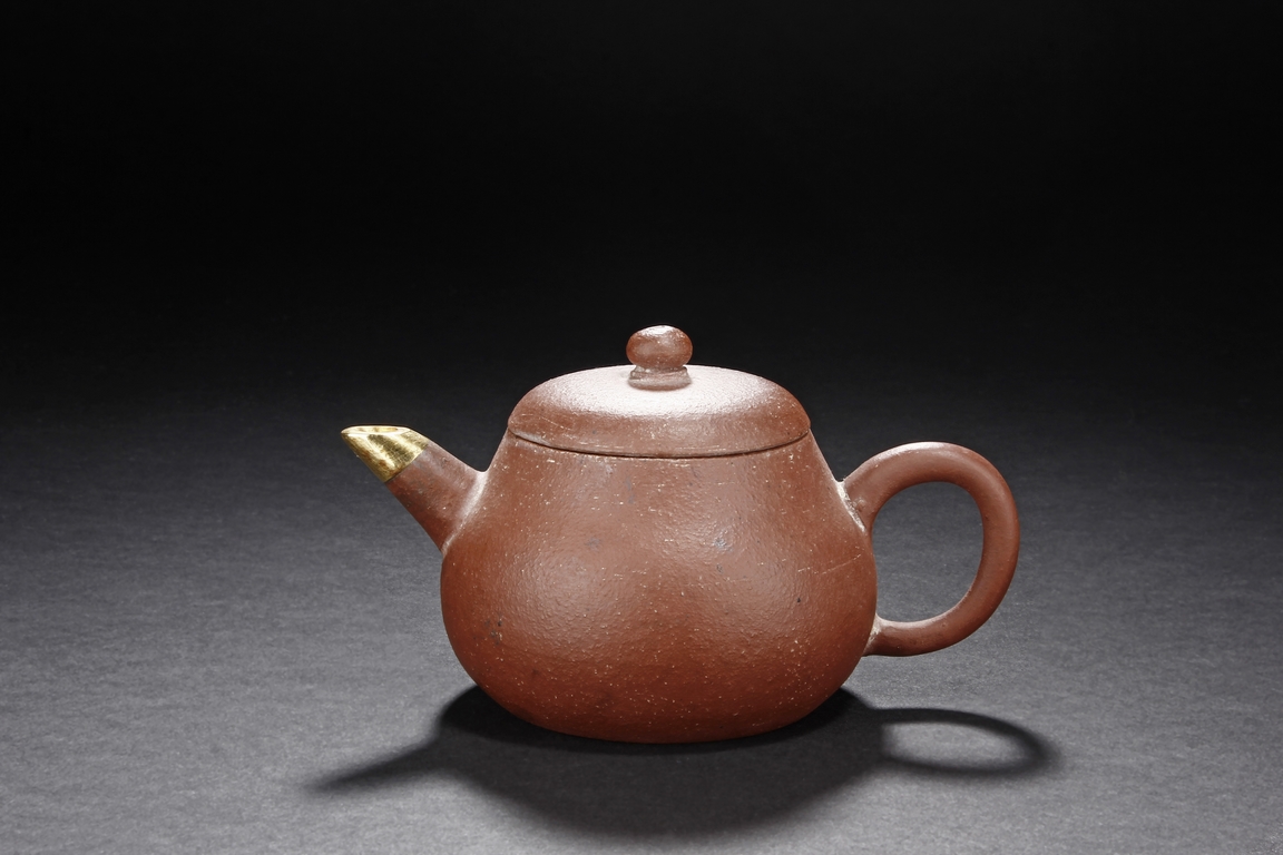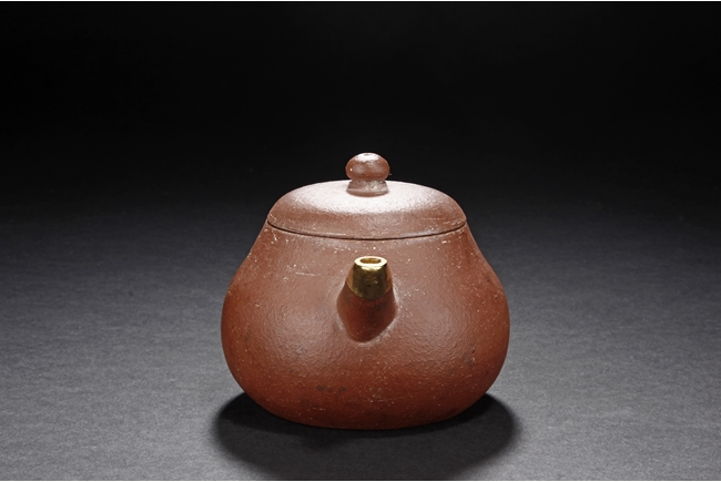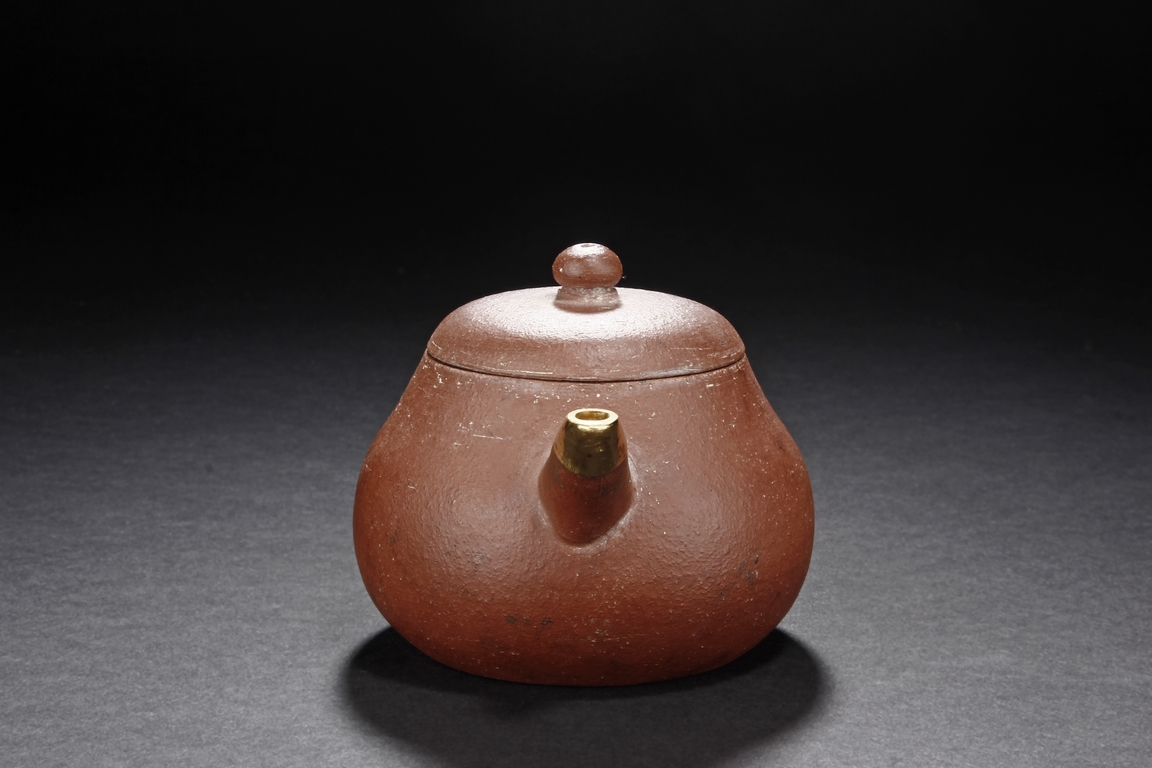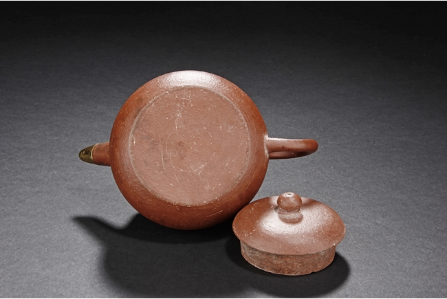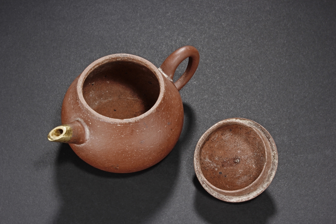 The teapot is of pear form, with ear shaped handle, domed finial, straight spout decorated with brass cover, and the clay was mixed with coarse sand.