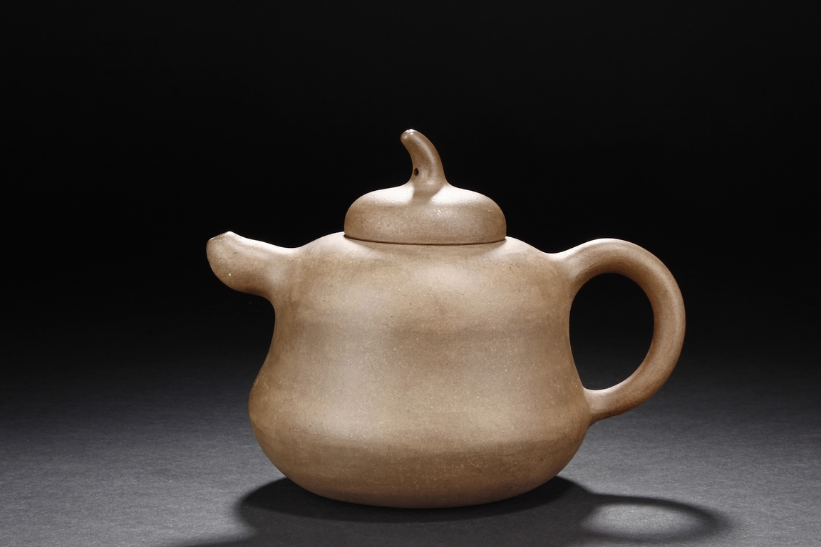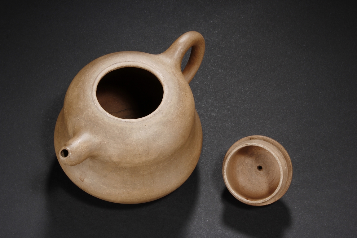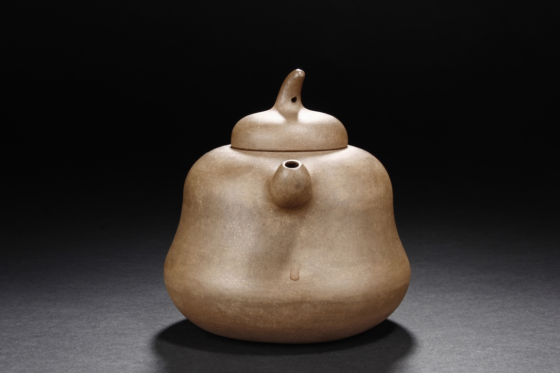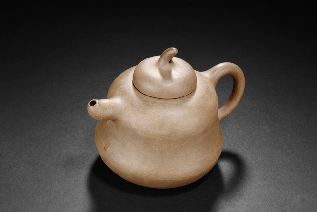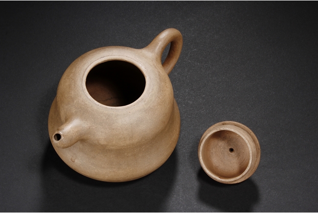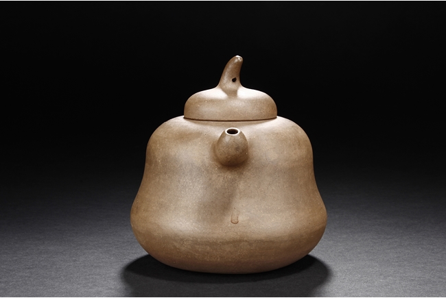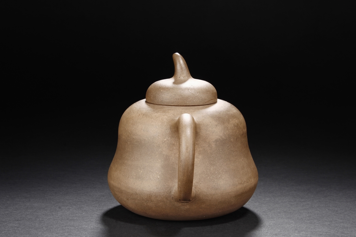 三彎流口,崁入式壺蓋,瓜蒂為鈕,耳型圈把,整體觀之有如一瓜。