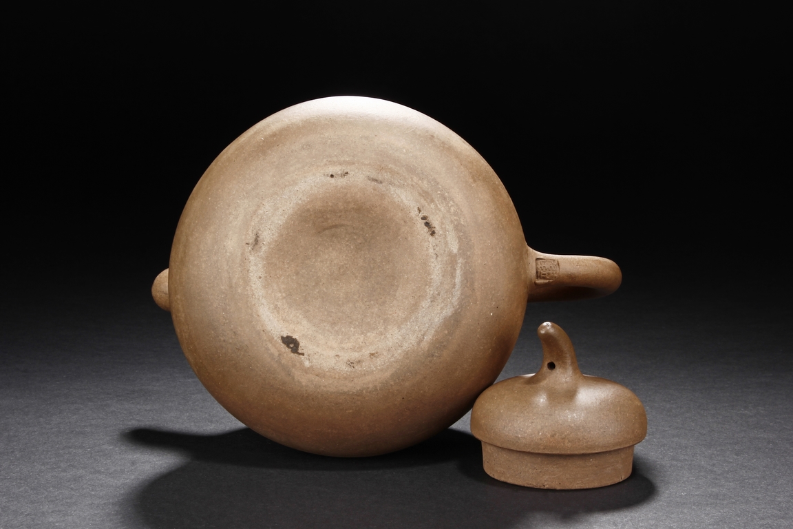 The teapot is of melon form, the finial shaped like a stalk, leading to a bulbous body, with irregular and round spout, and round handles, made from Duan clay, two character mark "Da Peng" below the handle.