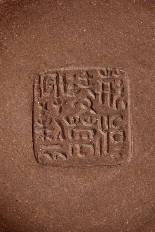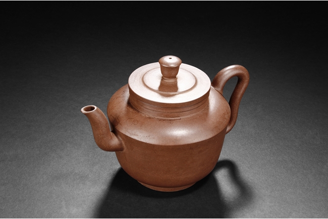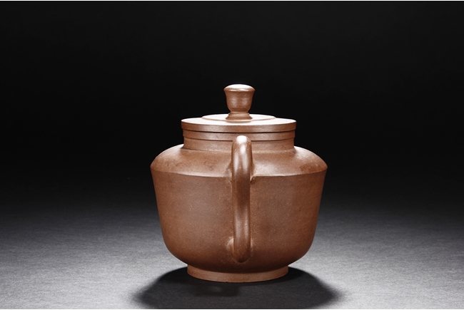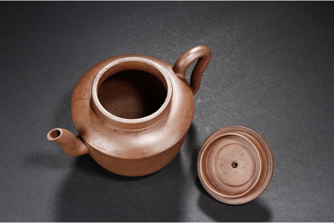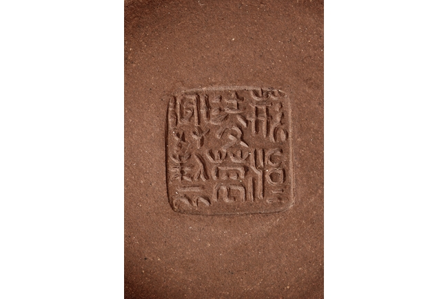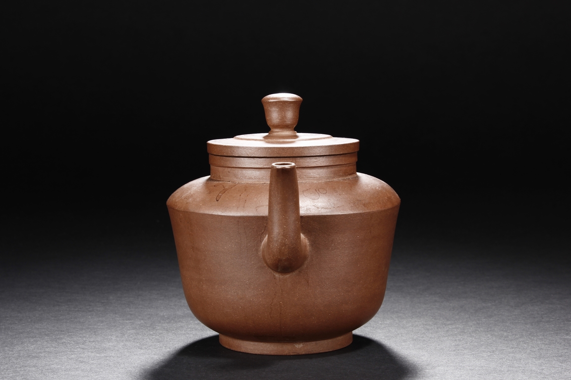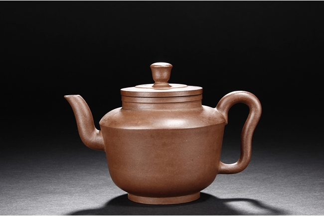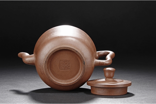 三彎流,束頸,斂底,耳型執把,底刻有荊溪凌萬興製方章。凌萬興為清雍正至乾隆時期中製壺高手。
