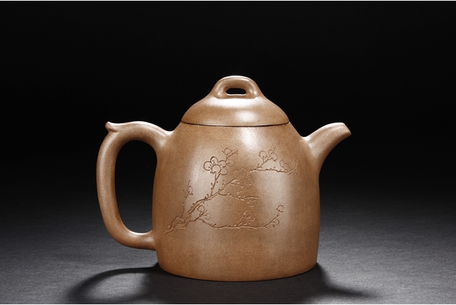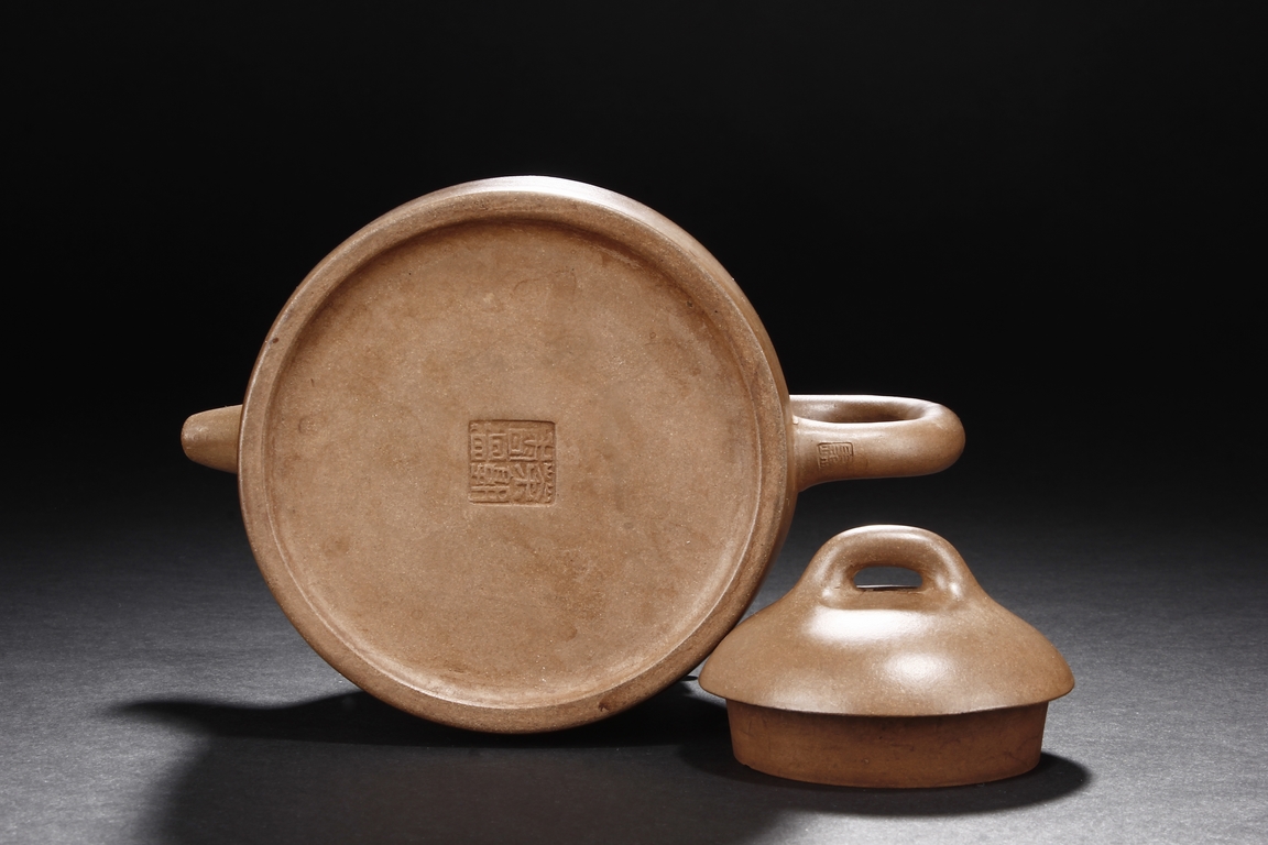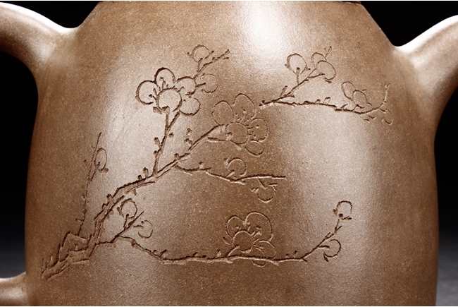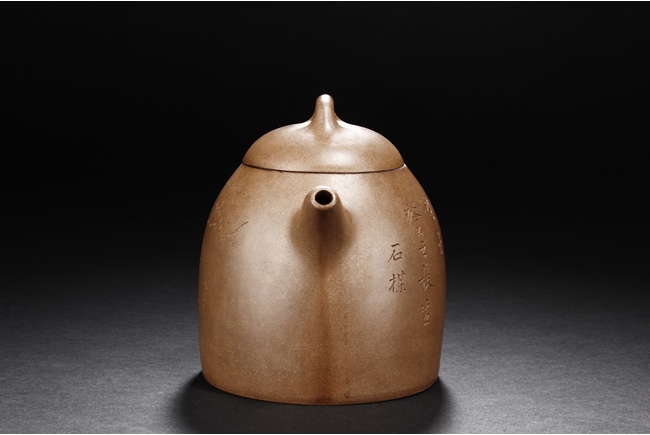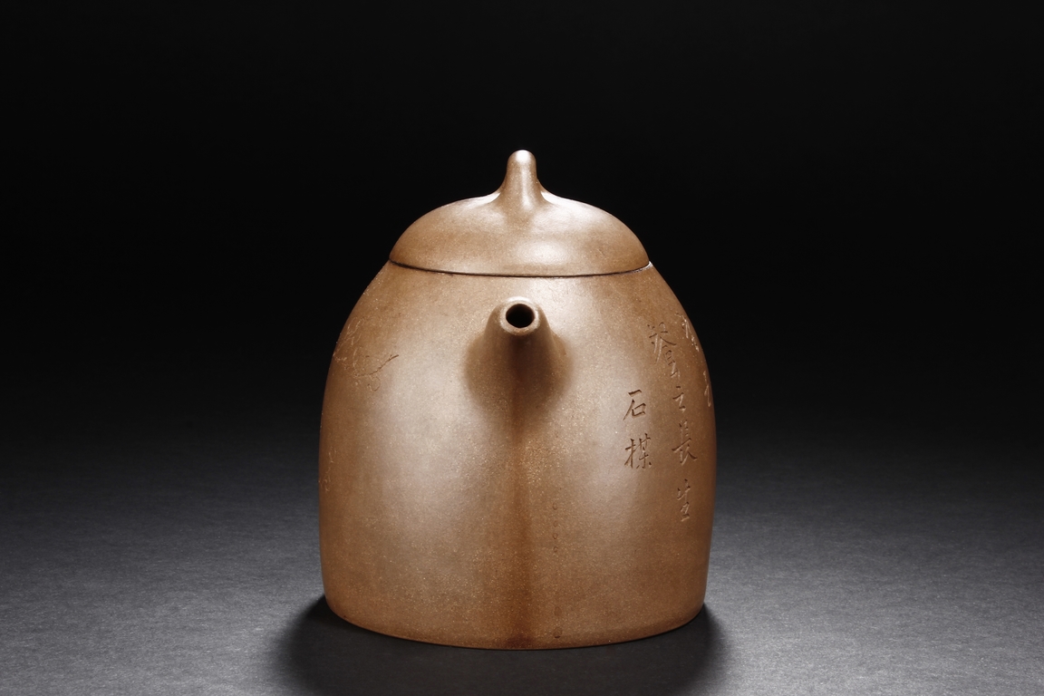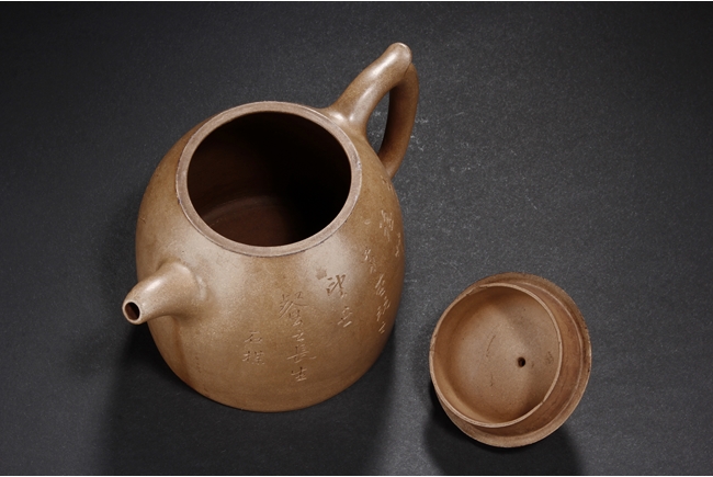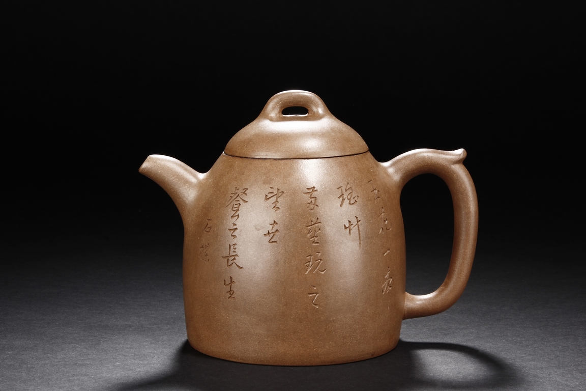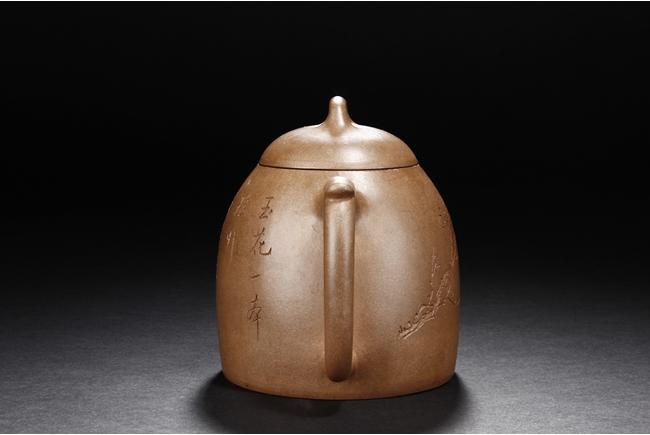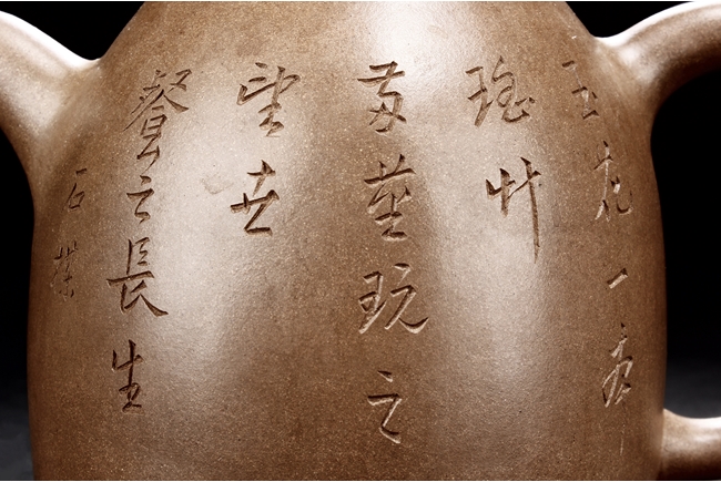 The teapot shaped similar to a Chinese weight balance, starting from the bridge-shaped finial and expanding to the full body, one side incised with blossoming flowers and branches, the reverse with poetry calligraphy by Shi Die, the bottom with four character mark, additional two character artist mark "Shen Xi" beneath handle.