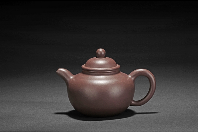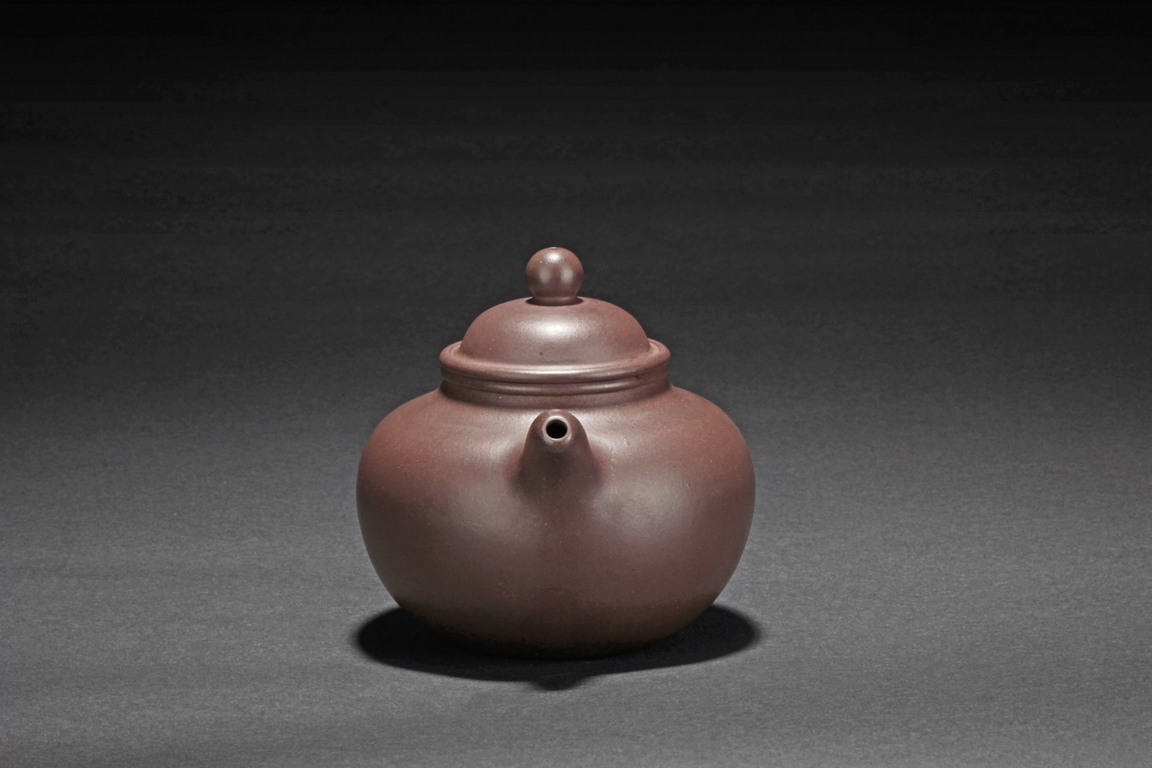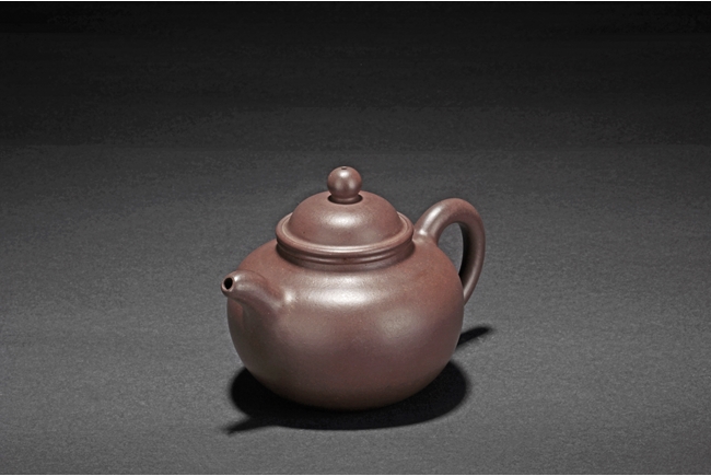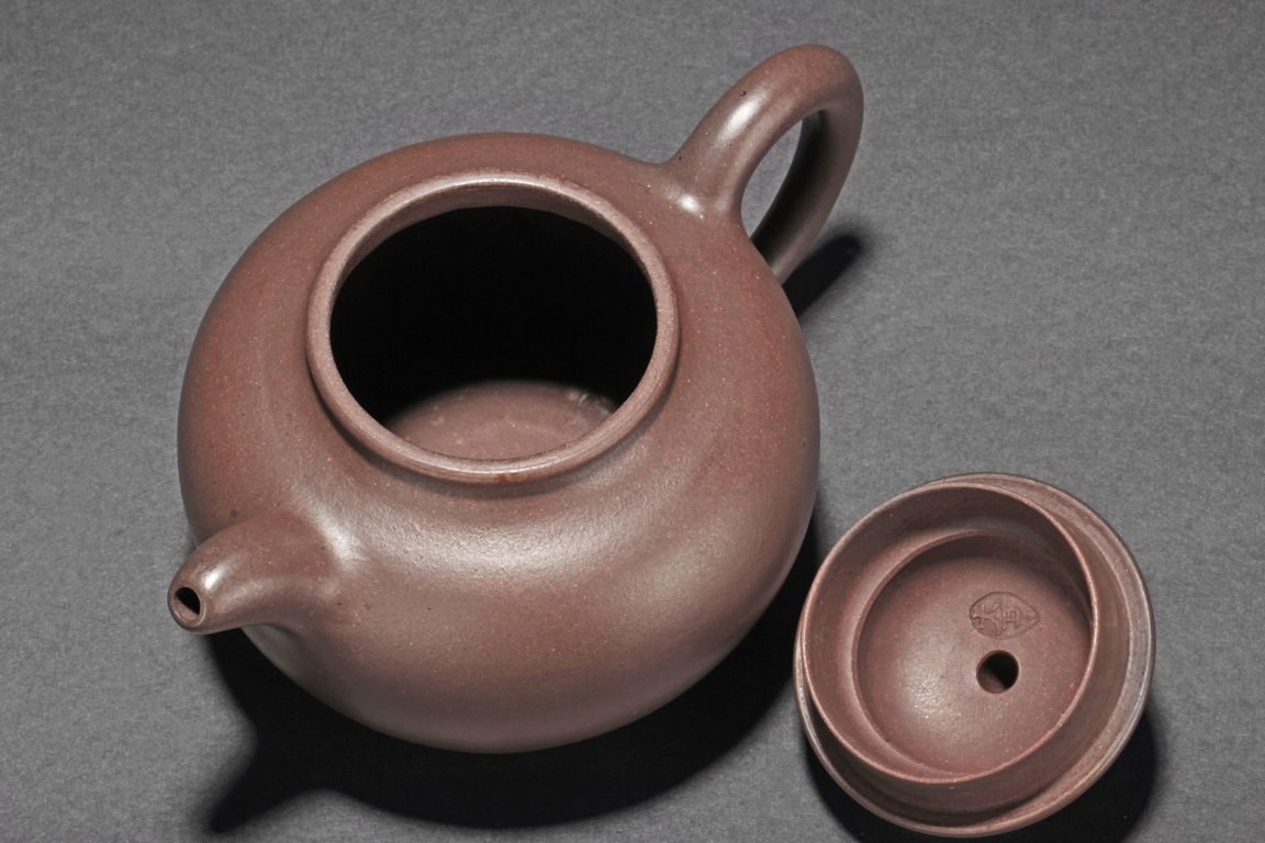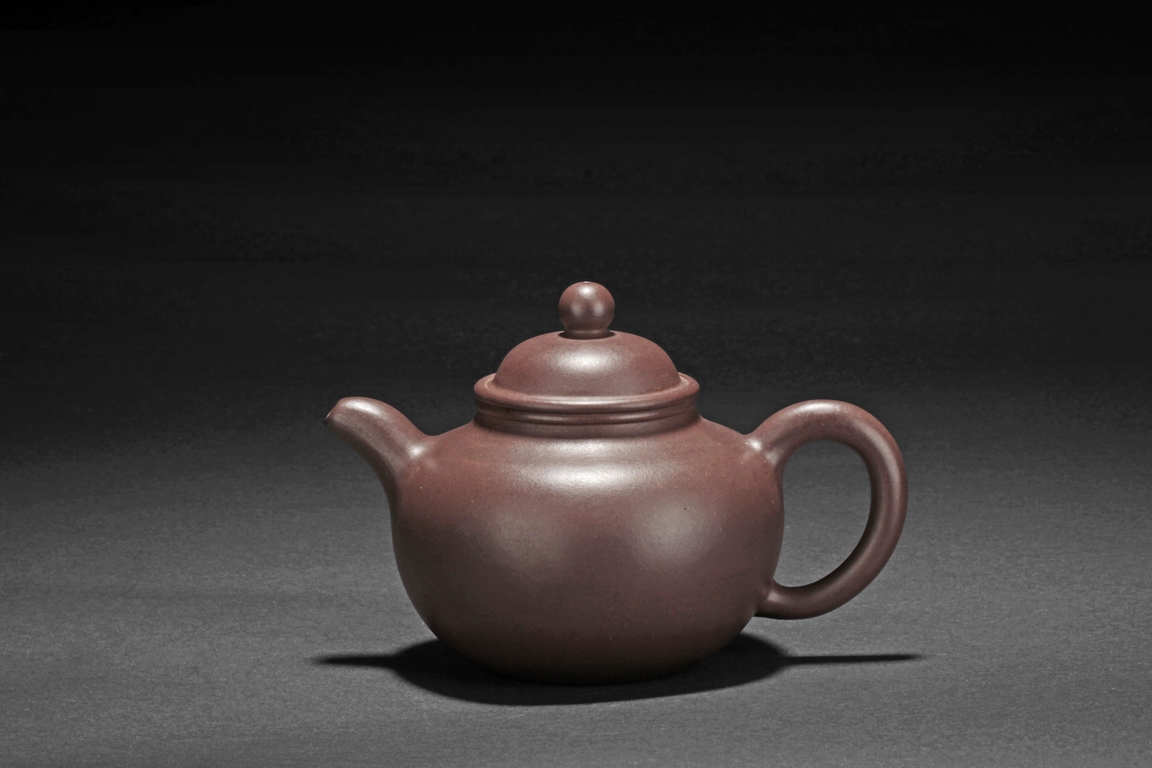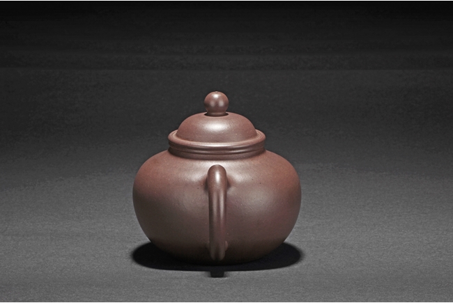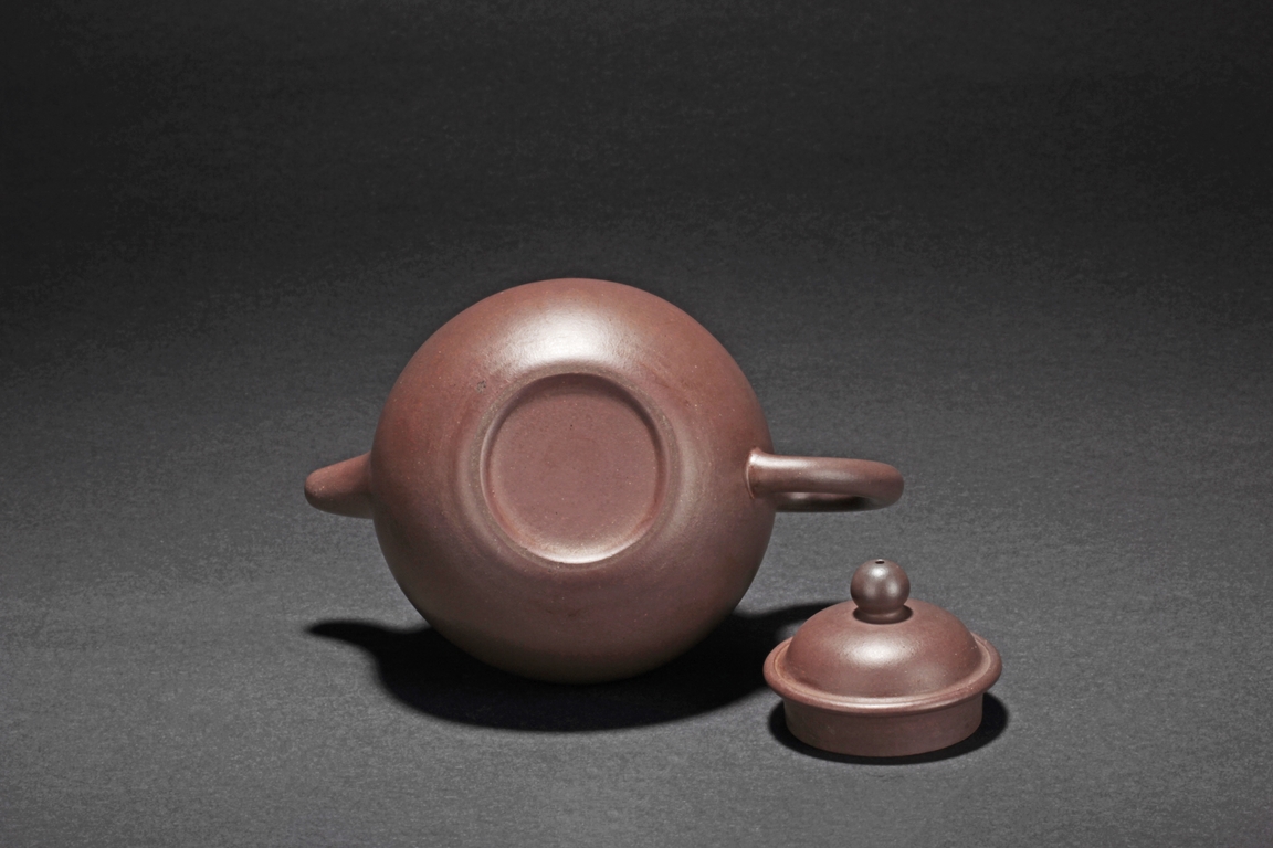 The teapot overall shape of three balls stacked together, from large body to medium lid and small finial, the uncarved smooth body of deep purple-brown color, and a two character "Da Heng" artist mark beneath the lid.