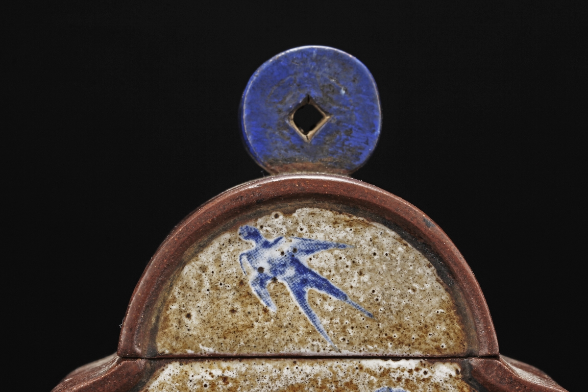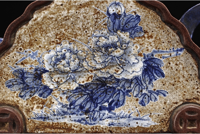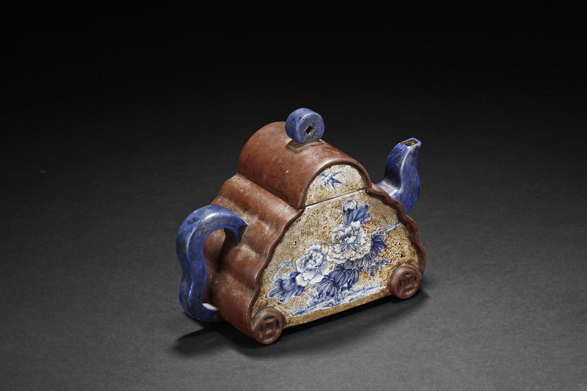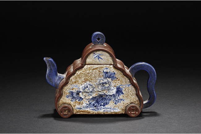 The body of teapot shaped in the form of a mountain, with layered sides, both sides painted in blue and white with peony flowers and swallows, the handle, spout, and finial painted in blue, and bottom bears six character "DAQING QIANLONG NIANZHI" mark.