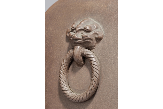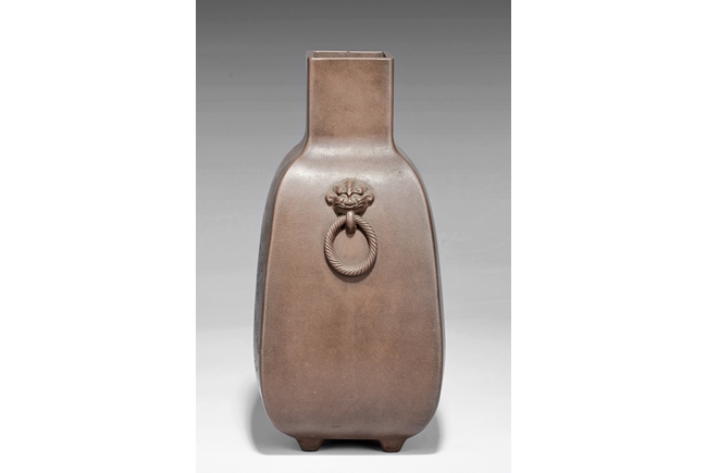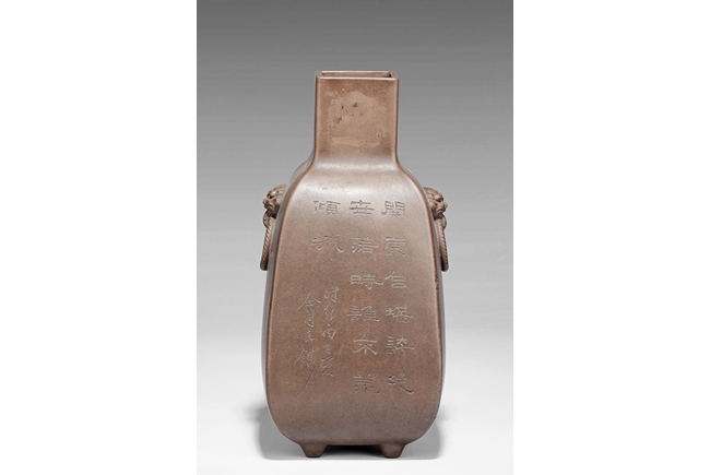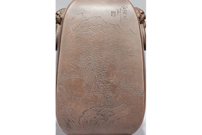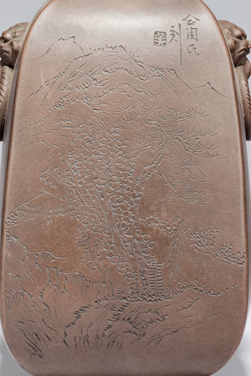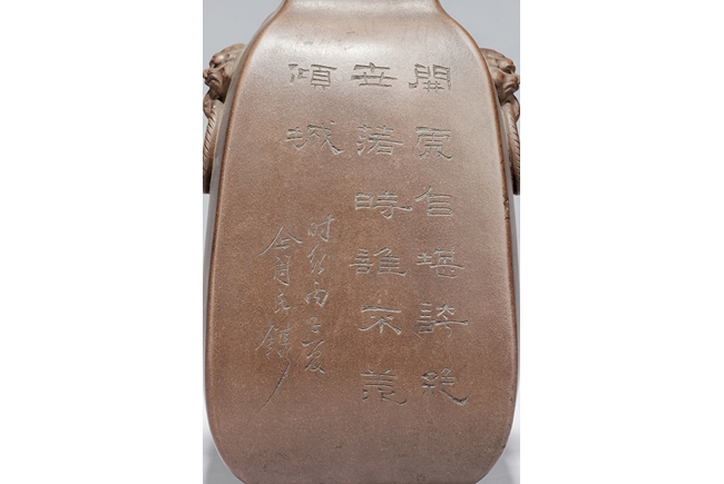此瓶斂口,四足,雙獸耳叼環,一邊刻有詩文,一邊刻畫有"山中有人家",刻款 "佰仙監製"。