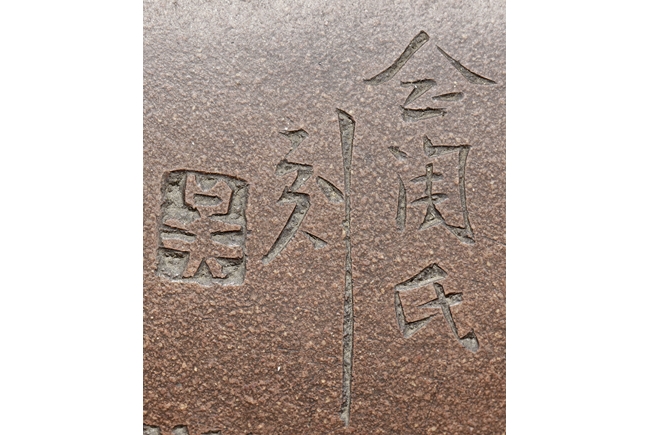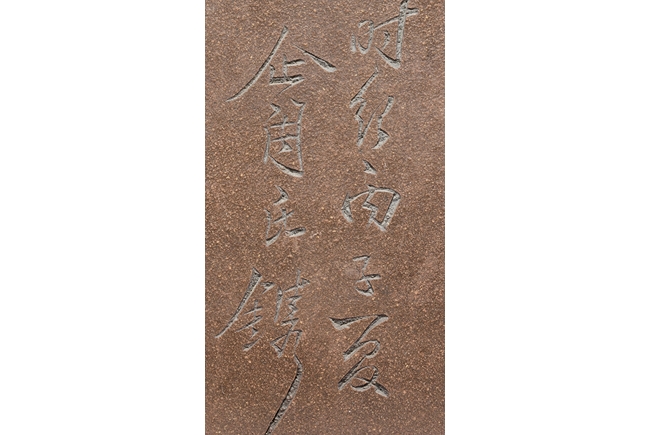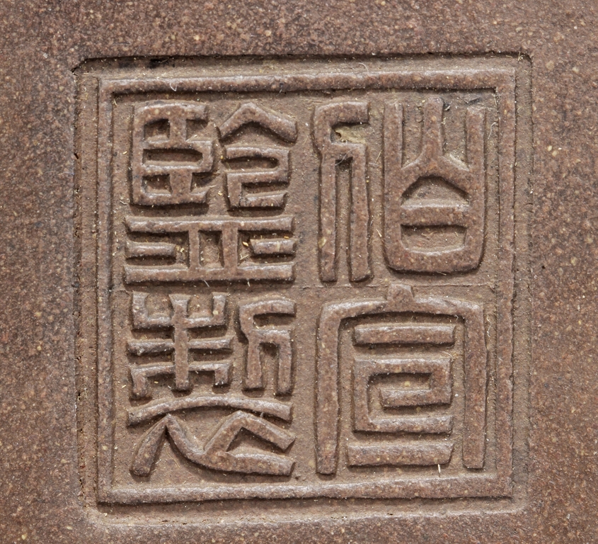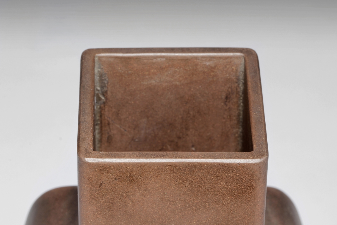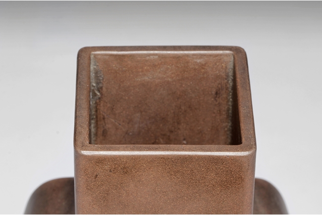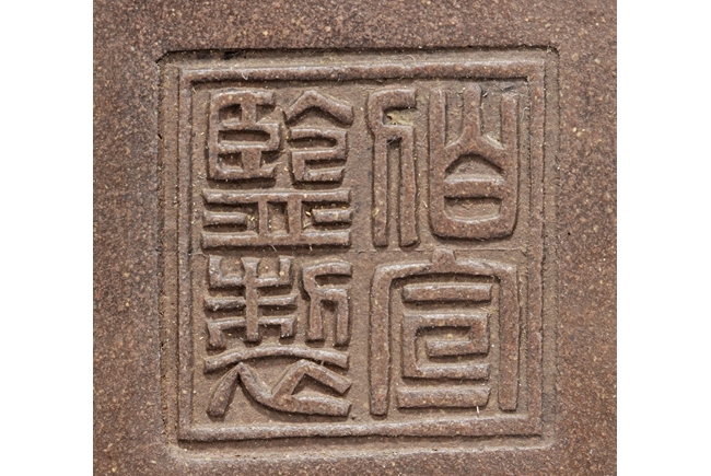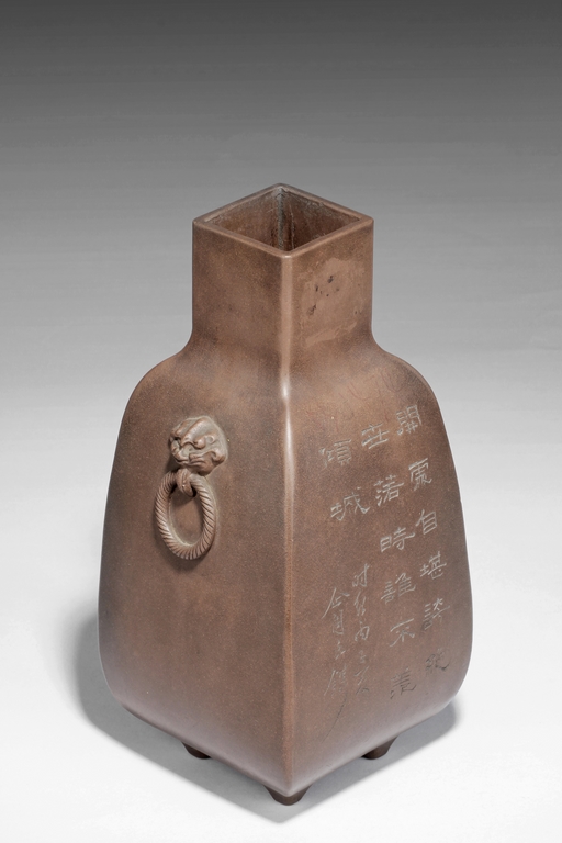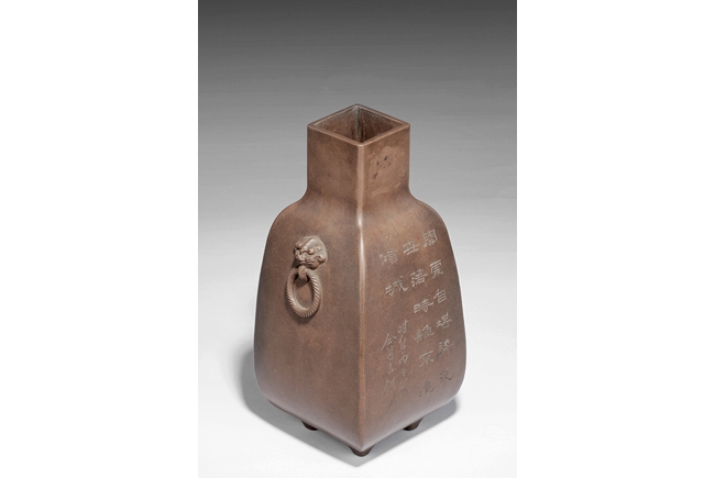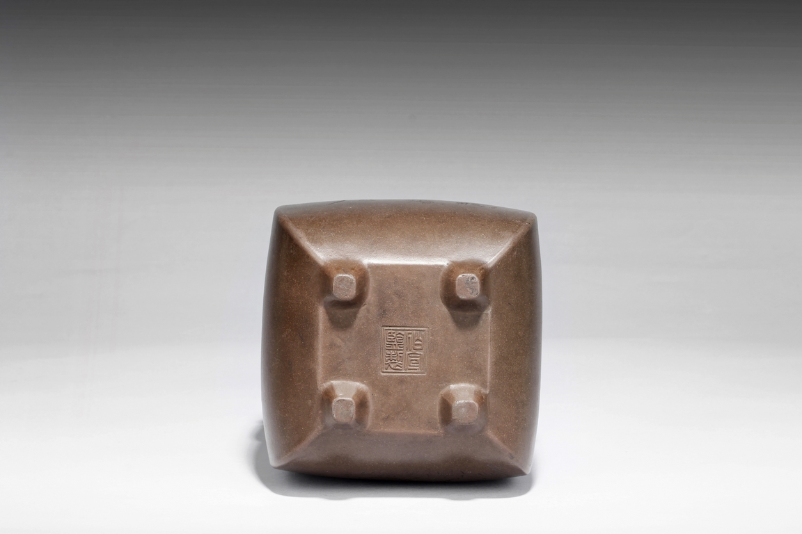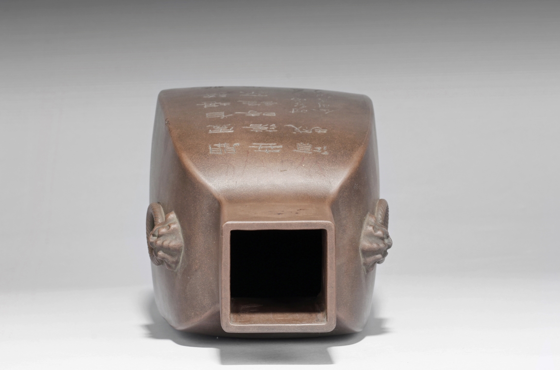 Of rounded rectangular form, the body stands on four small foot, the body carved with Chinese poem and a mountain scene, with a pair beast masks and loop ring handles on the side. Artist signature and mark "Qi Taoshi" on the body, additional mark "Bai Xian Jian Zhi" on the bottom. Late Qing Dynasty or early Republic period