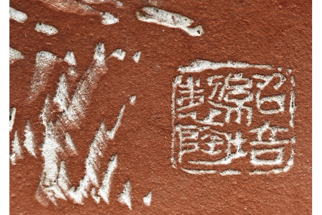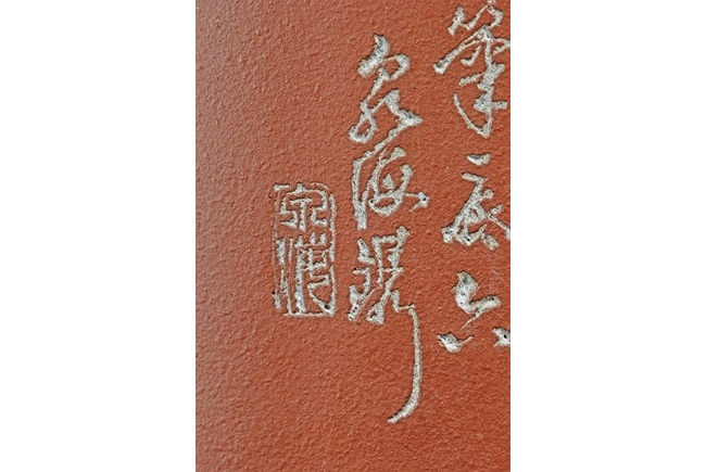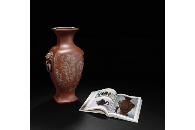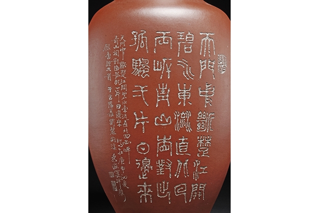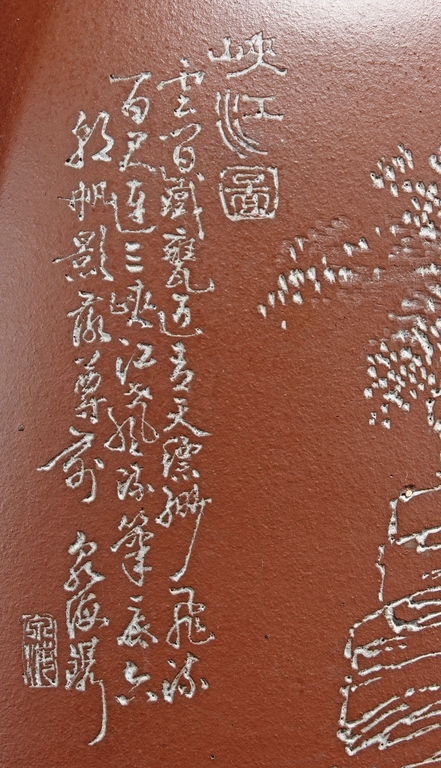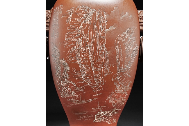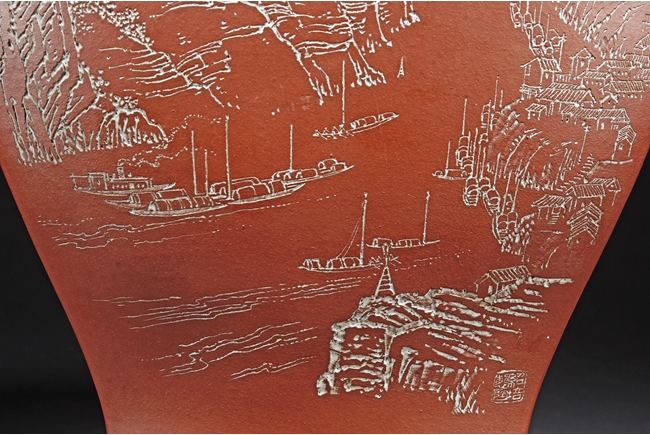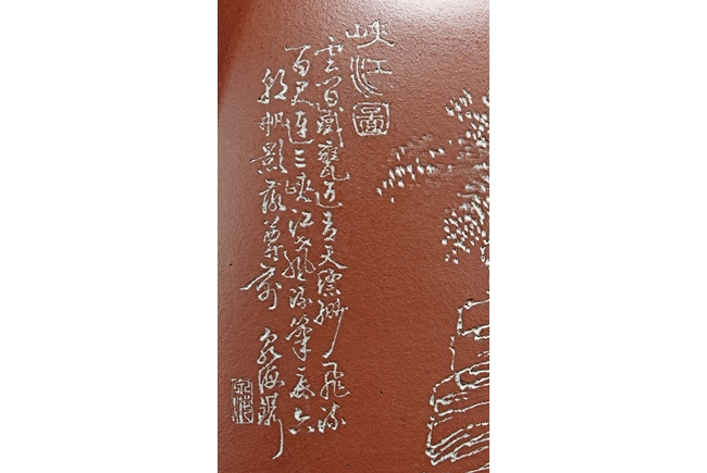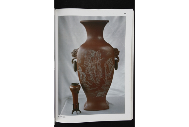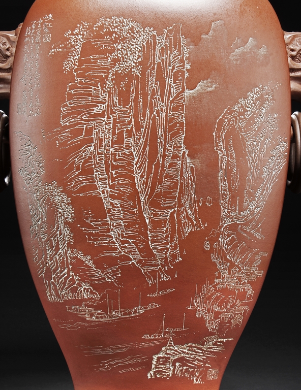 此瓶胎質堅緻,線條優美,環鈕流暢,動靜皆宜,峽江圖加上譚泉海鐫刻詩文,氣勢磅礴動人。參考錦鋒公司1985年出版之壺錦第105頁,即為此瓶。