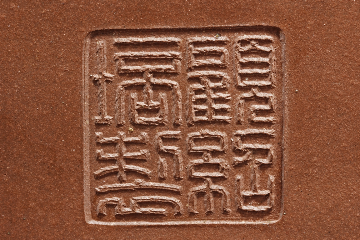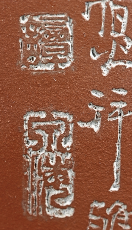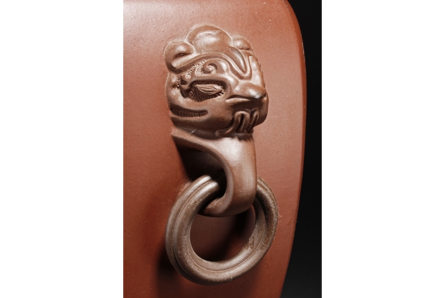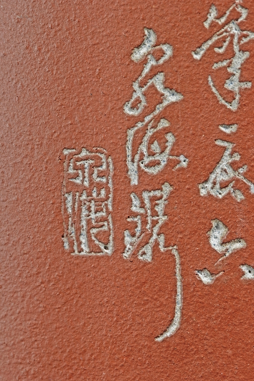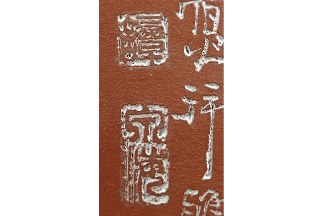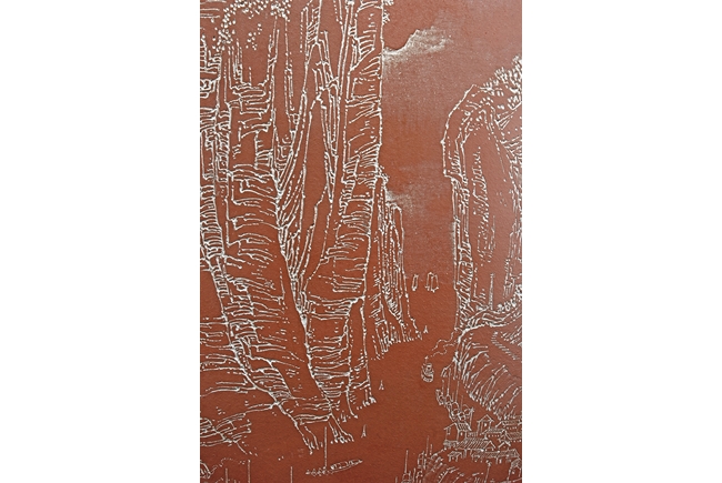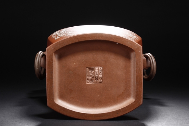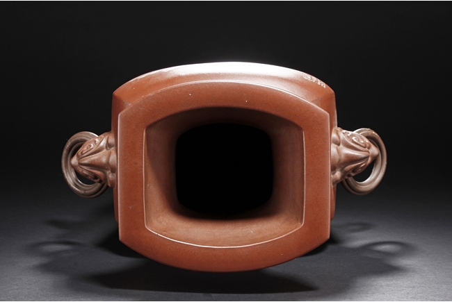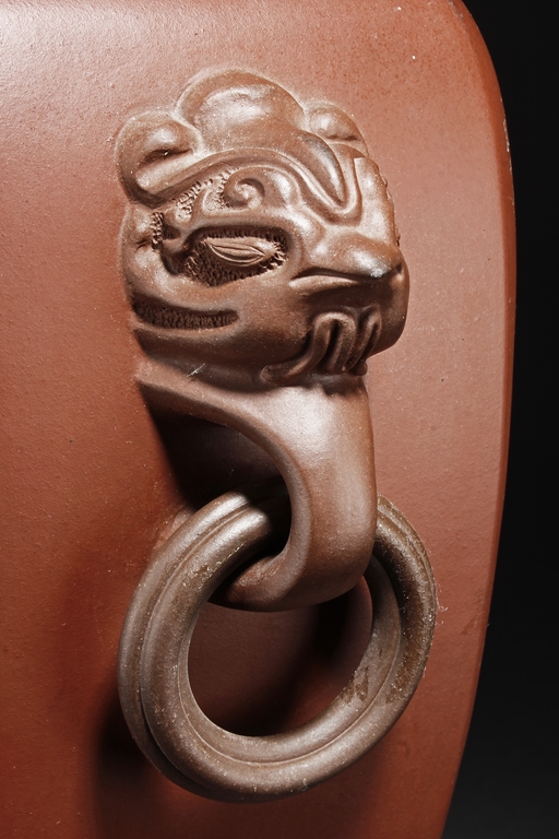此瓶胎質堅緻,線條優美,環鈕流暢,動靜皆宜,峽江圖加上譚泉海鐫刻詩文,氣勢磅礴動人。參考錦鋒公司1985年出版之壺錦第105頁,即為此瓶。