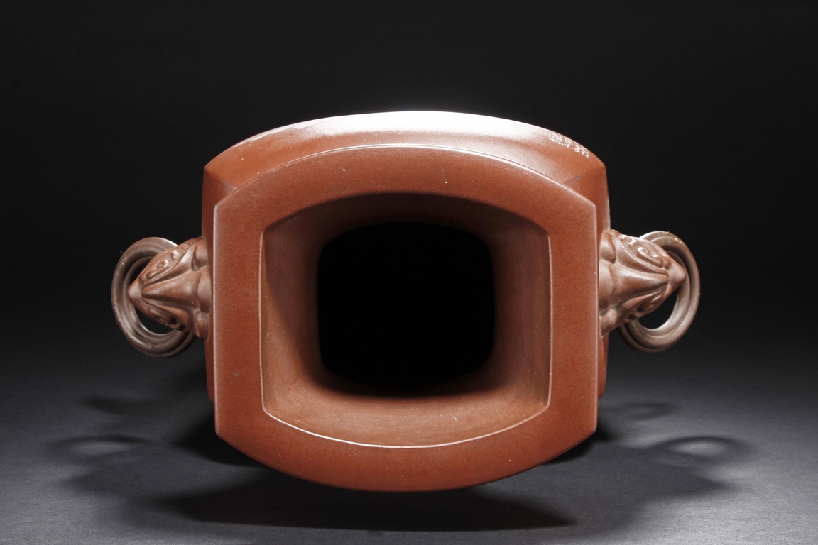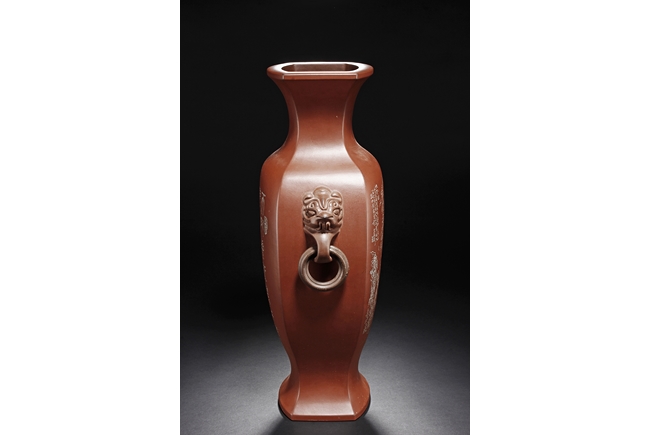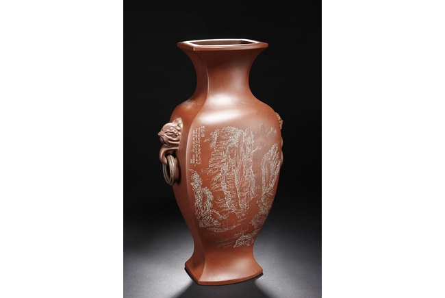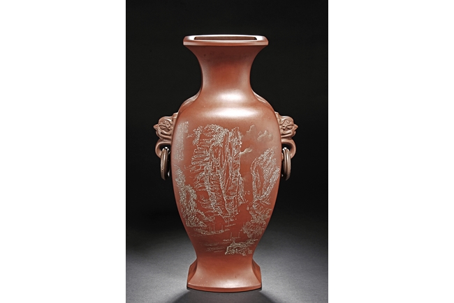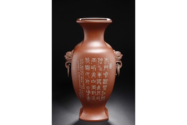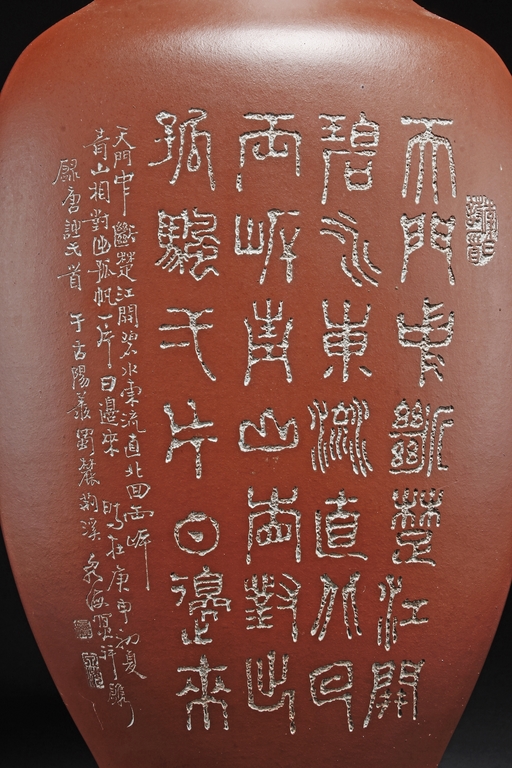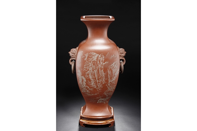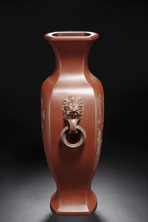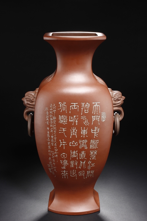 The vase is of angled baluster form, the body incised with river, mountain, and village scenery, the reverse incised with Chinese poetry and colophon written by Tan Qunhai, the sides attached with mythical lion handle and looped rings, and the bottom with four character mark "Gu Shaopei".