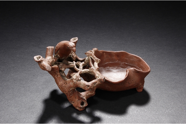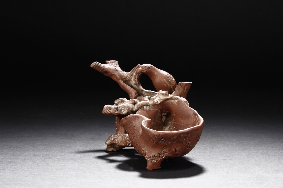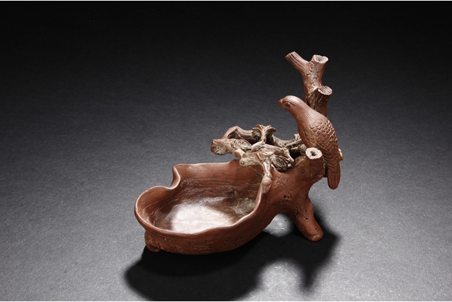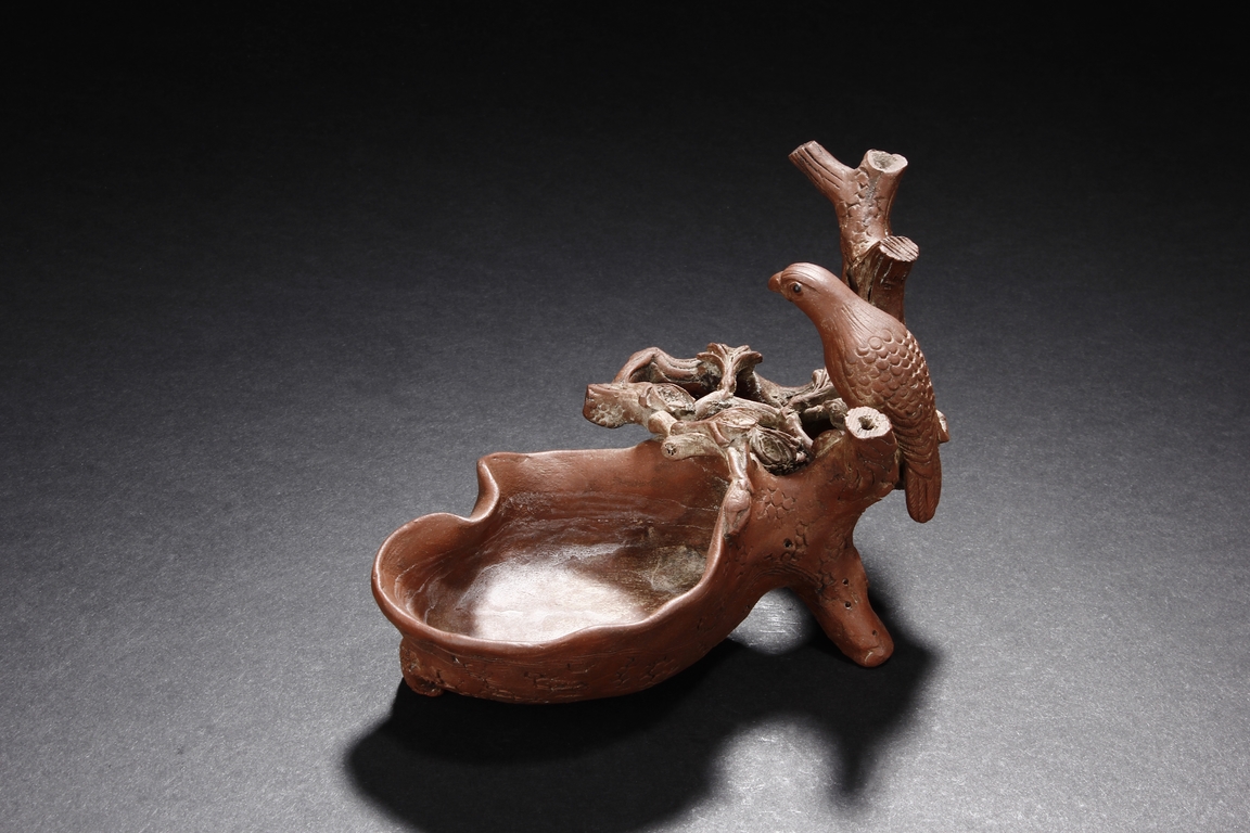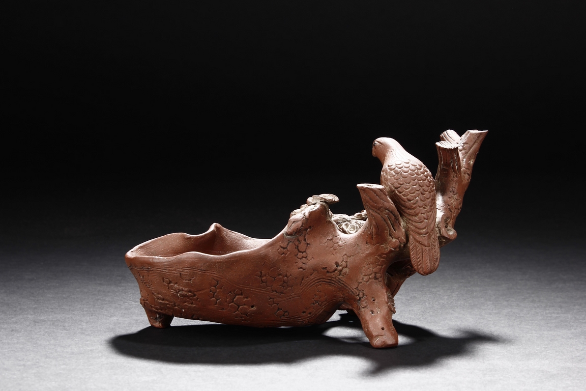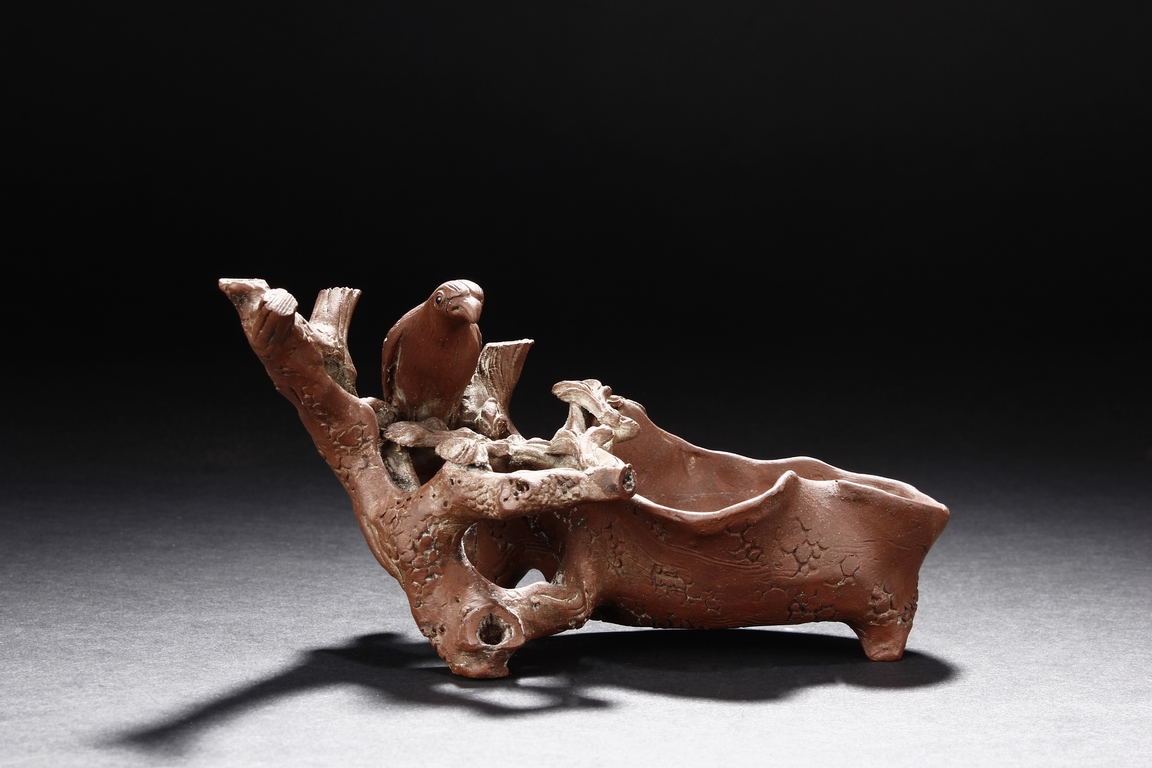 The Yixing stoneware works both as a brush washer and a brush rest, depicting a magpie bird perched on tree branches, next to a hollow tree trunk. Artist mark on the side. Republic period.