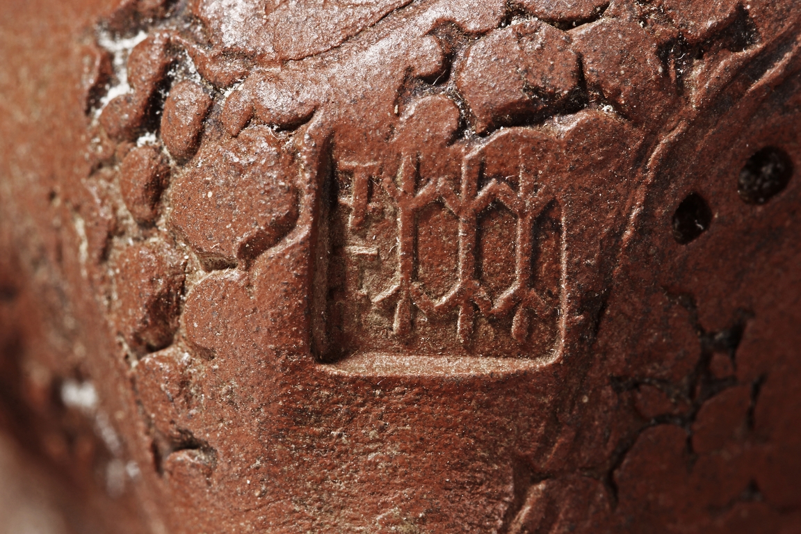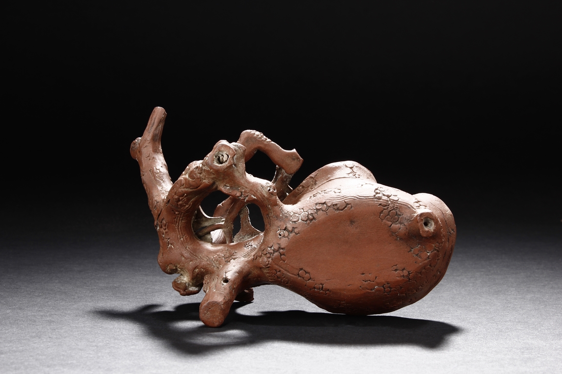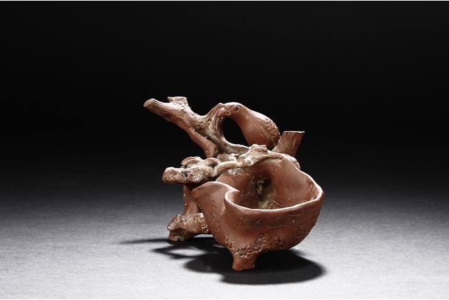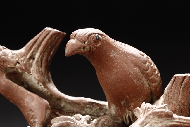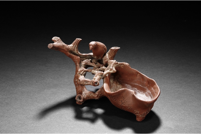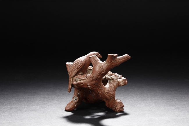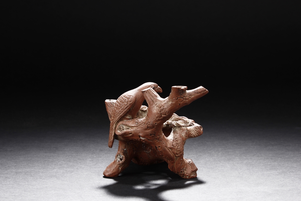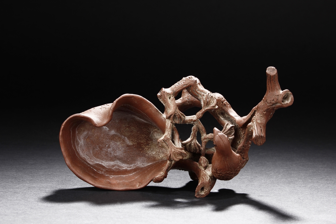 The Yixing stoneware works both as a brush washer and a brush rest, depicting a magpie bird perched on tree branches, next to a hollow tree trunk. Artist mark on the side. Republic period.