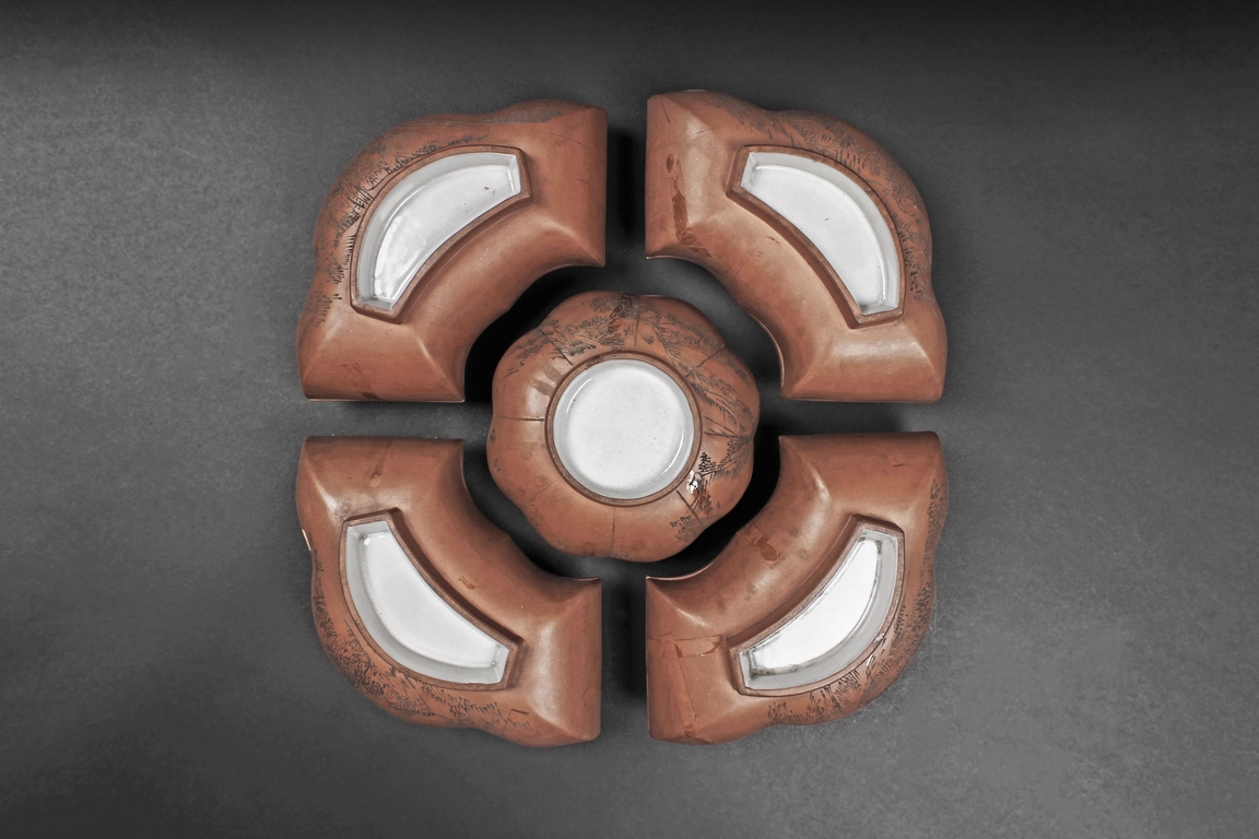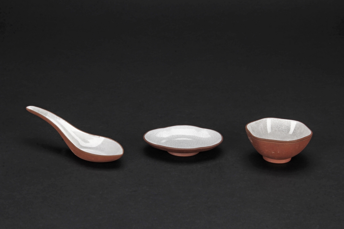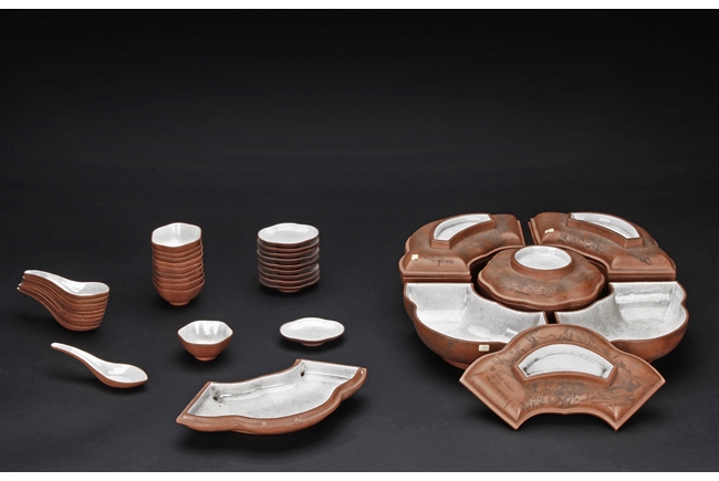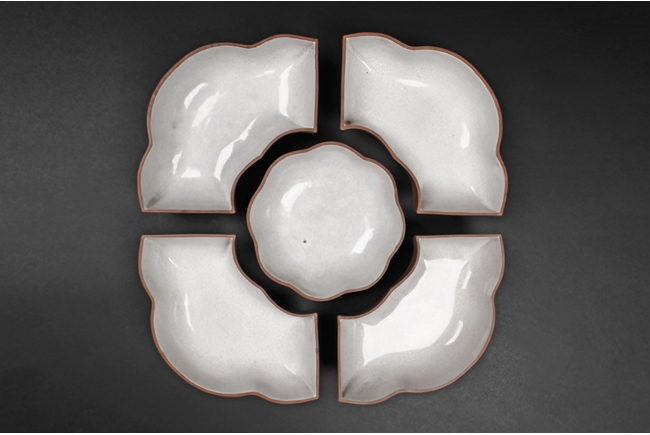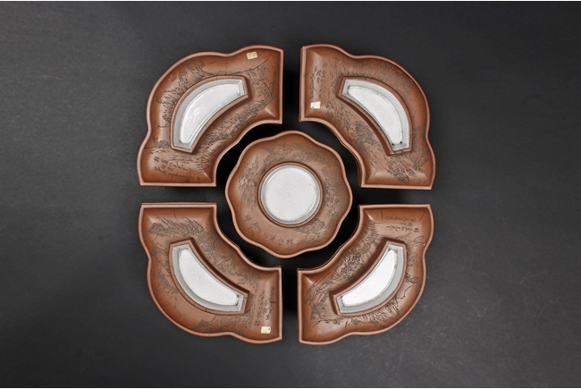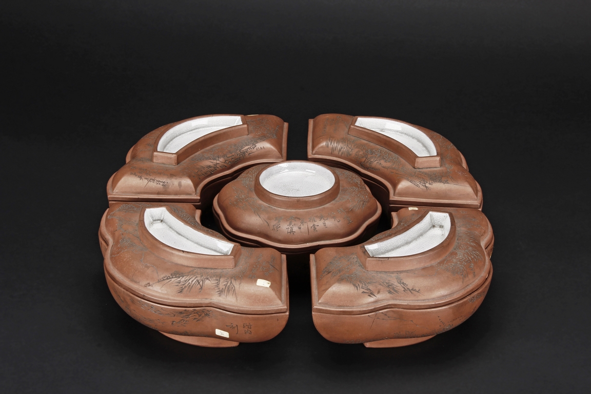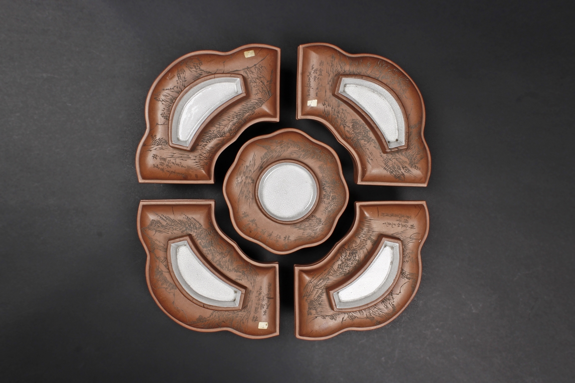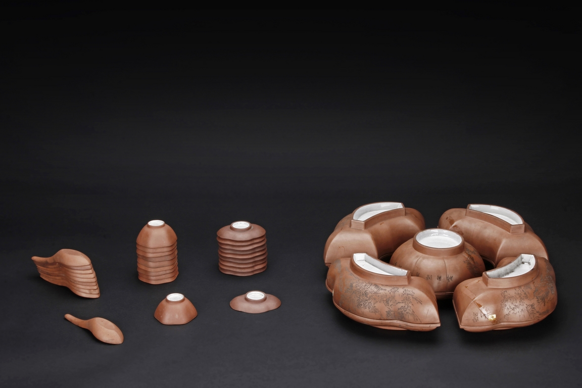 本餐具組共分為十個湯匙,十個碗,十個碟,四組蓋碗,圍成一個圓,中間放一葵花形蓋碗,內外全部施釉,并鐫刻山水詩文。民國時期潛陶氏製作。