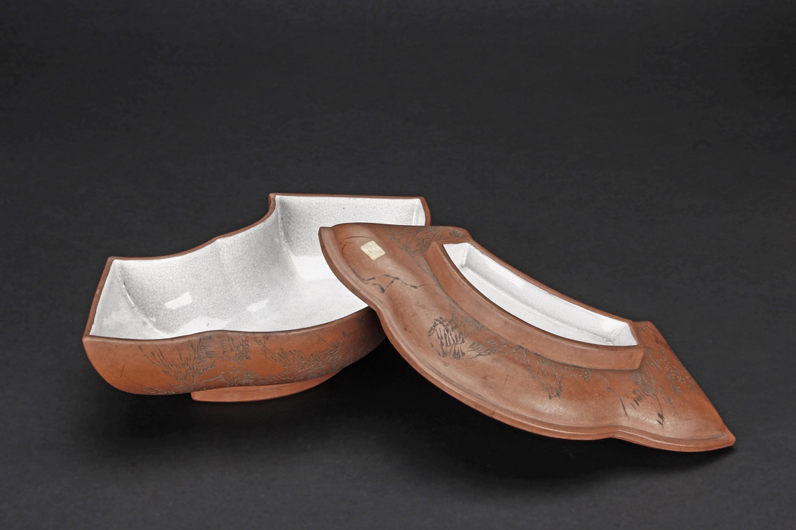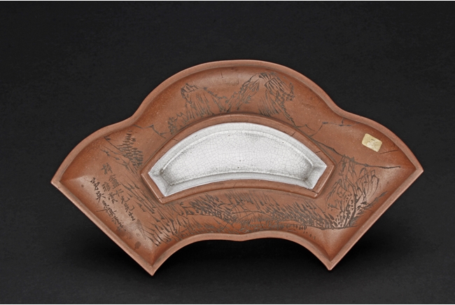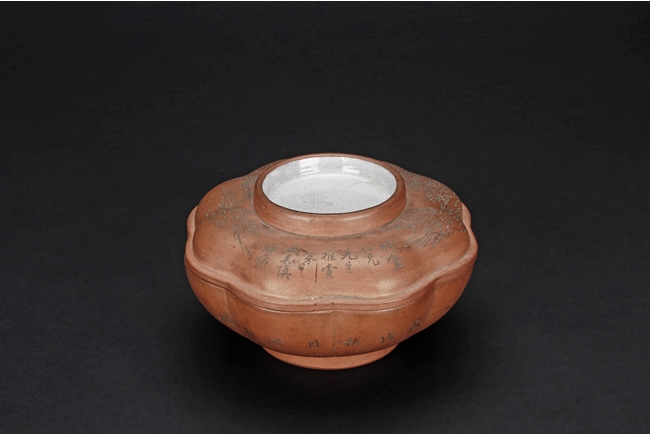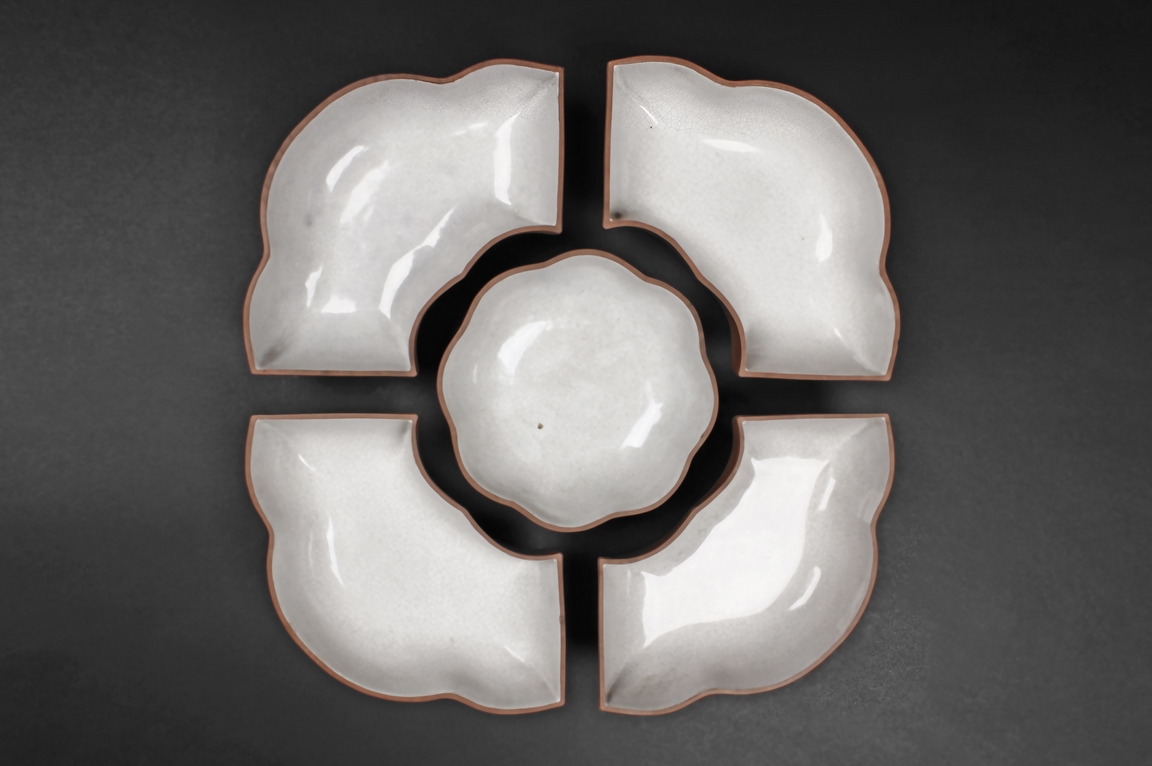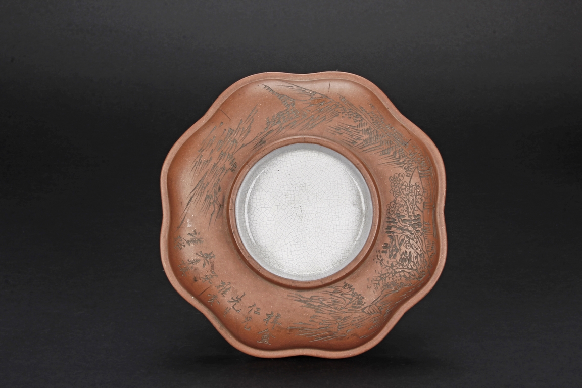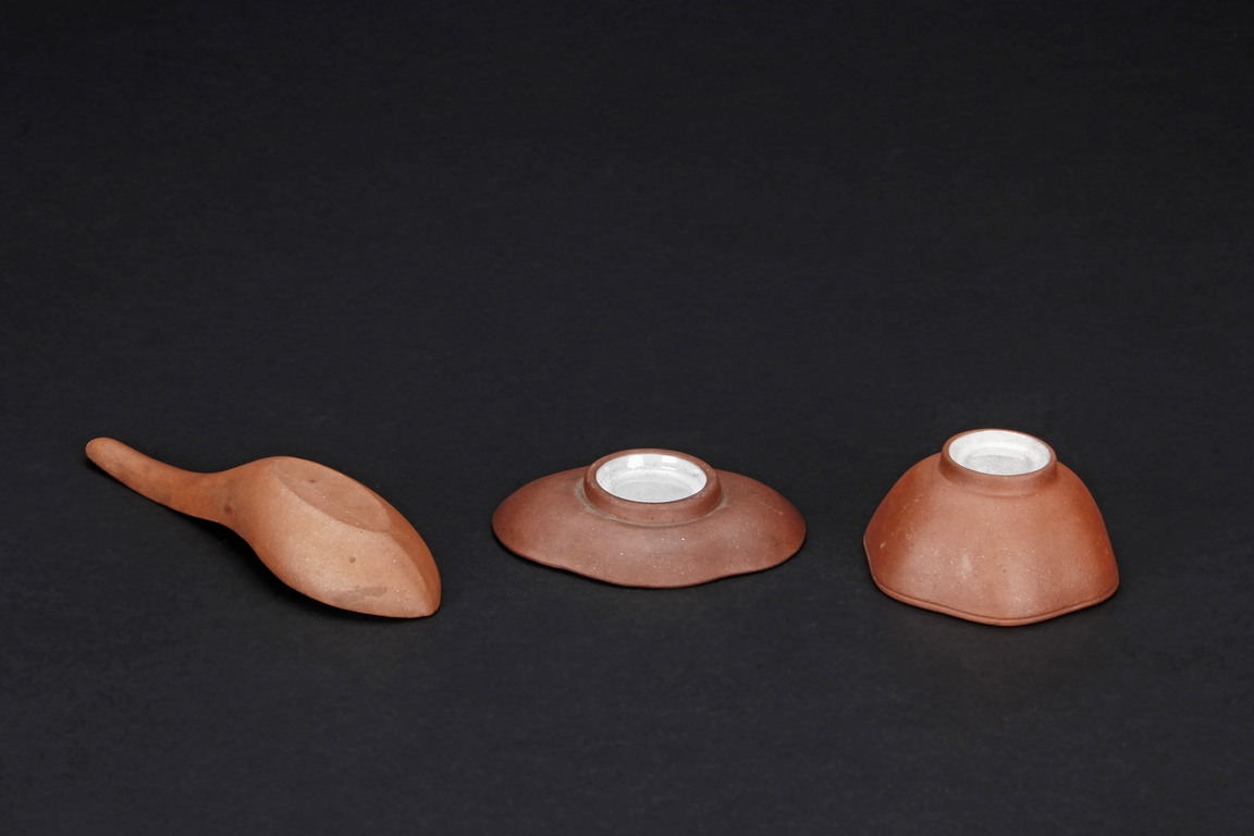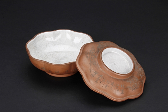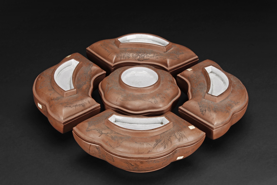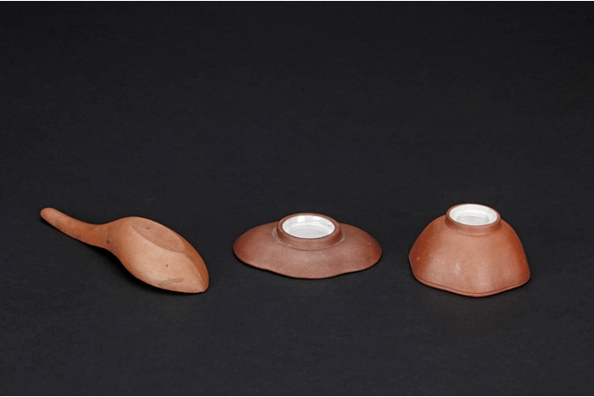 本餐具組共分為十個湯匙,十個碗,十個碟,四組蓋碗,圍成一個圓,中間放一葵花形蓋碗,內外全部施釉,并鐫刻山水詩文。民國時期潛陶氏製作。