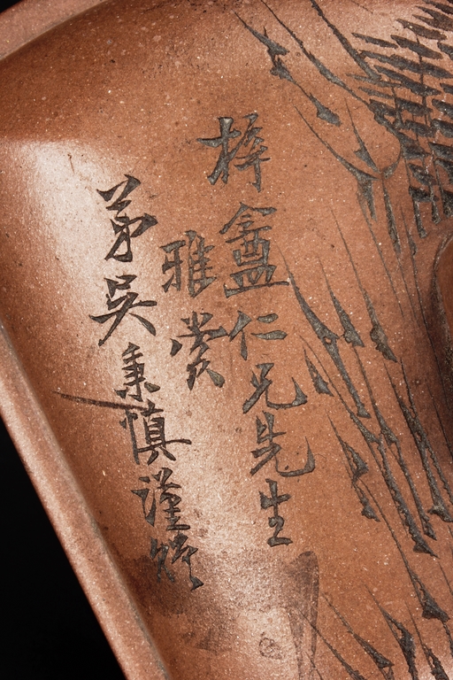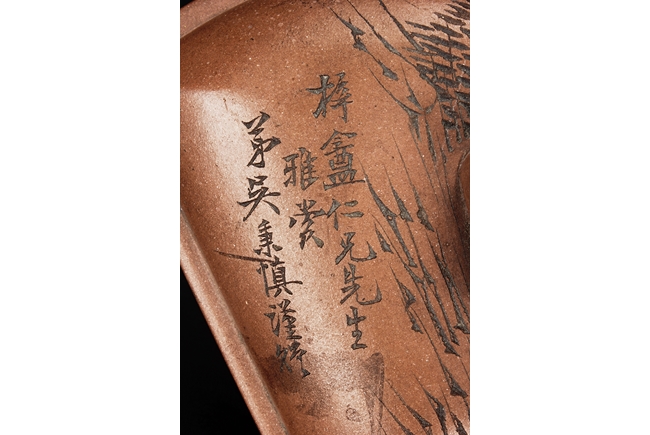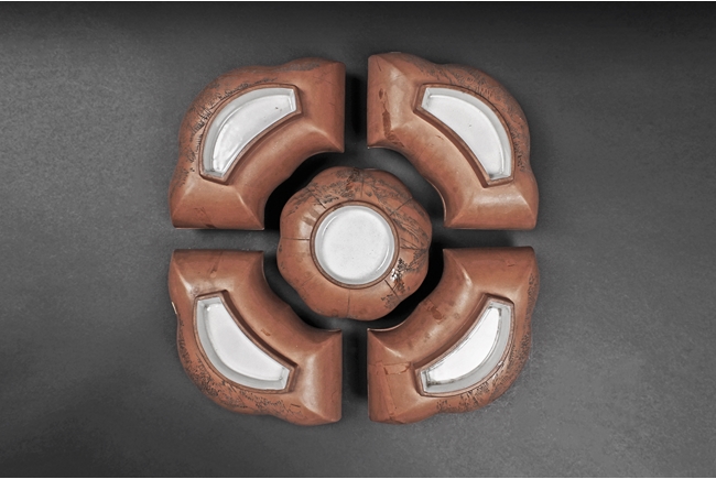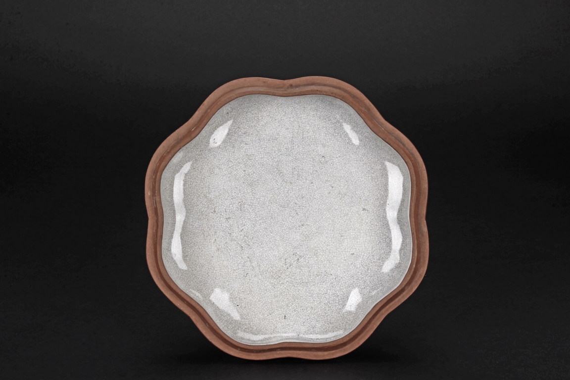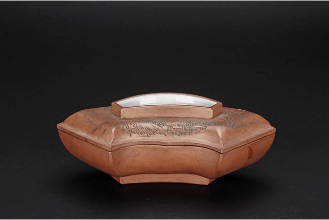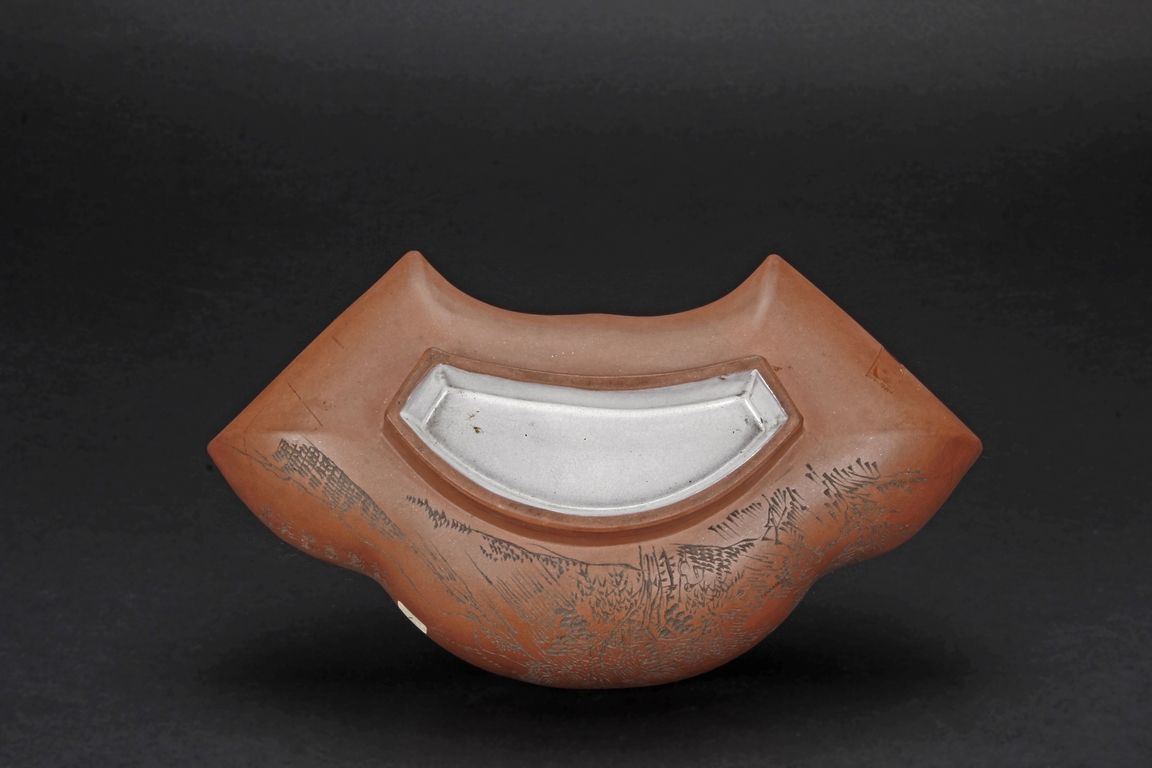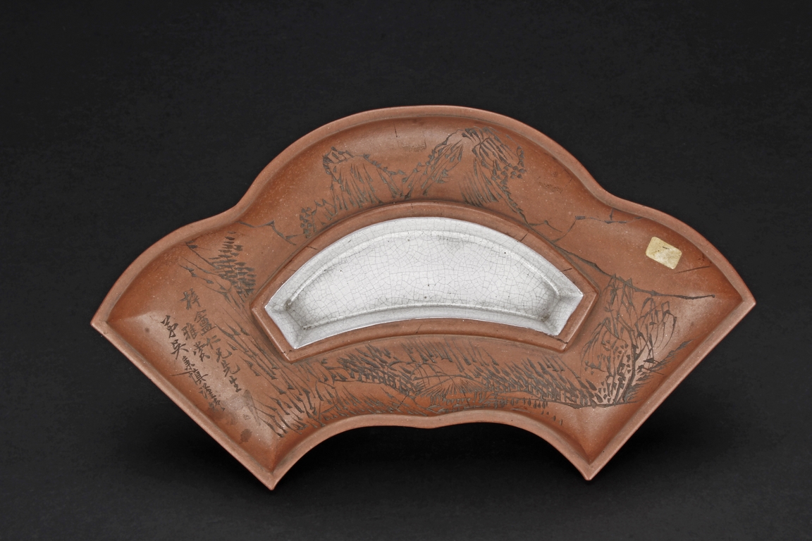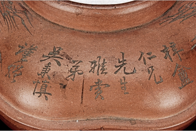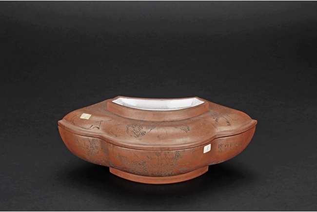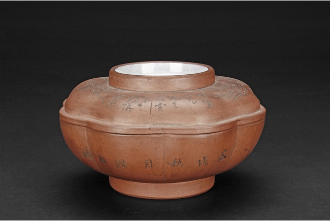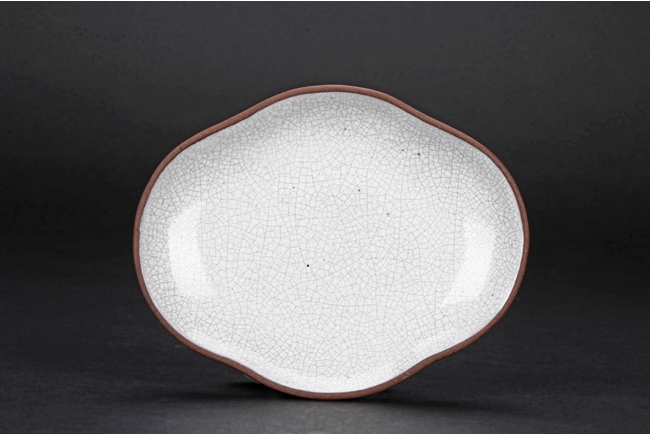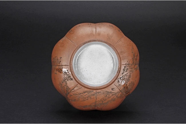本餐具組共分為十個湯匙,十個碗,十個碟,四組蓋碗,圍成一個圓,中間放一葵花形蓋碗,內外全部施釉,并鐫刻山水詩文。民國時期潛陶氏製作。