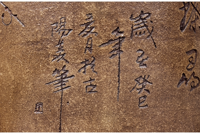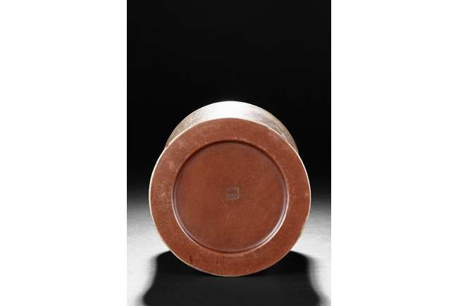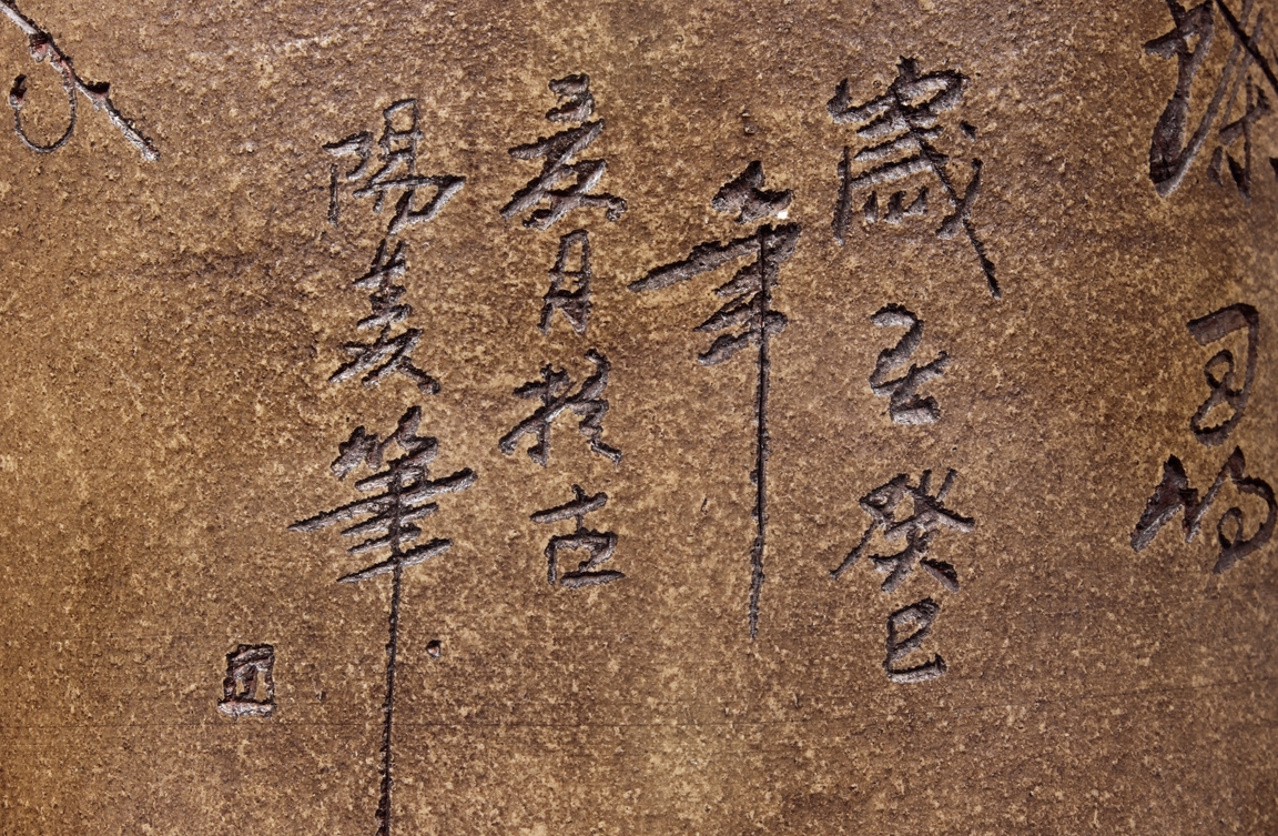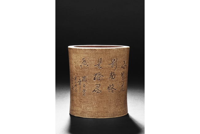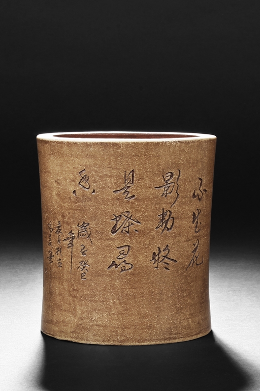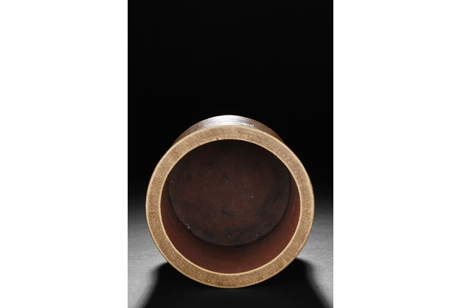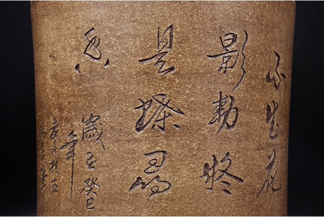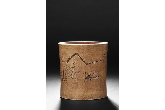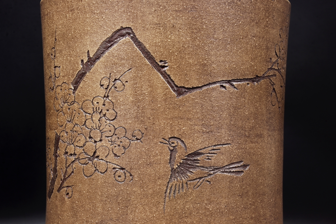 Of waisted cylindrical form, the body carved with magpie flying towards blossoming plum flower branches, the reverse carved with Chinese colophon, and the bottom bears four character mark.