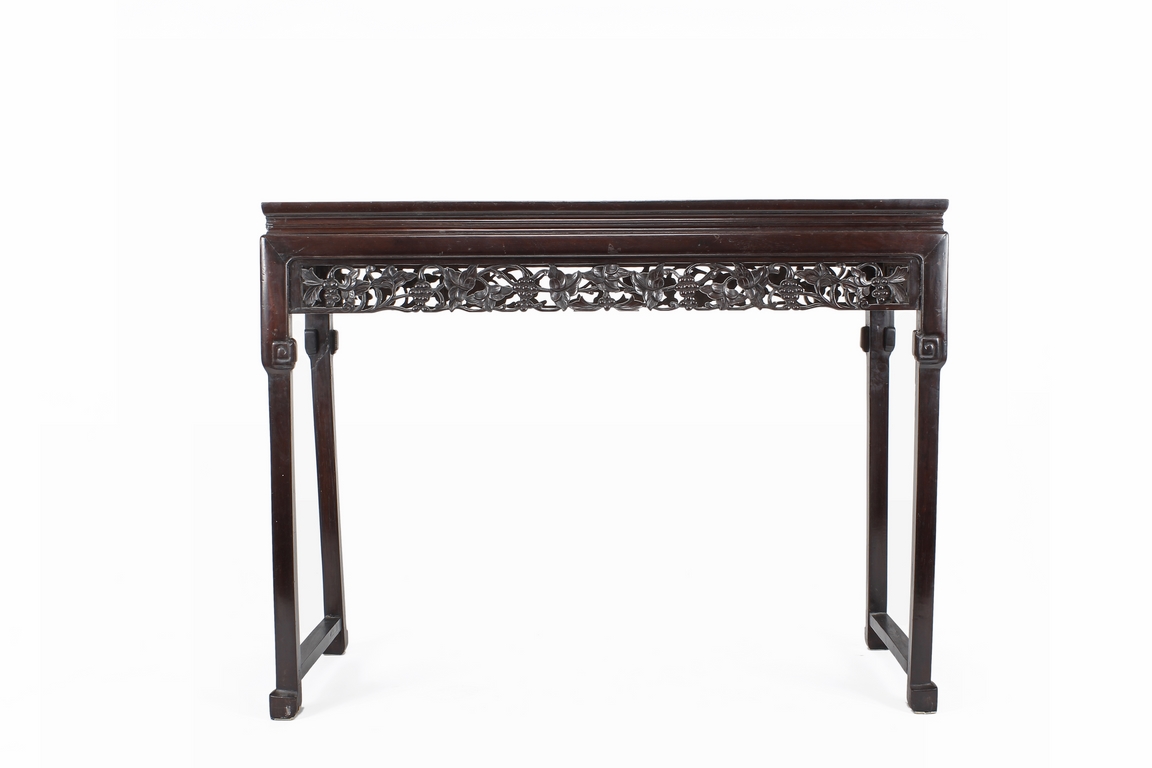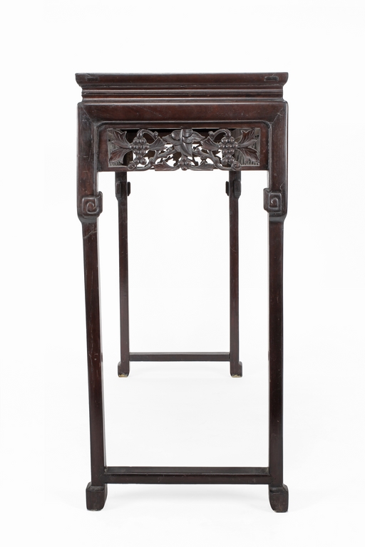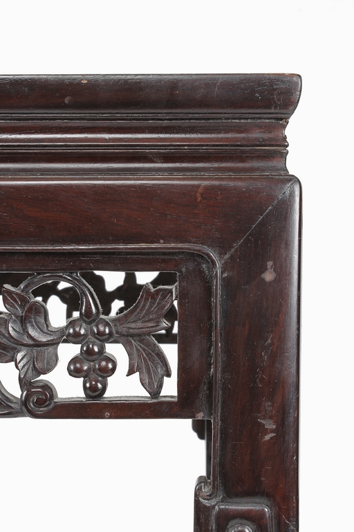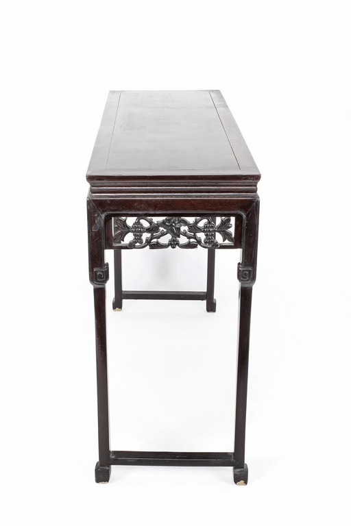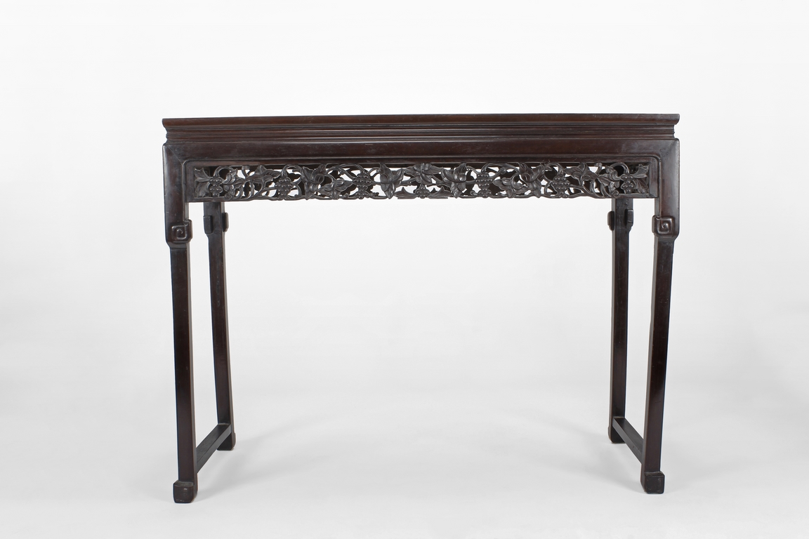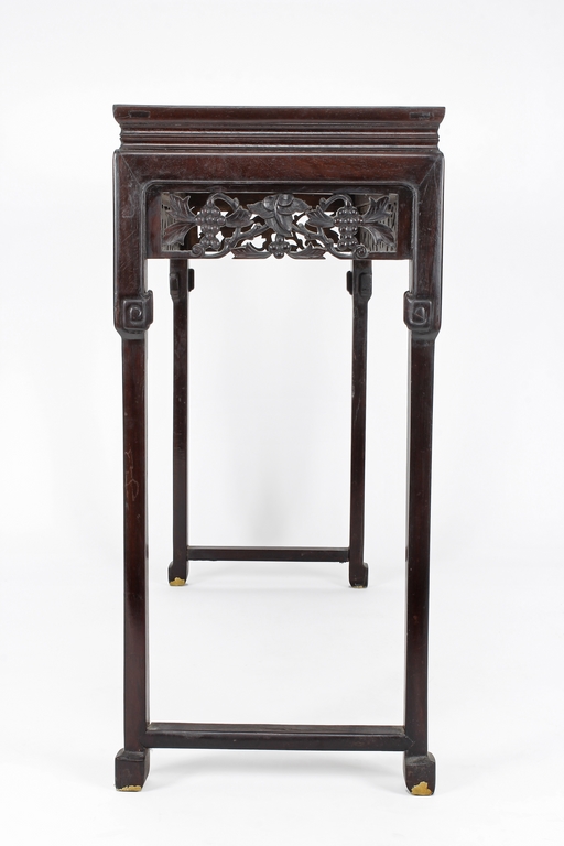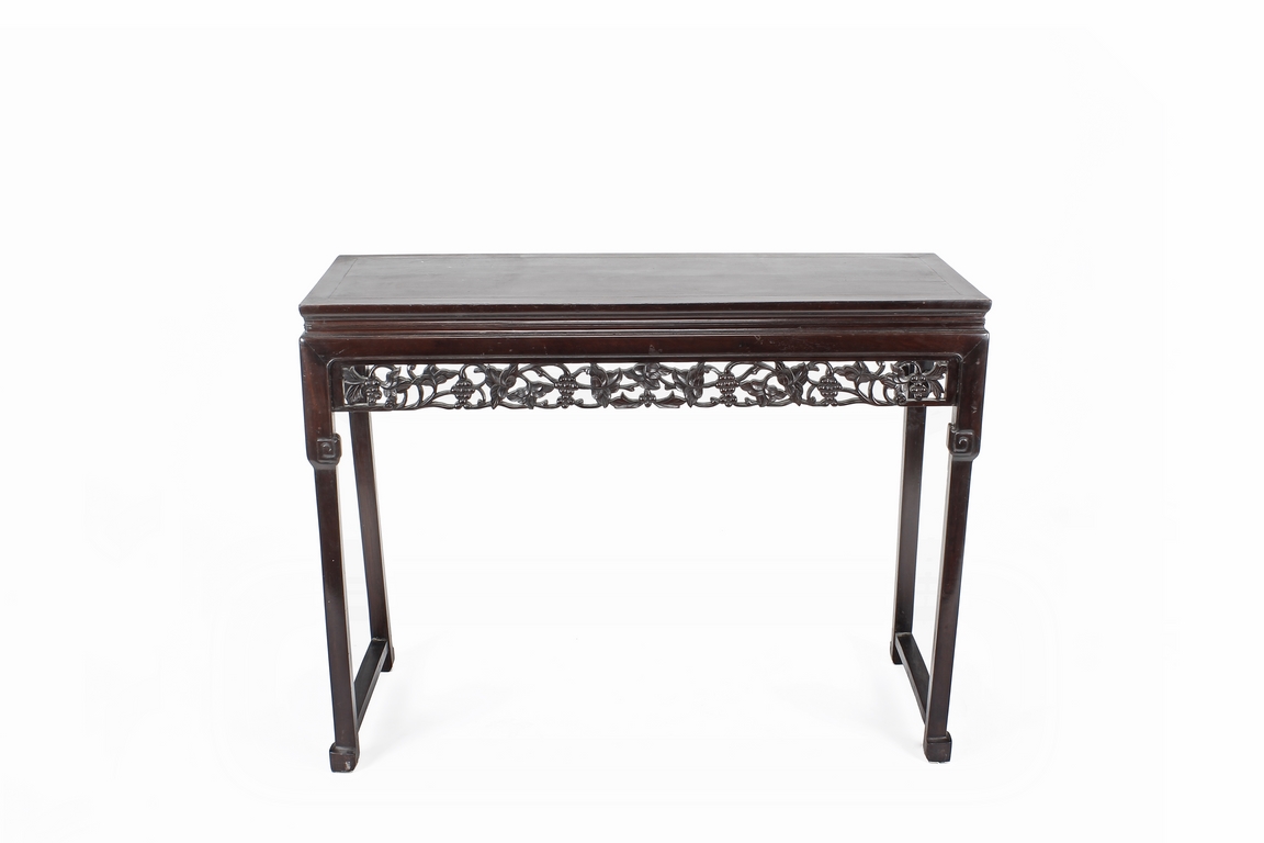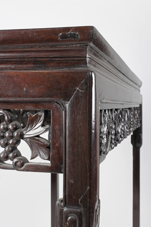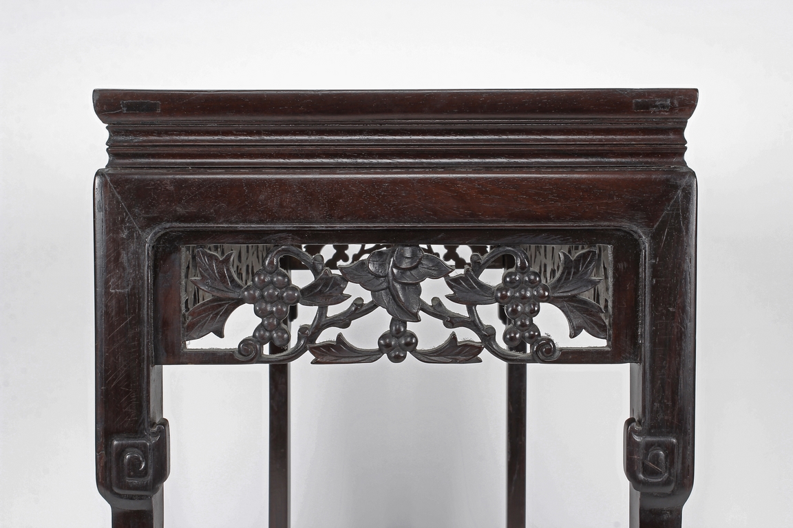 Of elegant proportions, the rectangular panel top is set above a narrow waist, with openwork carved apron of scrolling grape vine patterns, the leg is of rectangular section ending in roof feet.