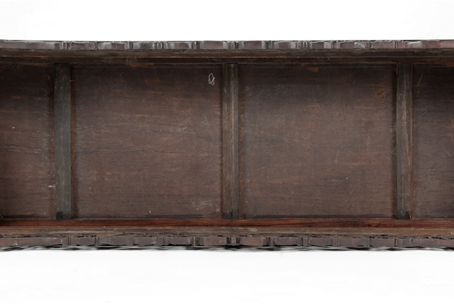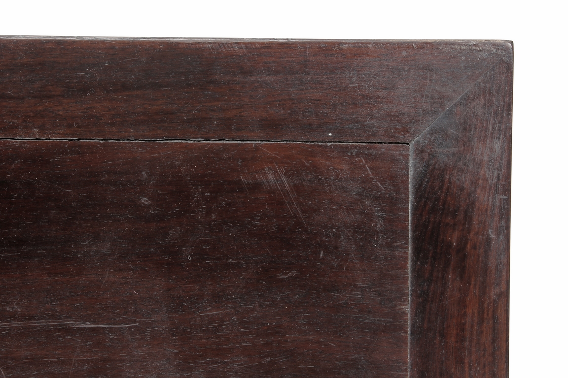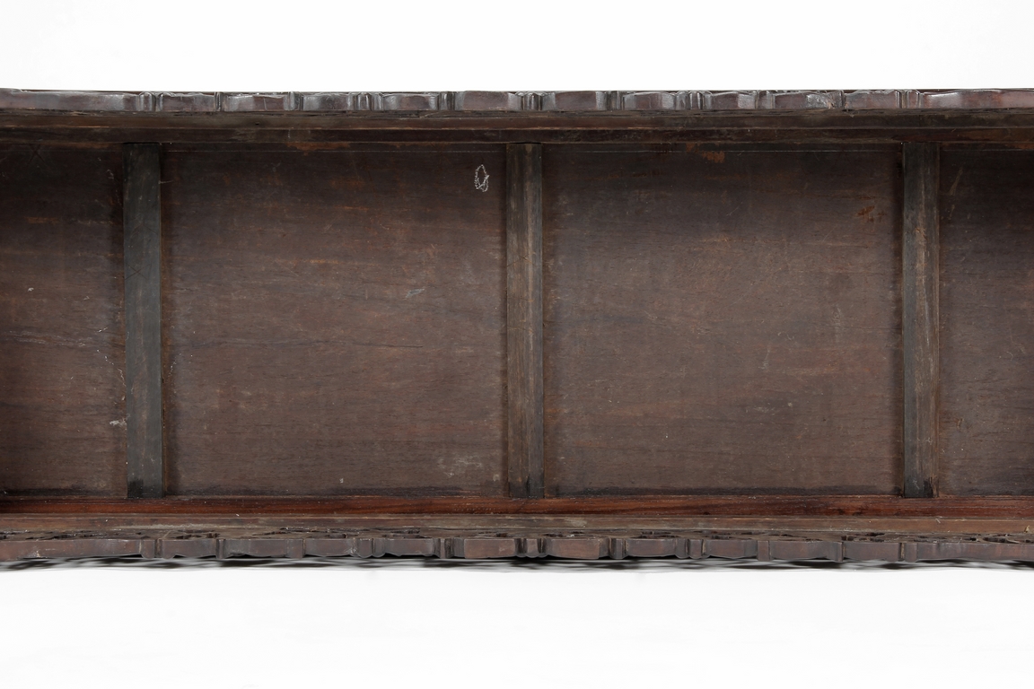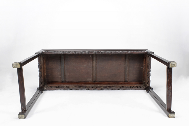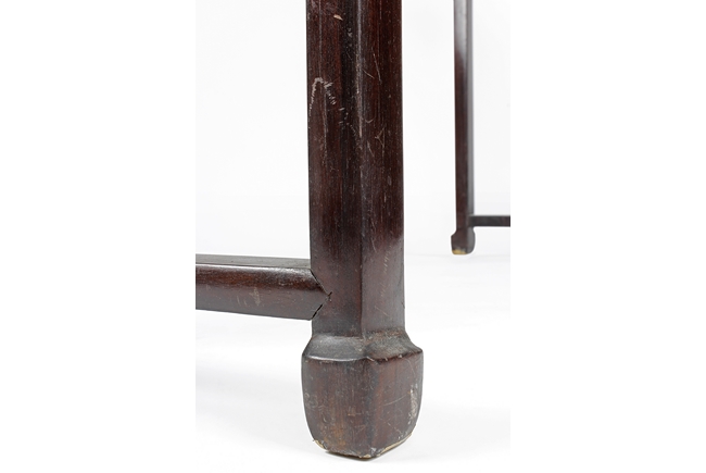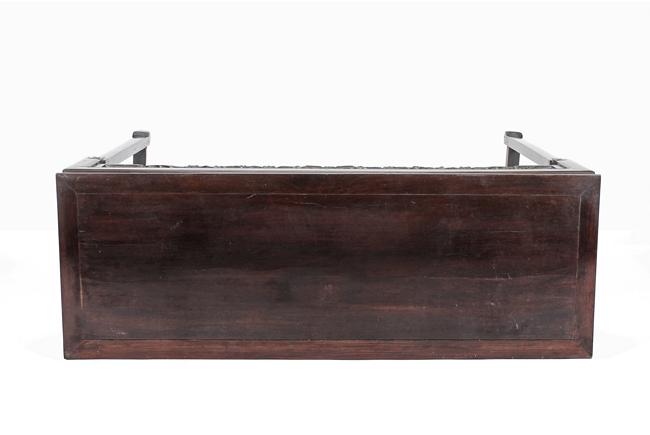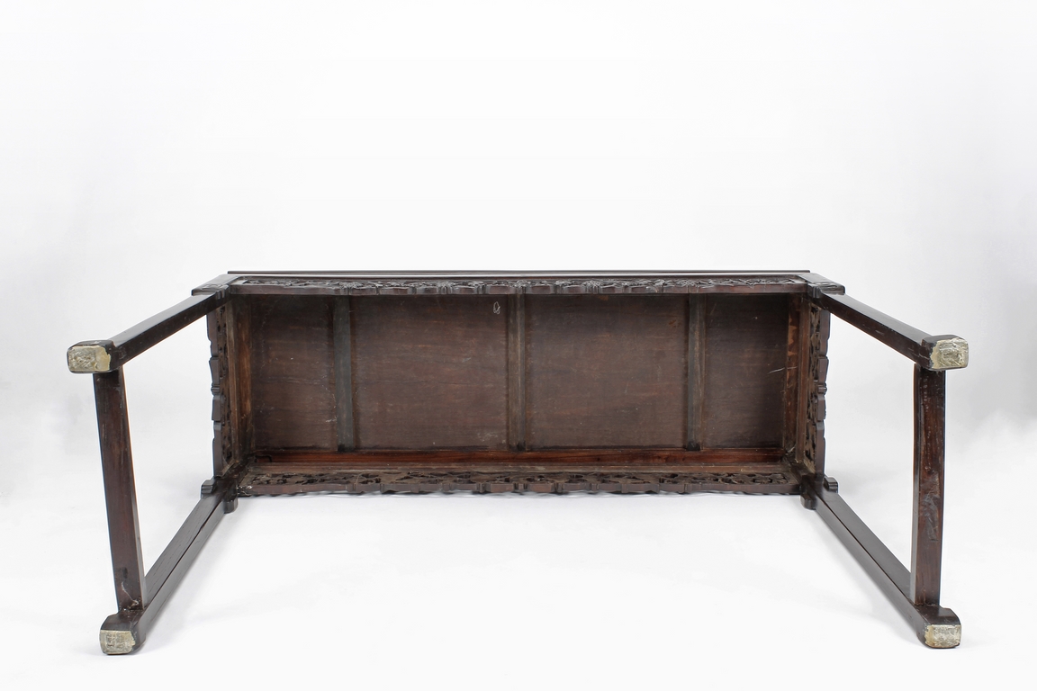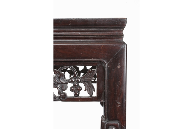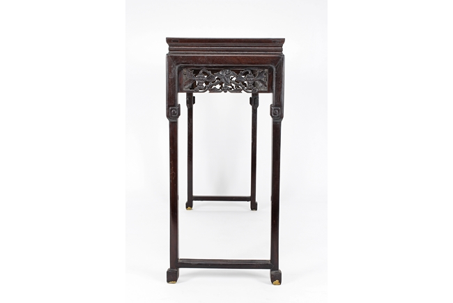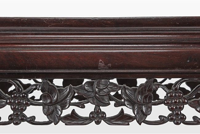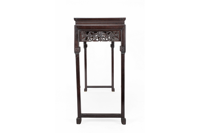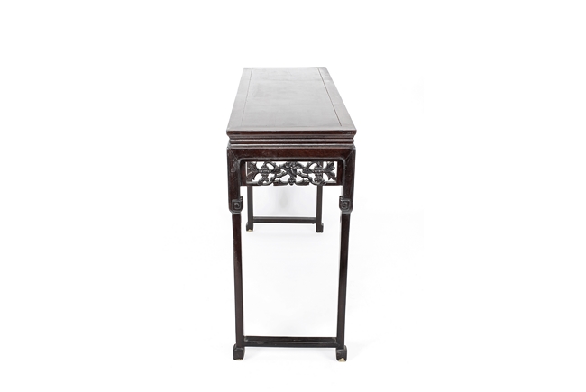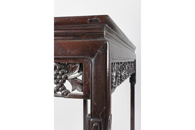 Of elegant proportions, the rectangular panel top is set above a narrow waist, with openwork carved apron of scrolling grape vine patterns, the leg is of rectangular section ending in roof feet.