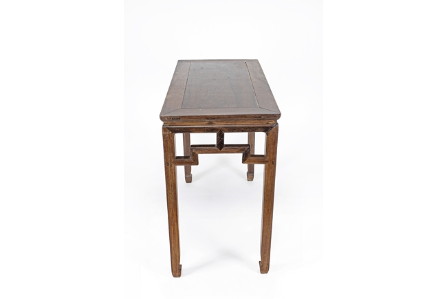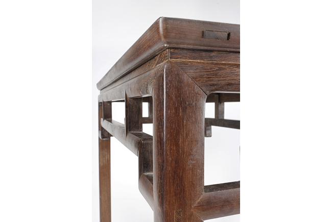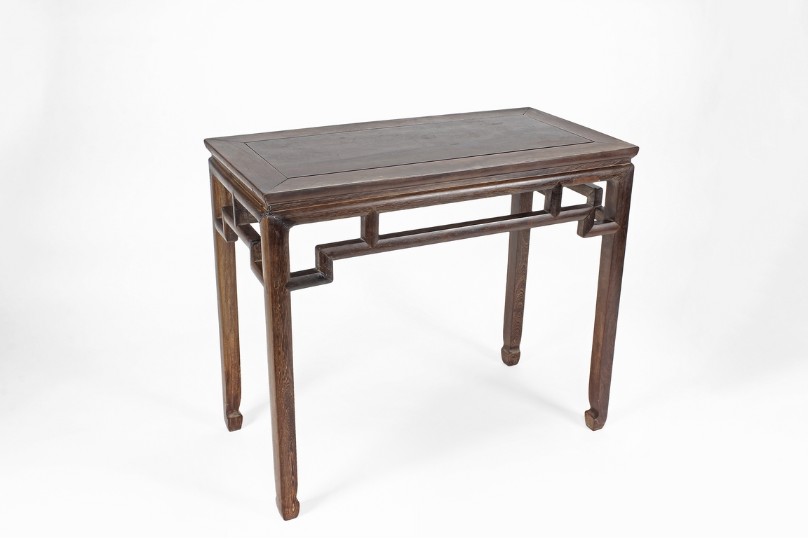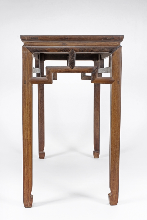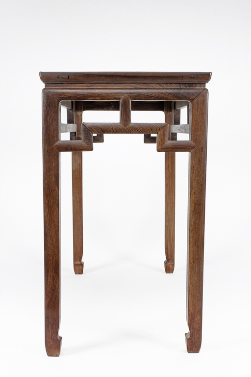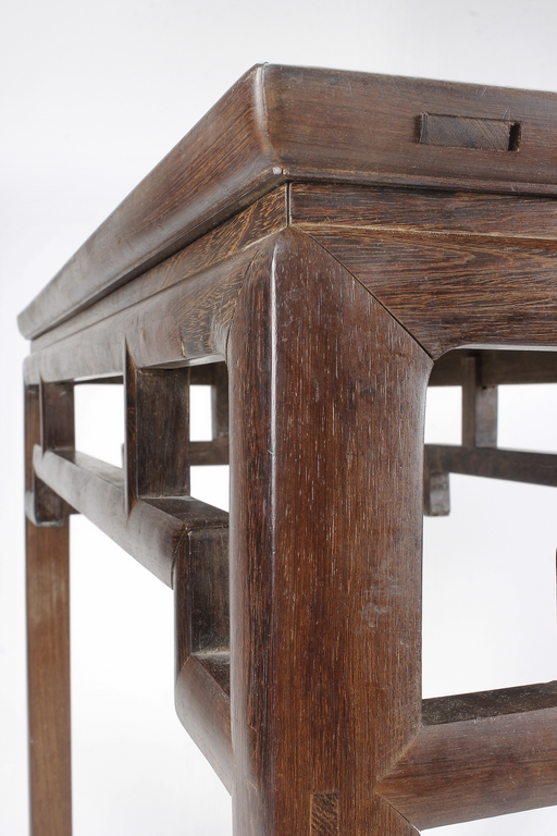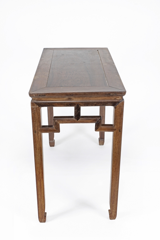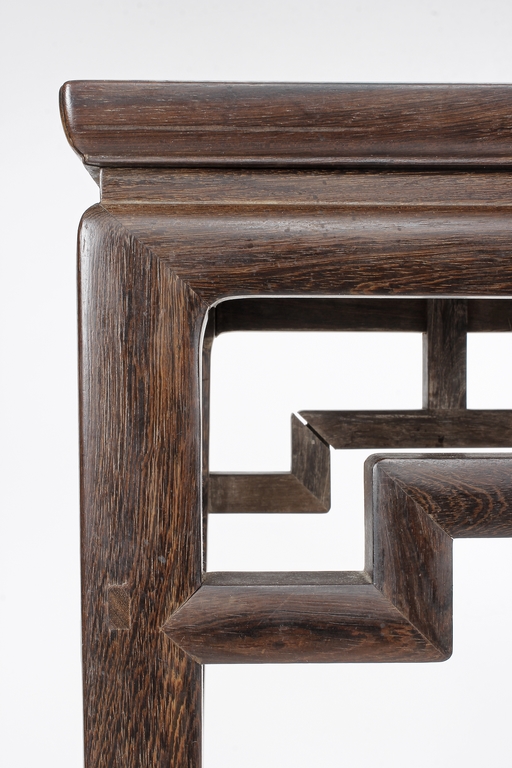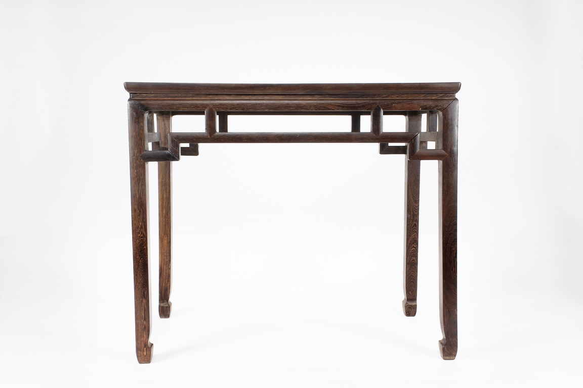 The rectangular top panel is set above a simple lattice pattern apron, the corner legs flush at right angles and are of rectangular section and end in roof feet.