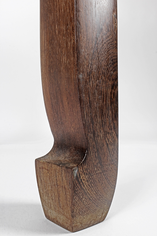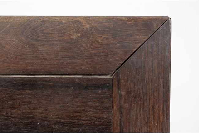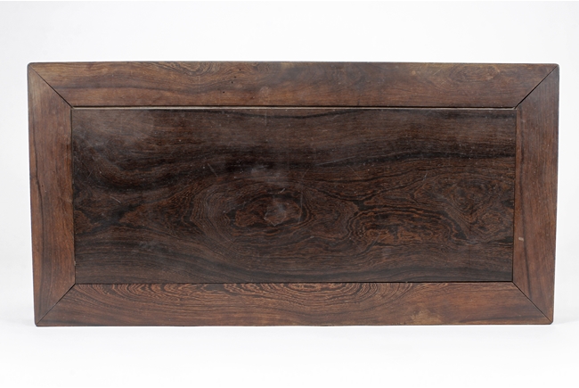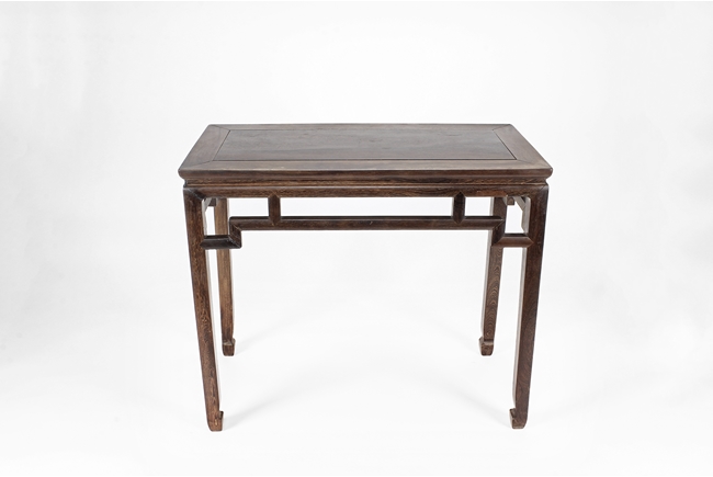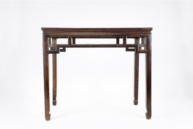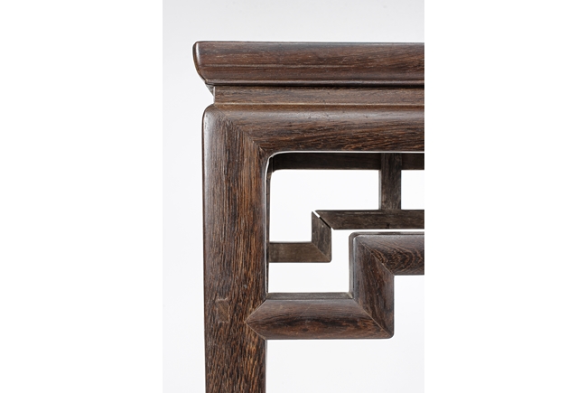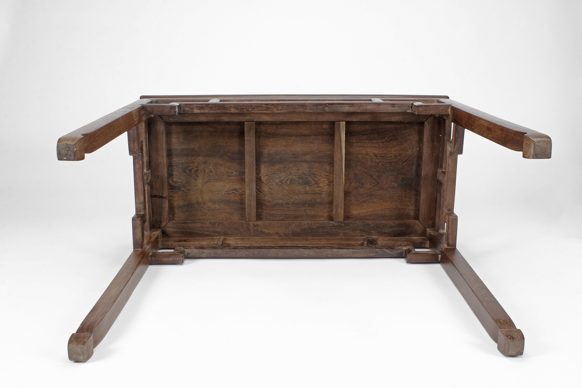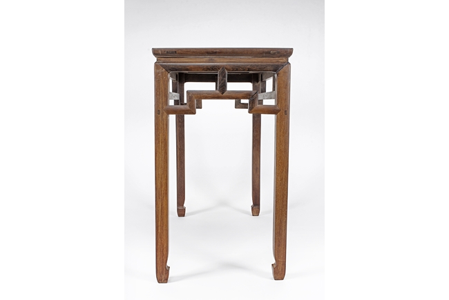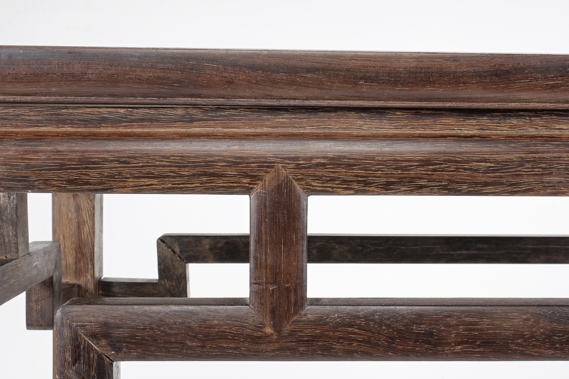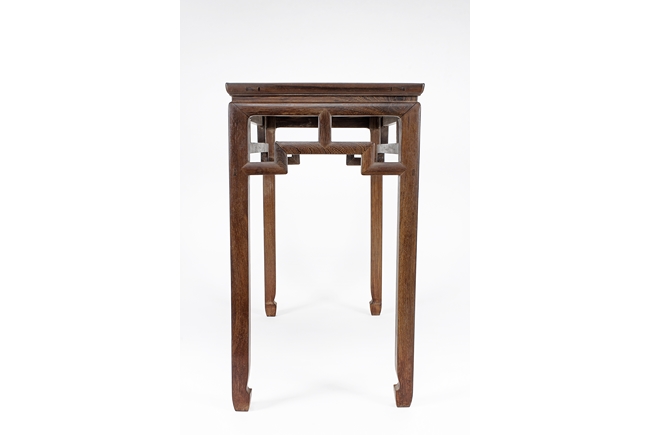 The rectangular top panel is set above a simple lattice pattern apron, the corner legs flush at right angles and are of rectangular section and end in roof feet.