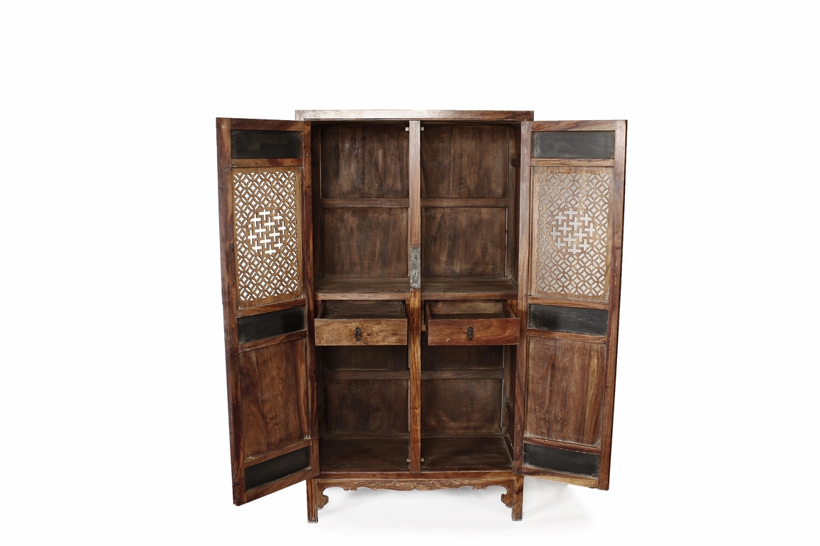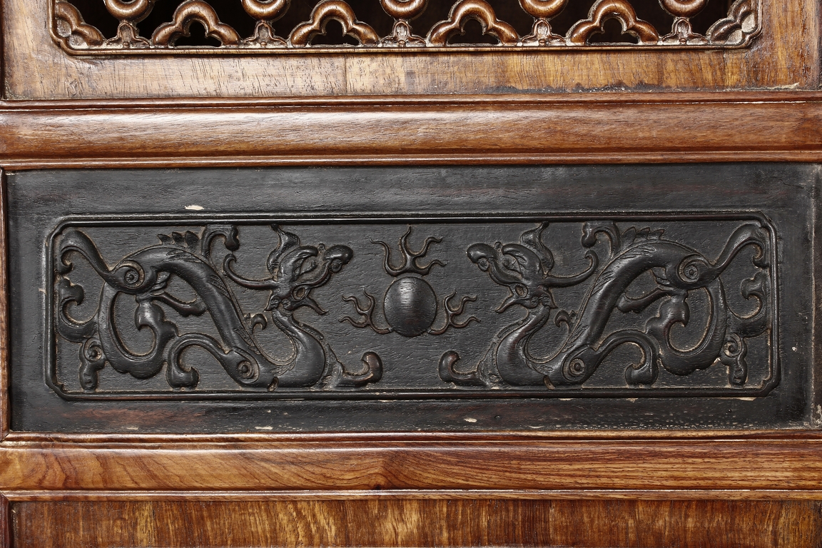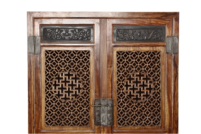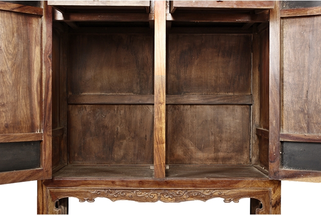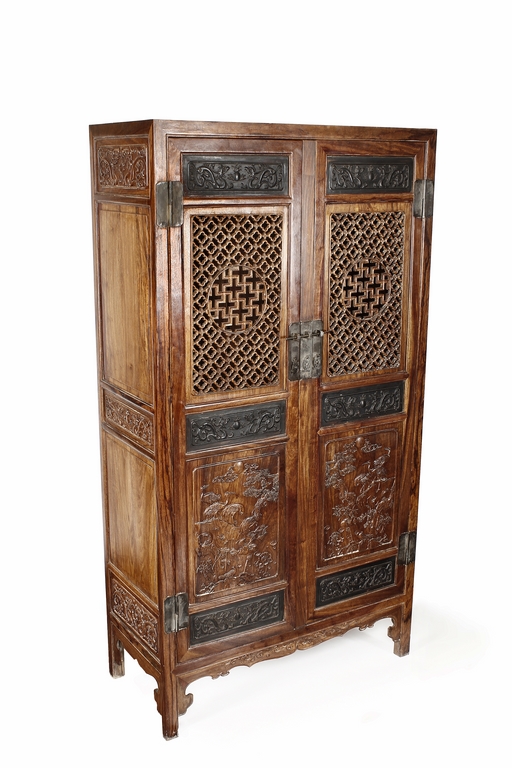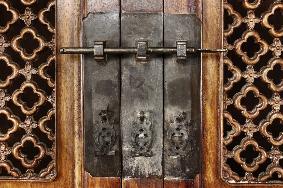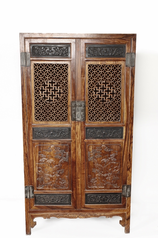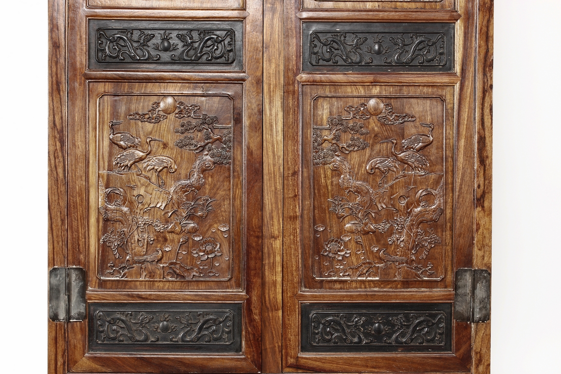 Of massive rectangular form, each cabinet has two large doors, the top carved in open works of Buddhist swastika sign medallion in the cetner, surrounded by intertwined flowers, the bottom panel carved in low relief of cranes, lotus flowers, pine trees, and ledges, a bronze plaque of two confronting dragons chasing flaming sphere on the top, middle, and bottom, completed by bronze pad lock. The cabinet opens to top storage, middle drawers, and bottom storage. The wood with natural colors and grains. Republic period.