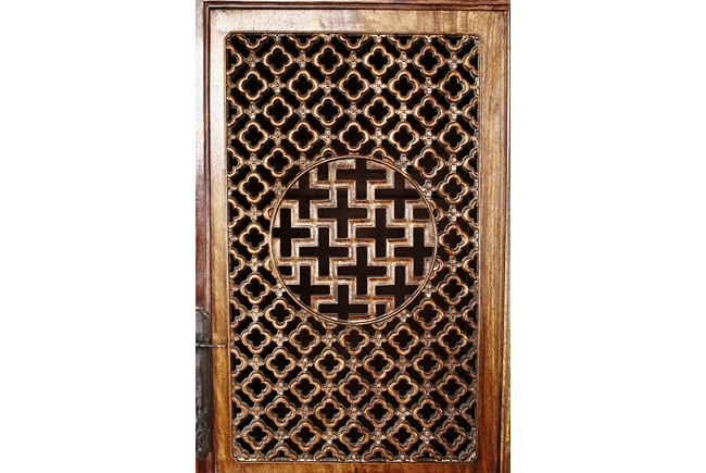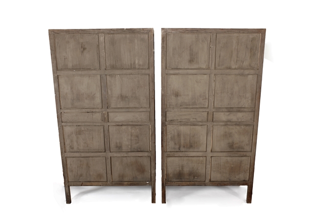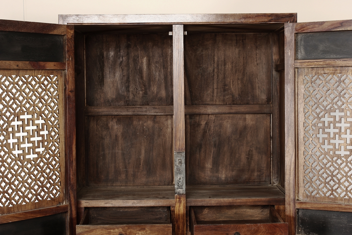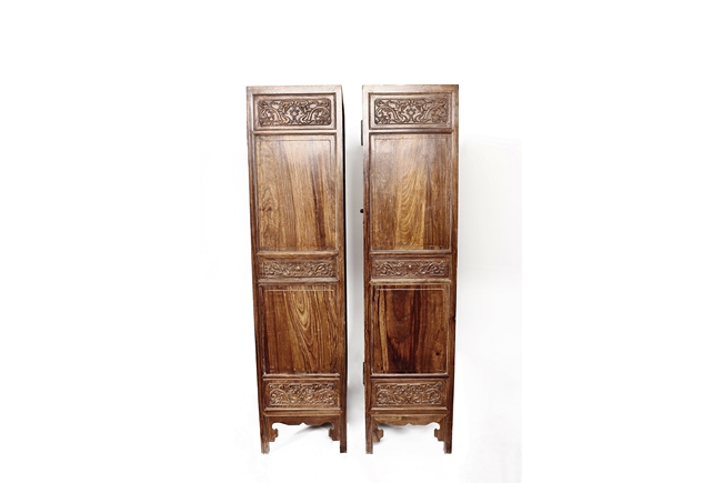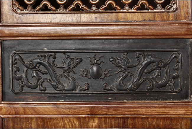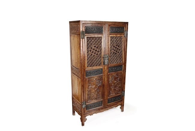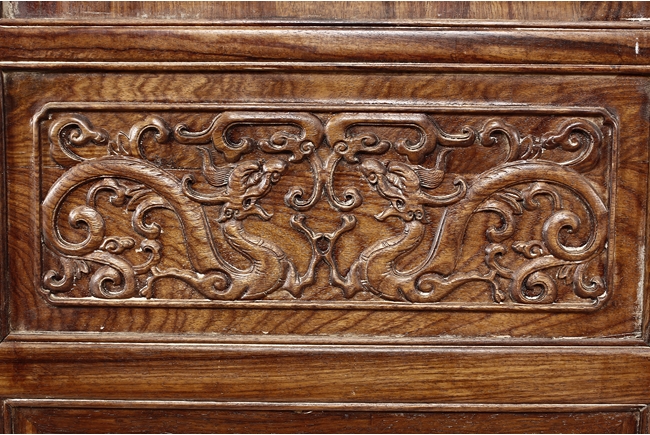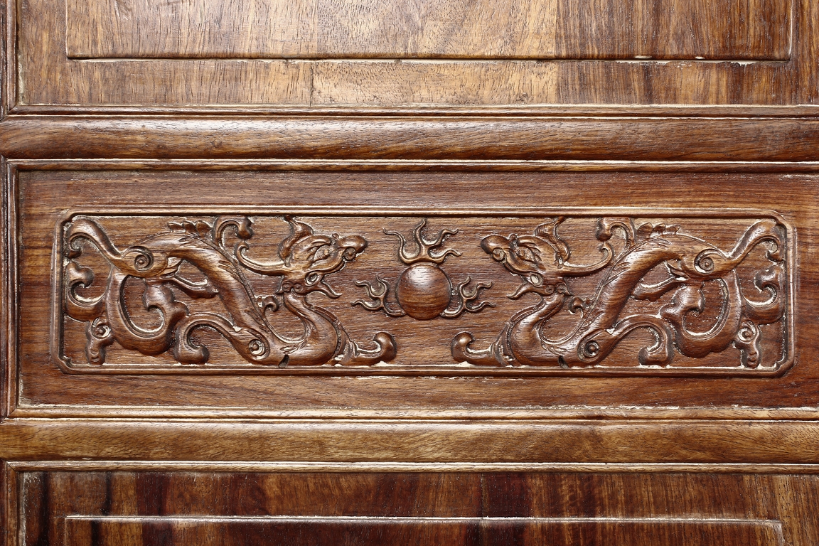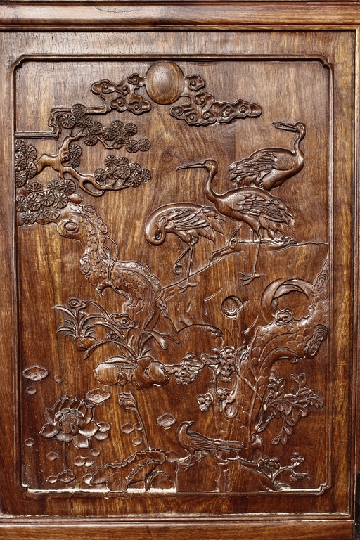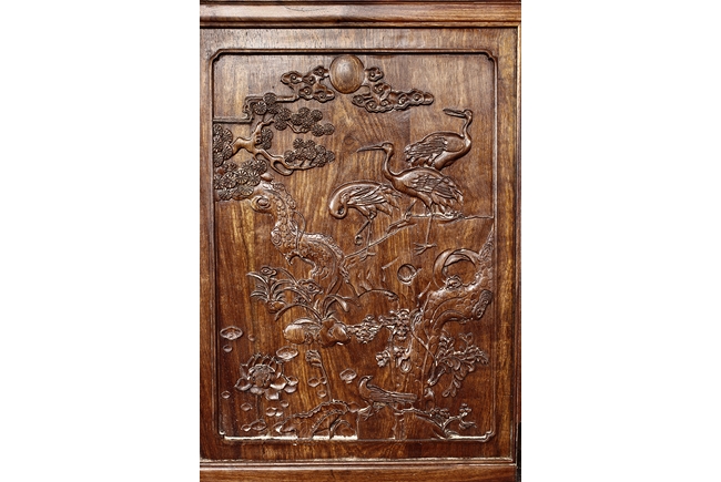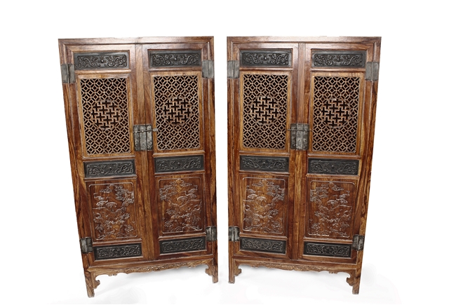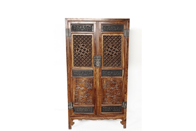 Of massive rectangular form, each cabinet has two large doors, the top carved in open works of Buddhist swastika sign medallion in the cetner, surrounded by intertwined flowers, the bottom panel carved in low relief of cranes, lotus flowers, pine trees, and ledges, a bronze plaque of two confronting dragons chasing flaming sphere on the top, middle, and bottom, completed by bronze pad lock. The cabinet opens to top storage, middle drawers, and bottom storage. The wood with natural colors and grains. Republic period.