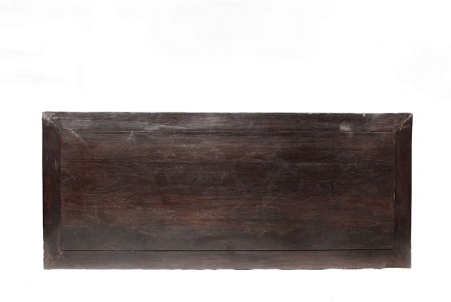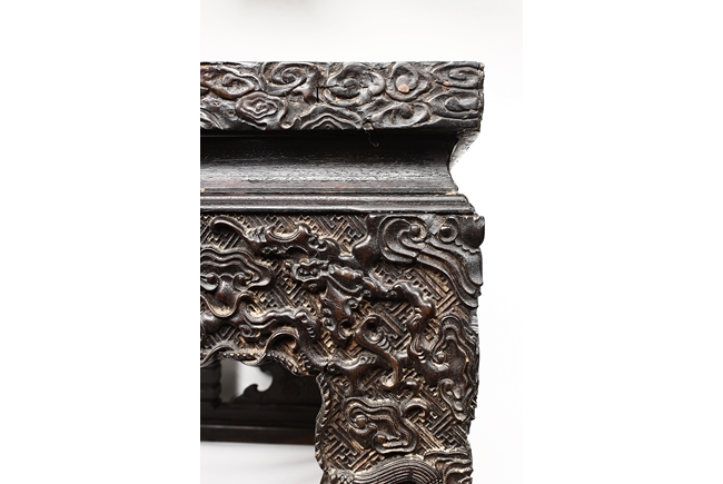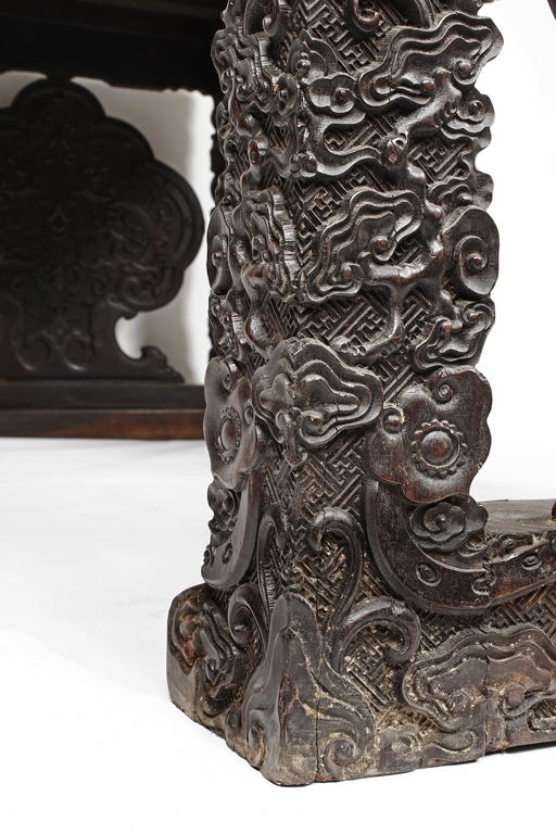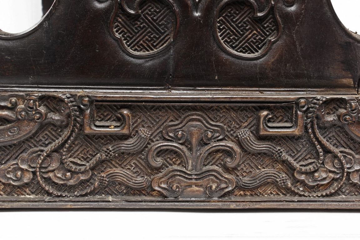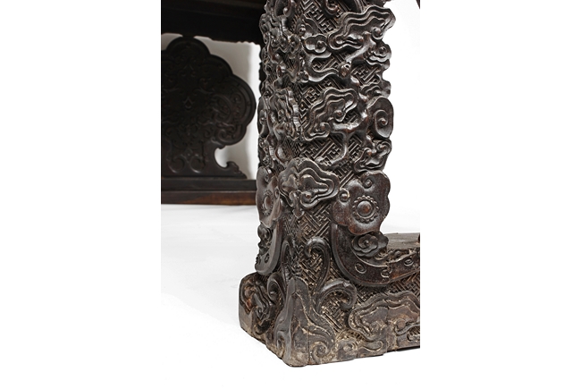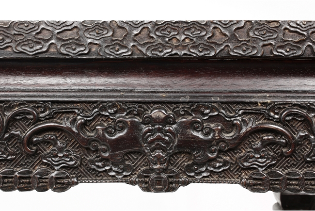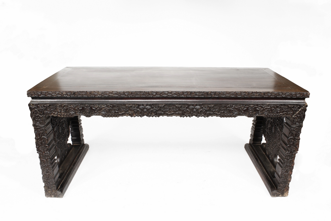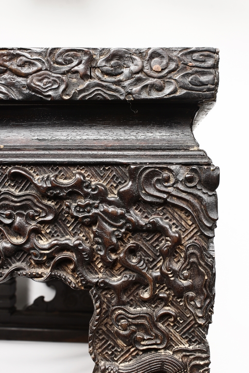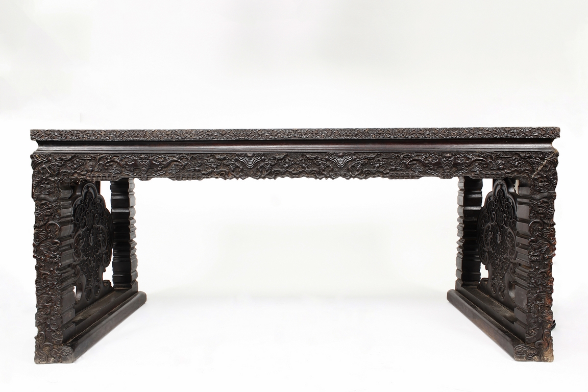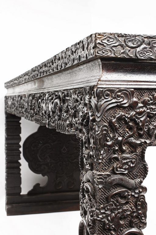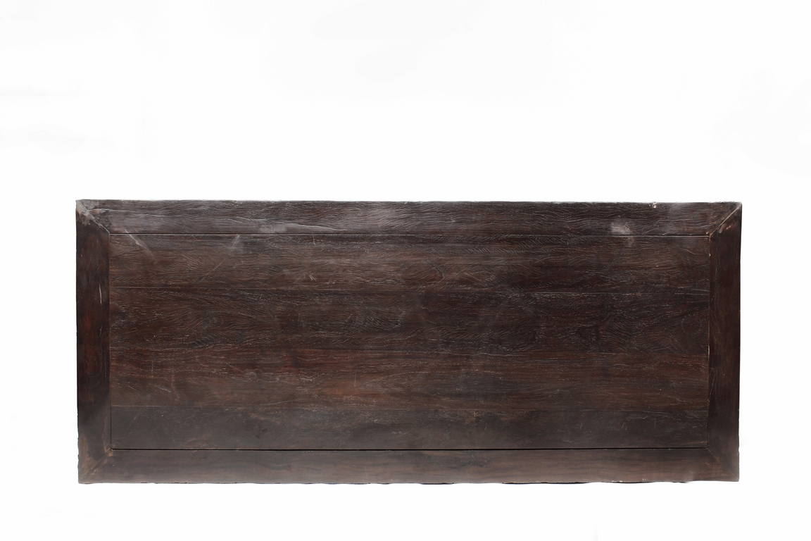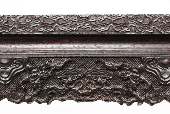 Of long rectangular form, the hardwood panel is set upon an elaborately detailed apron decorated with various auspicious emblems amid a dense network of key-fret patterns, below the frieze carved with intricate auspicious clouds. The legs are carved with the same motif continued from the apron connected at the base with stretchers carved in Lingzhi-head shape decorated with two stylized confronted dragons playing a a flaming ball.