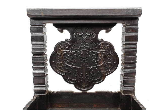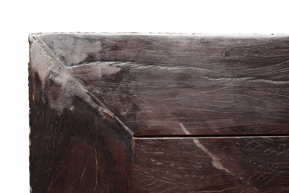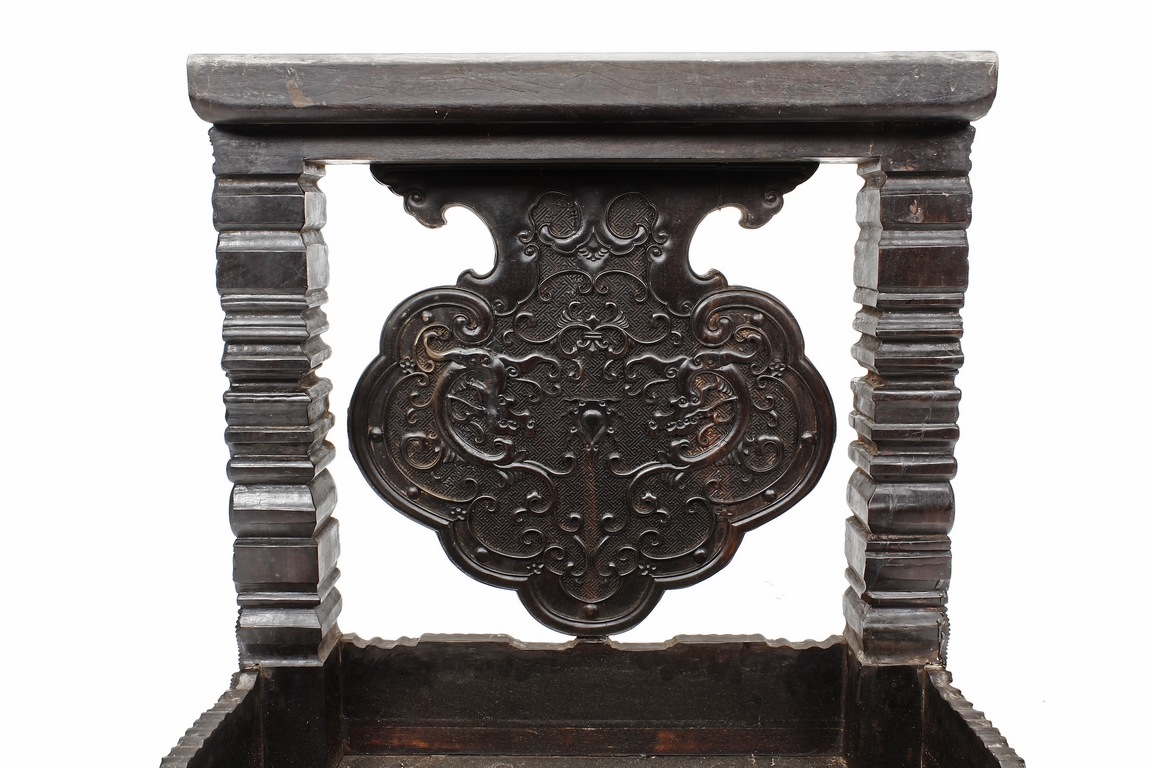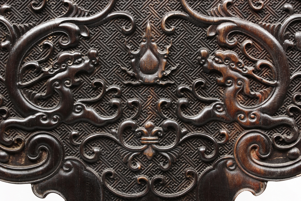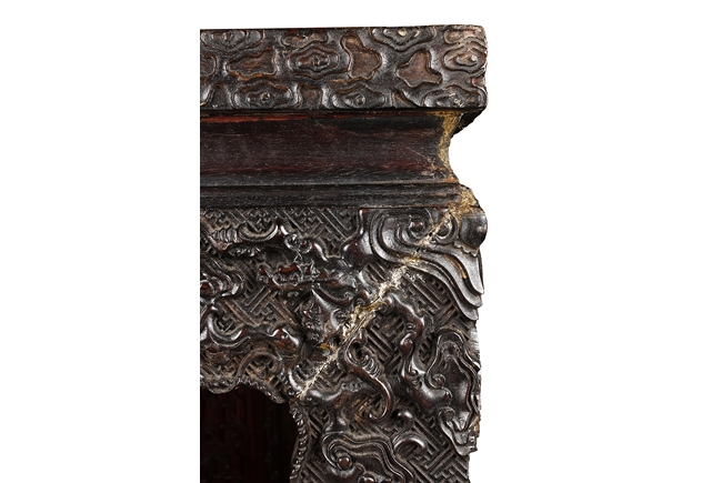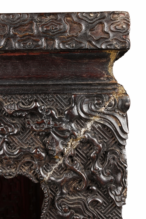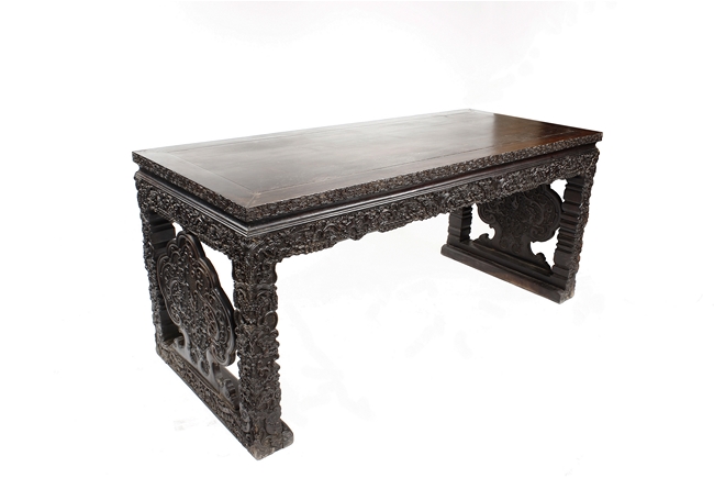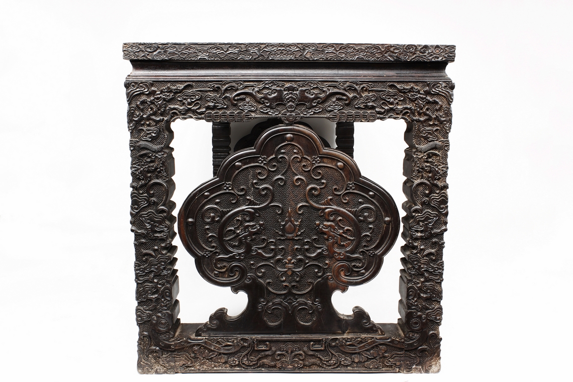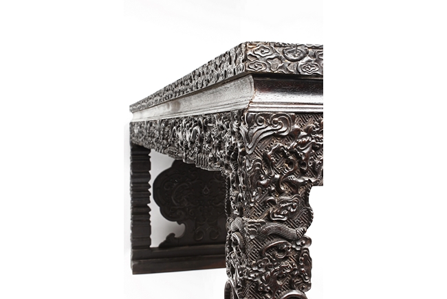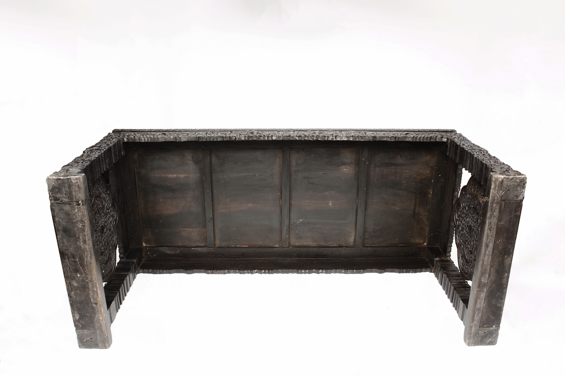 Of long rectangular form, the hardwood panel is set upon an elaborately detailed apron decorated with various auspicious emblems amid a dense network of key-fret patterns, below the frieze carved with intricate auspicious clouds. The legs are carved with the same motif continued from the apron connected at the base with stretchers carved in Lingzhi-head shape decorated with two stylized confronted dragons playing a a flaming ball.