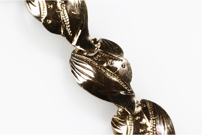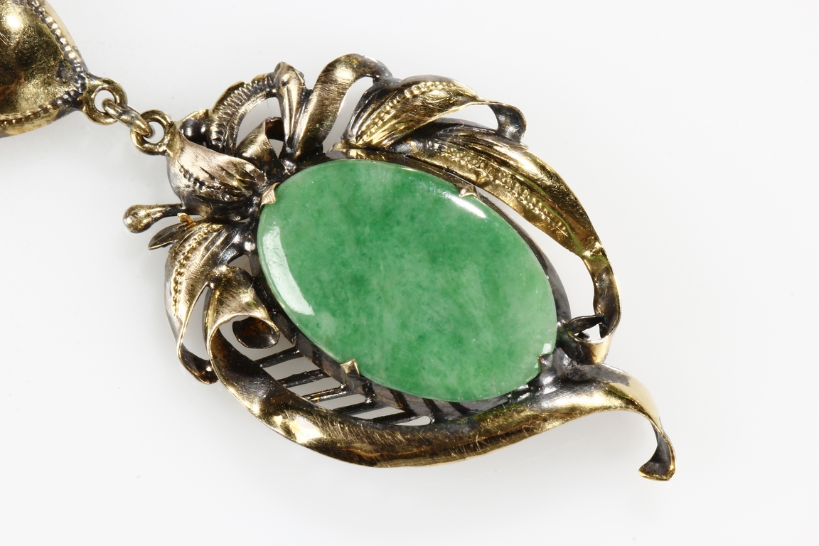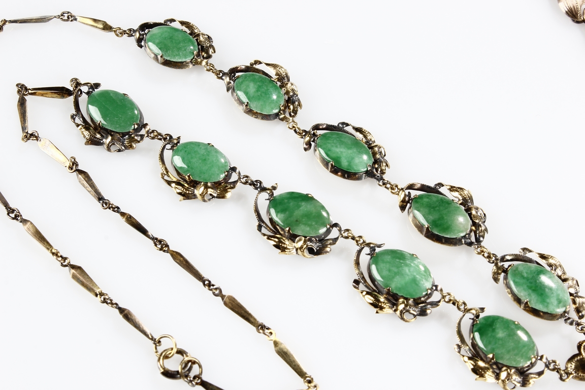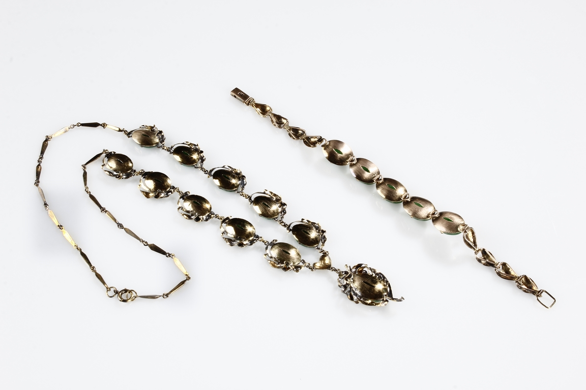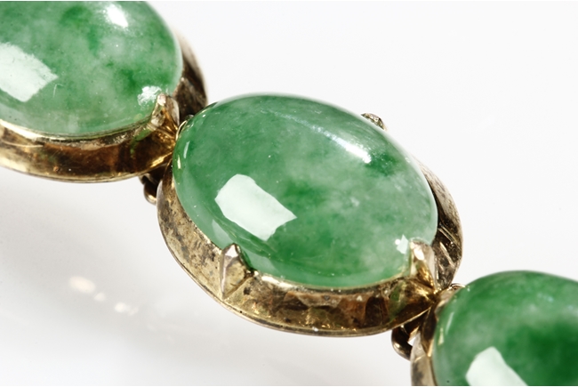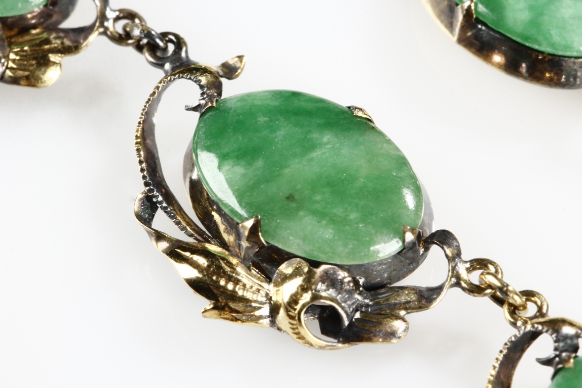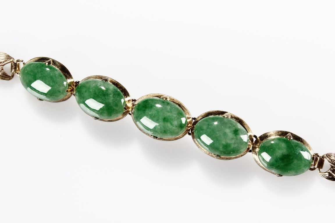 The bracelet composed of five oval cabochan jadeite jade, spaced and connected by 18k yellow gold chain. The necklace composed of 11 oval cabochan jadeite jade and joined by 18k yellow gold chain, the jadeite of apple green color with white.