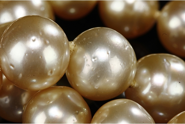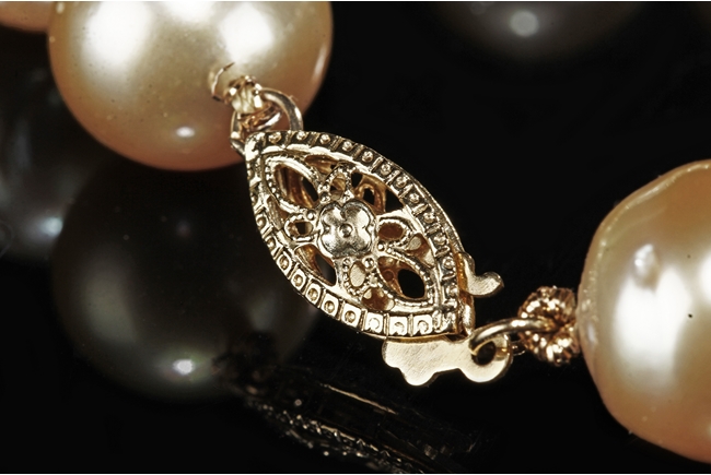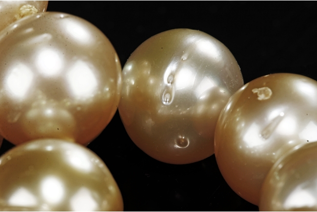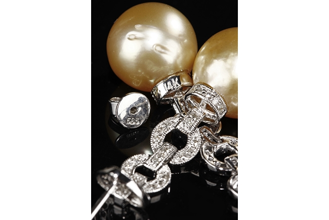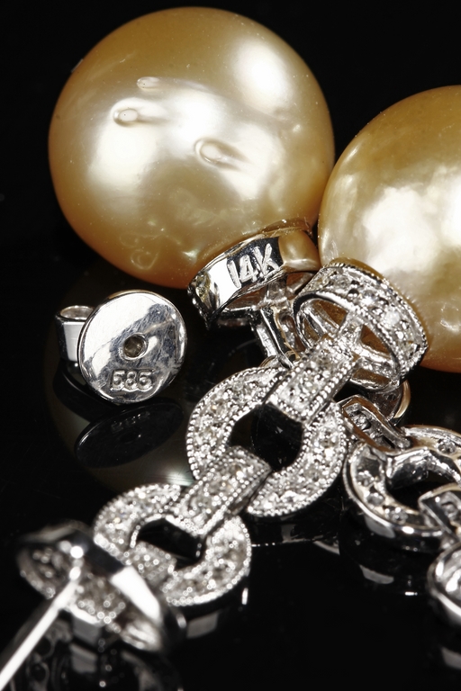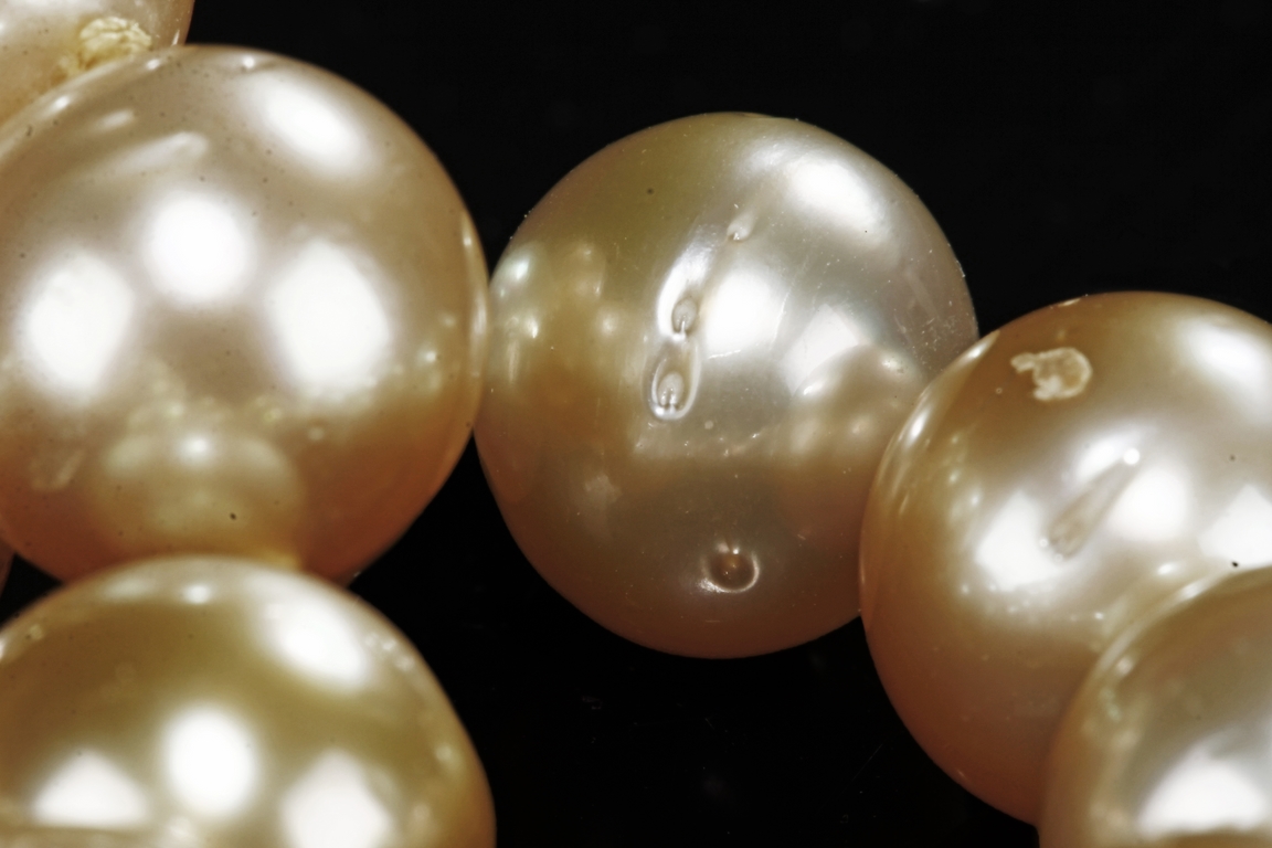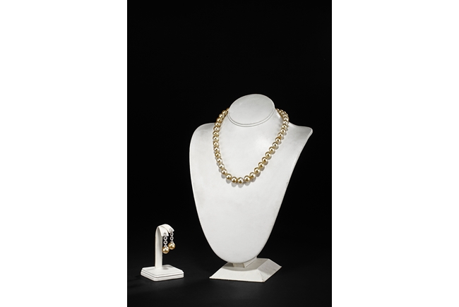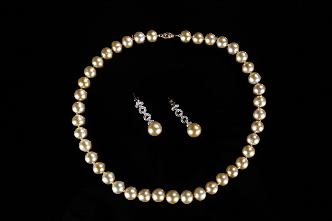 The necklace and earrings comprised of Australian south sea pearls, each polished in the form of bead, ranging from approximately 10.5 mm to 11.5 mm.