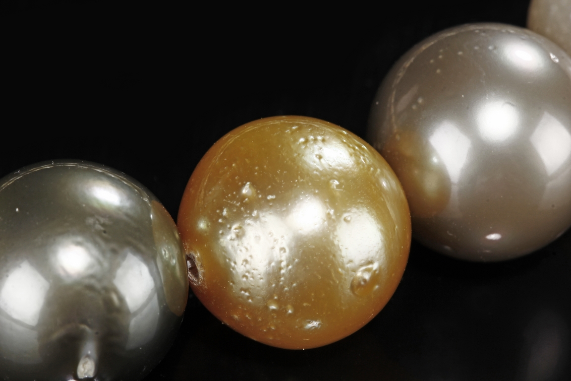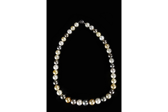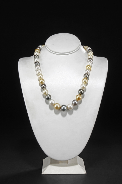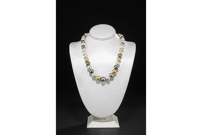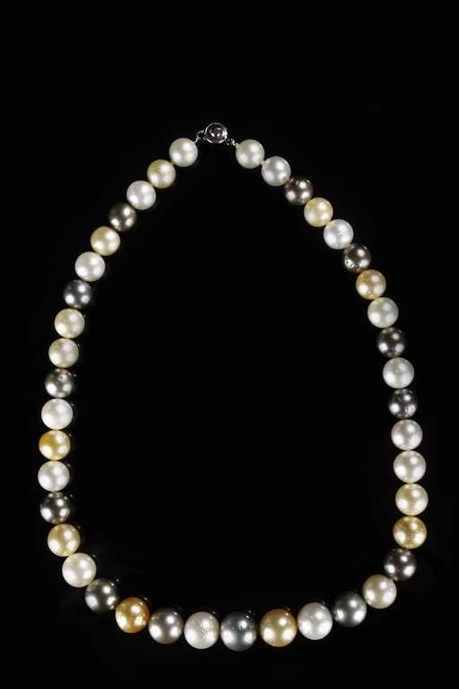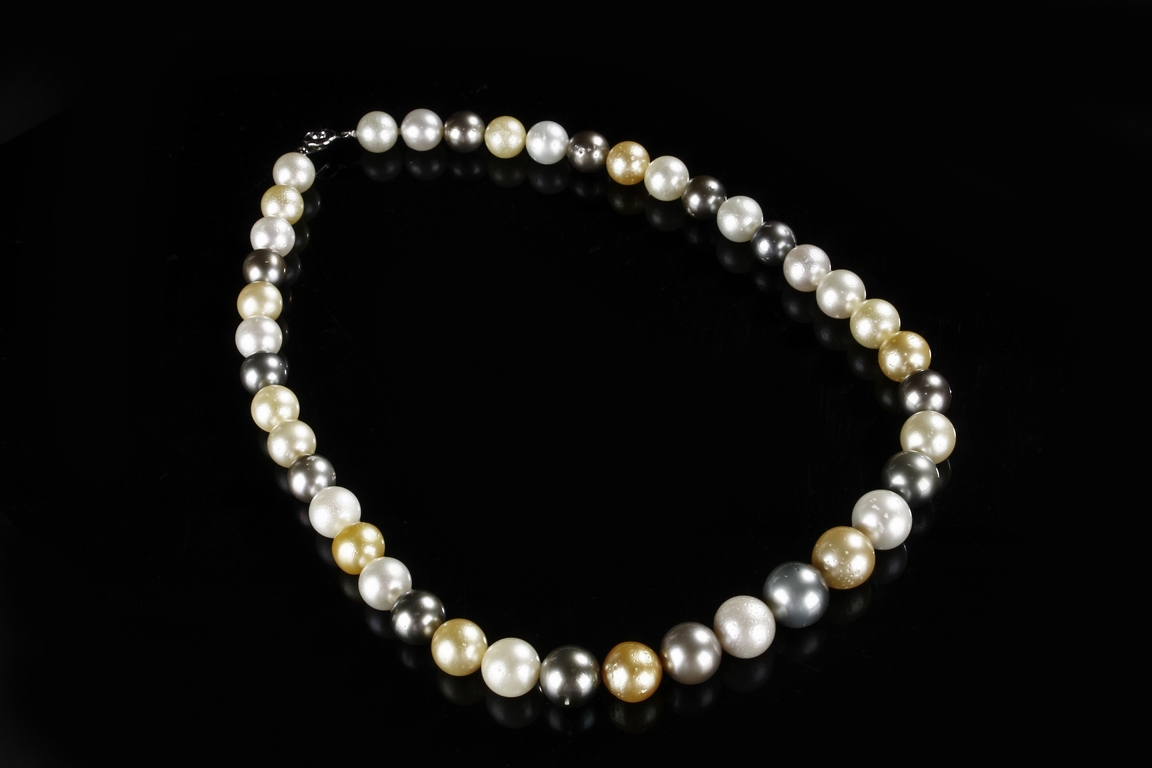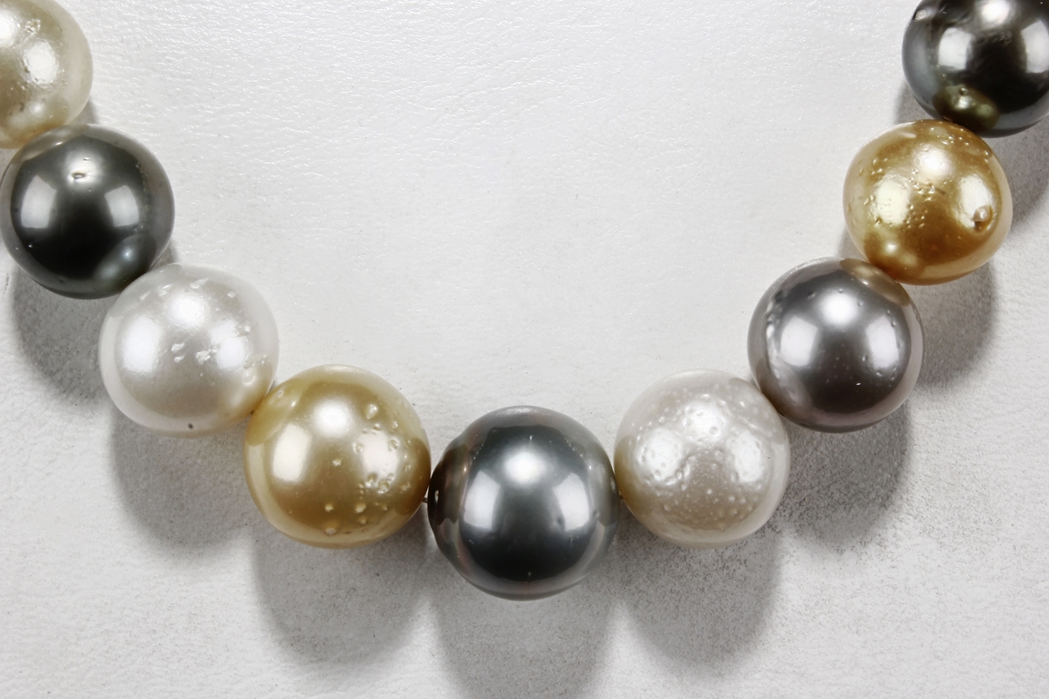The necklace comprised of Tahiti pearls of various tone, including golden, black, and white, all polished in the form of beads, ranging approximately from 11mm to 15mm.