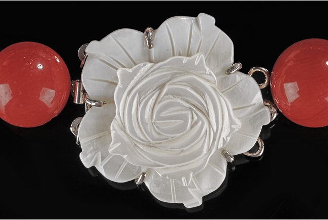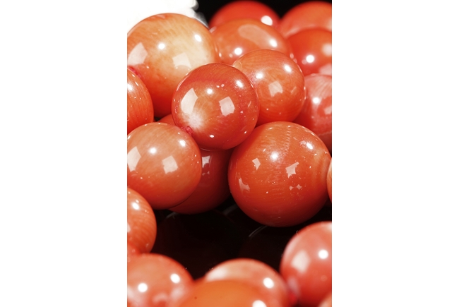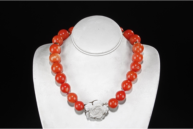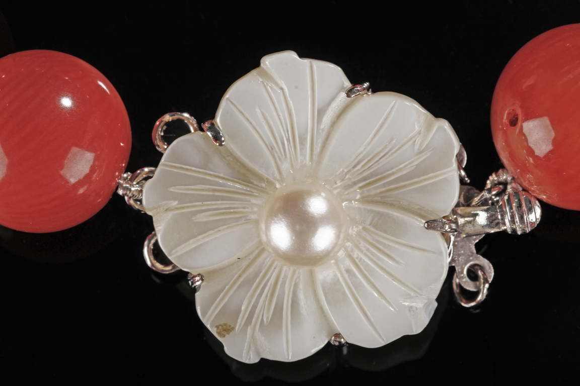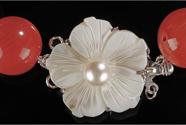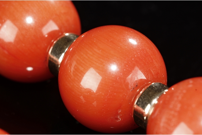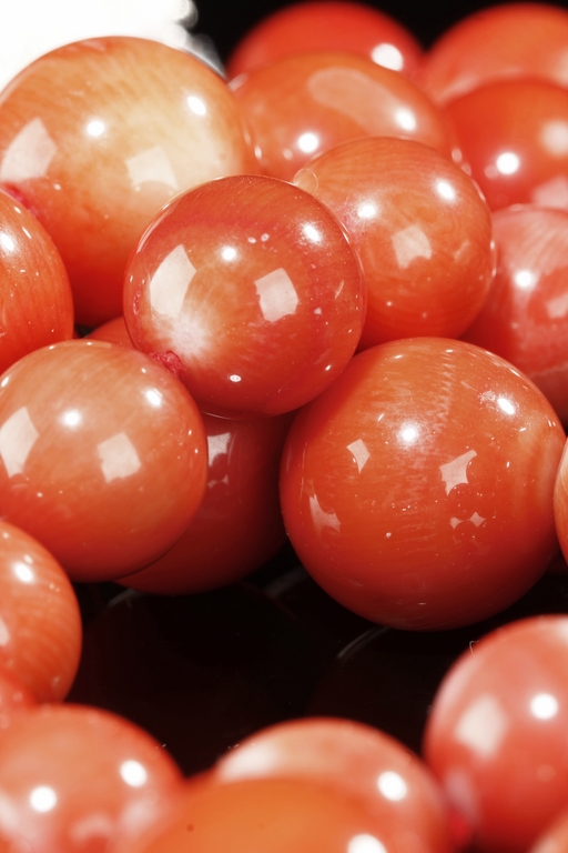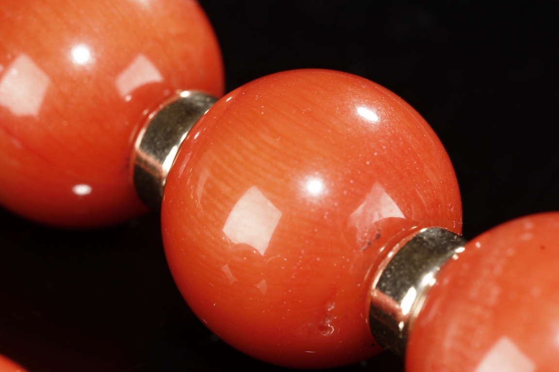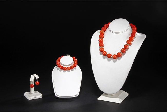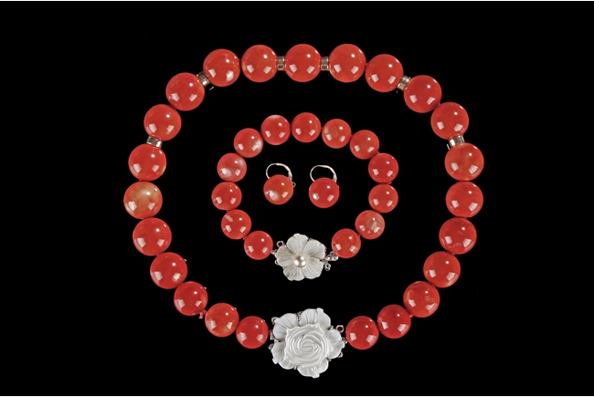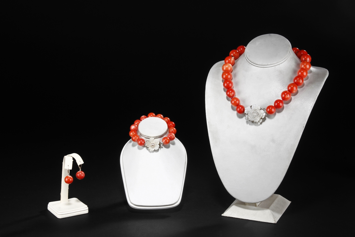 The necklace, bracelet, and earring comprised of pink coral, all cut and polished in the form of bead, approximately ranging from 18.75 mm to 14.5 mm.
