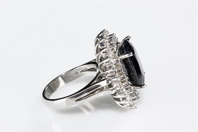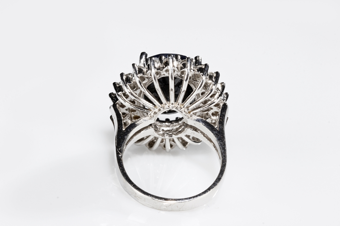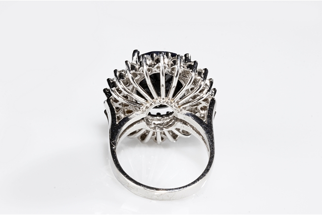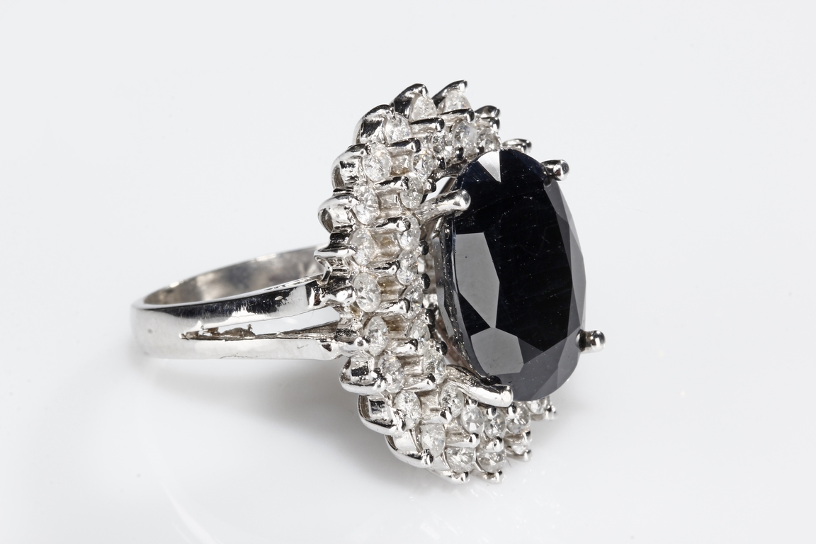 The natural sapphire is cut in the form of oval shape, with 10 ct in weight, within diamond double surround in 3.2 ct, mounted in 14K white gold.