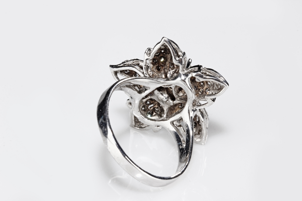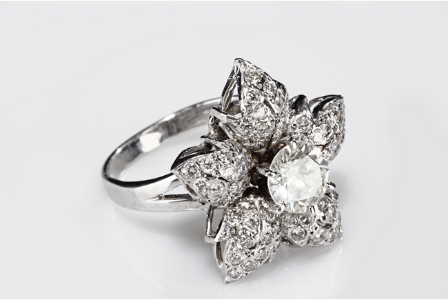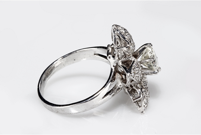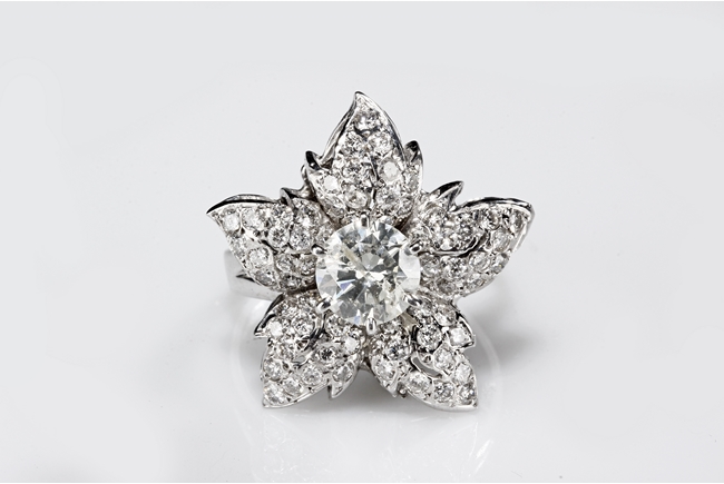 The 1.01 ct South African diamond in the center is within 1.0 ct diamonds surround in the form of petals, mounted on 14 K white gold.