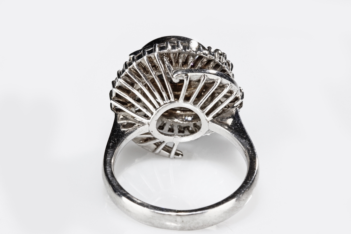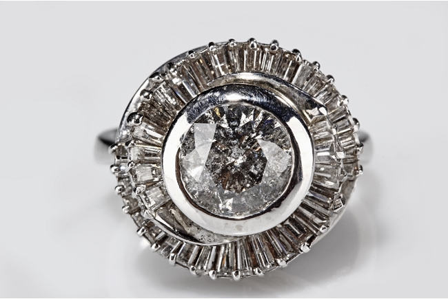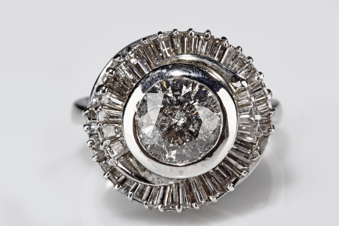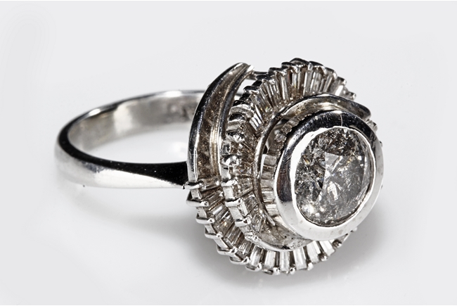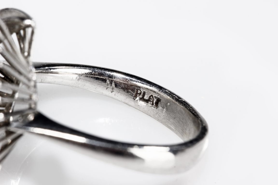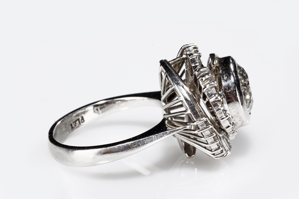 The single 2.12 ct diamond in the center is within 1.95 ct diamond surround, all mounted on the platinum gold.