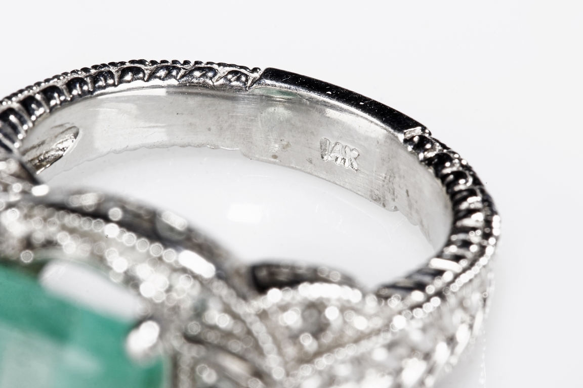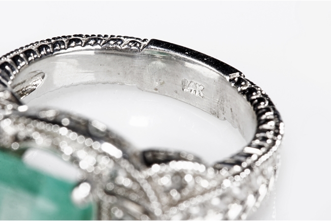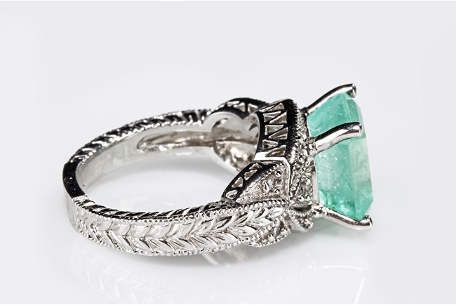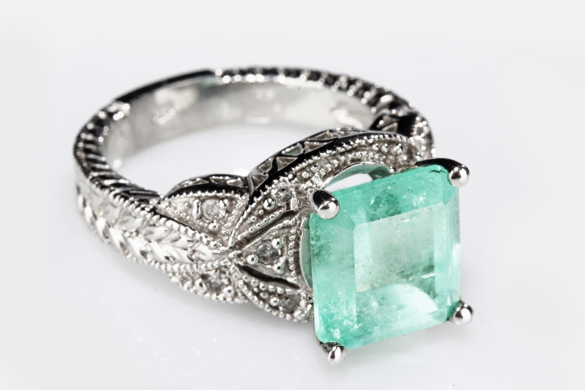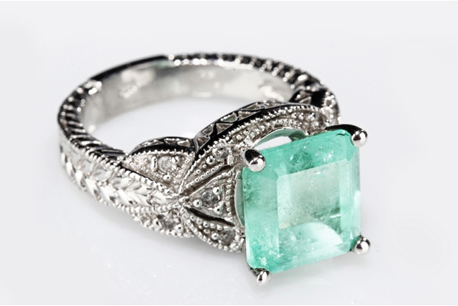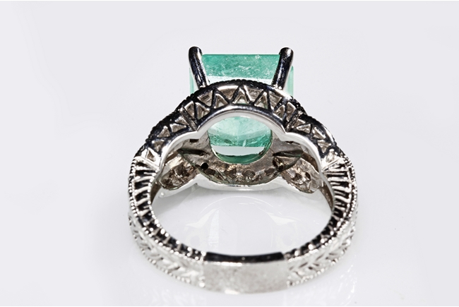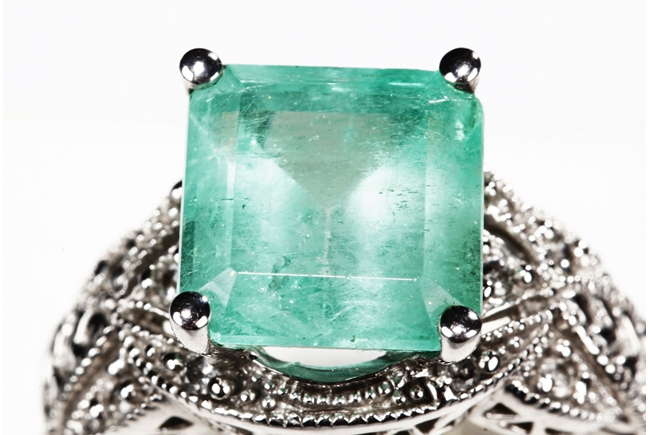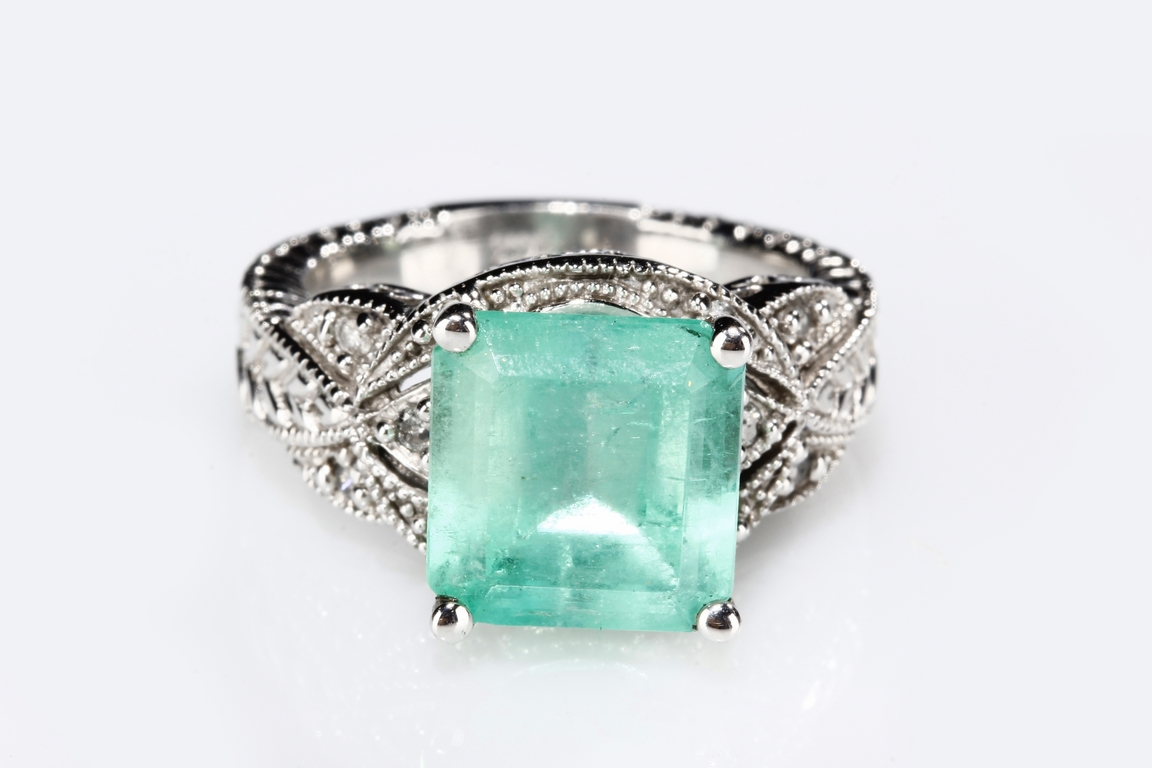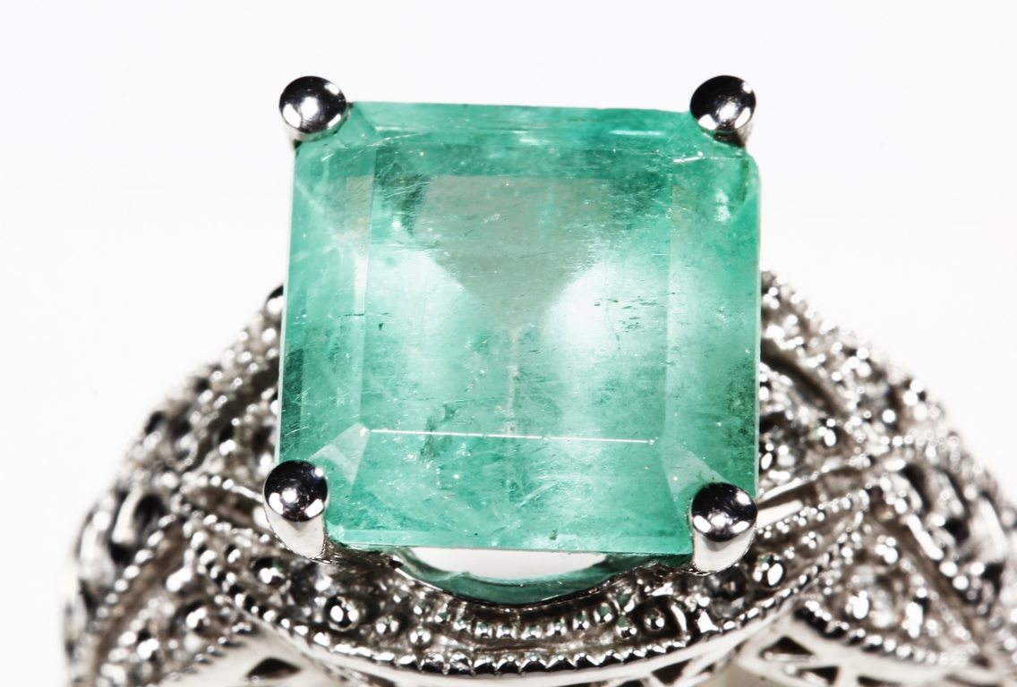 The 5.8 ct rectangular cut Colombian emerald is within 0.41 ct diamond surround, all mounted on 14K white gold.