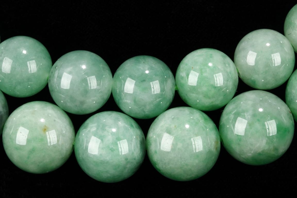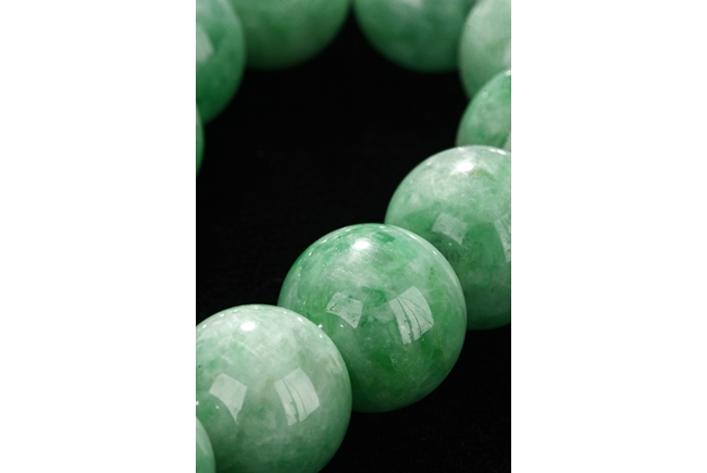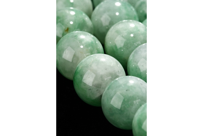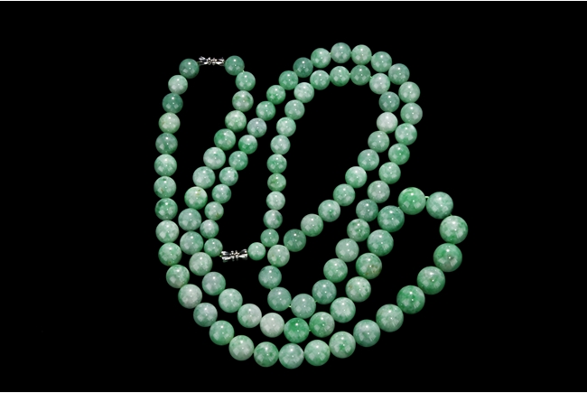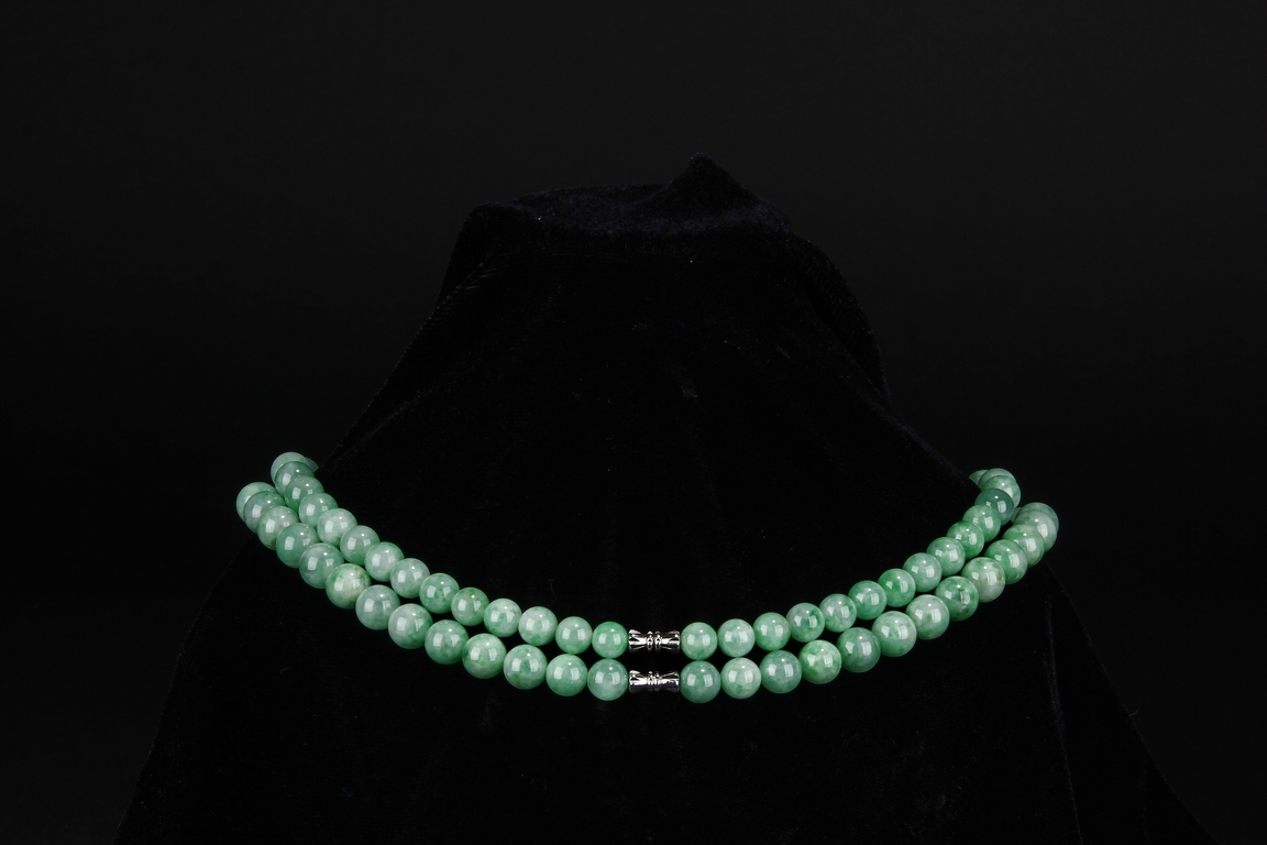 The two jadeite necklaces have same design, with jadeite round beads ranging from 8.36mm to 12.64mm in diameter, one necklace has 55 beads, and the other has 49 beads. The color of apple green with white color and translucency. Qing Dynasty period.