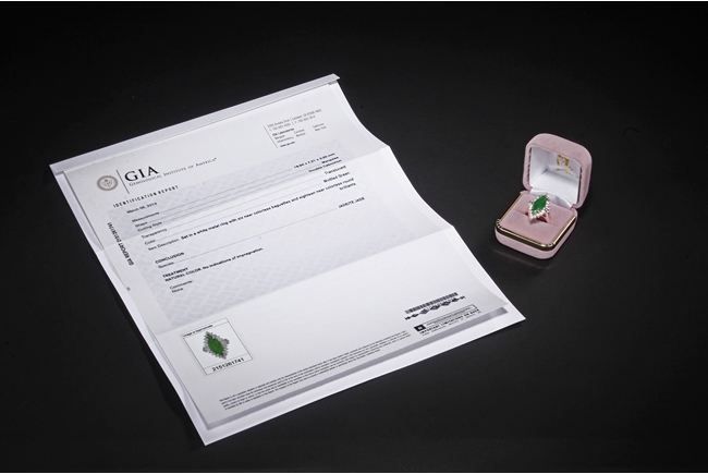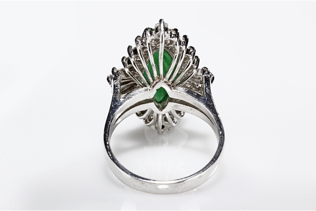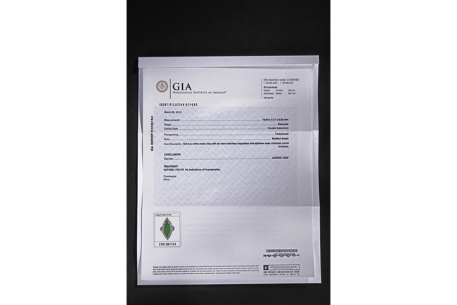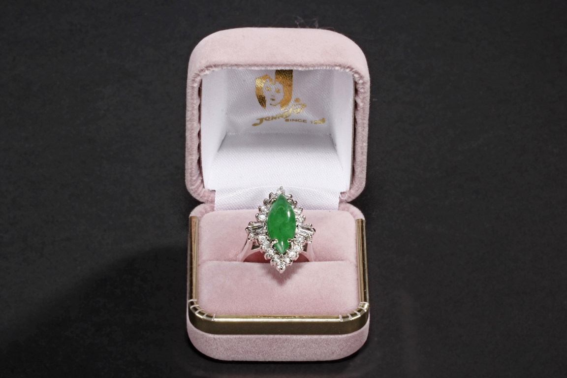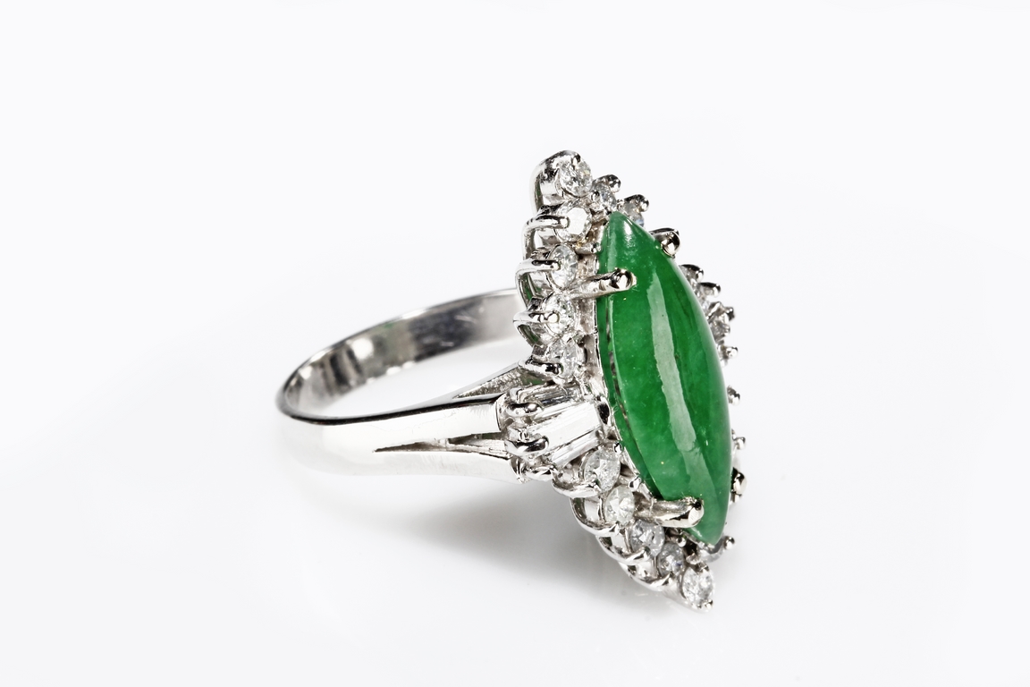 The double cabochon marquise shaped jadeite fitted into a 14k white gold band and setting, surrounded by diamonds of various cuts, the stone color of mottled green. Includes GIA certificate 2151261741.