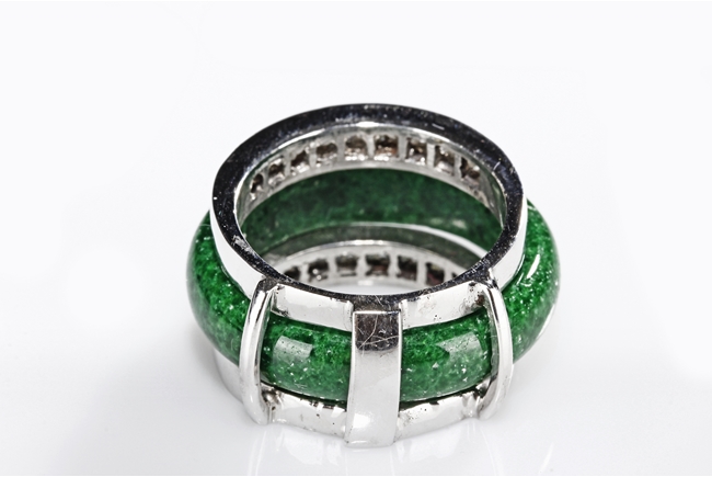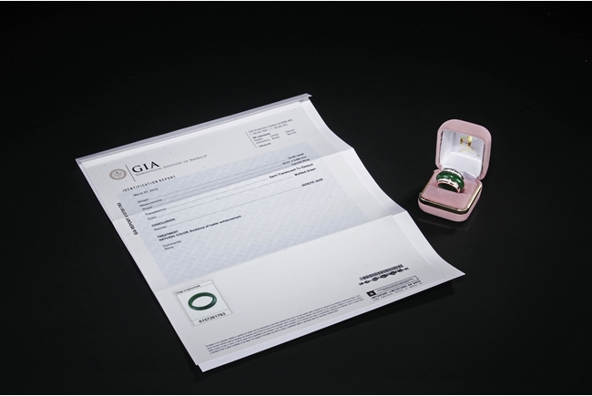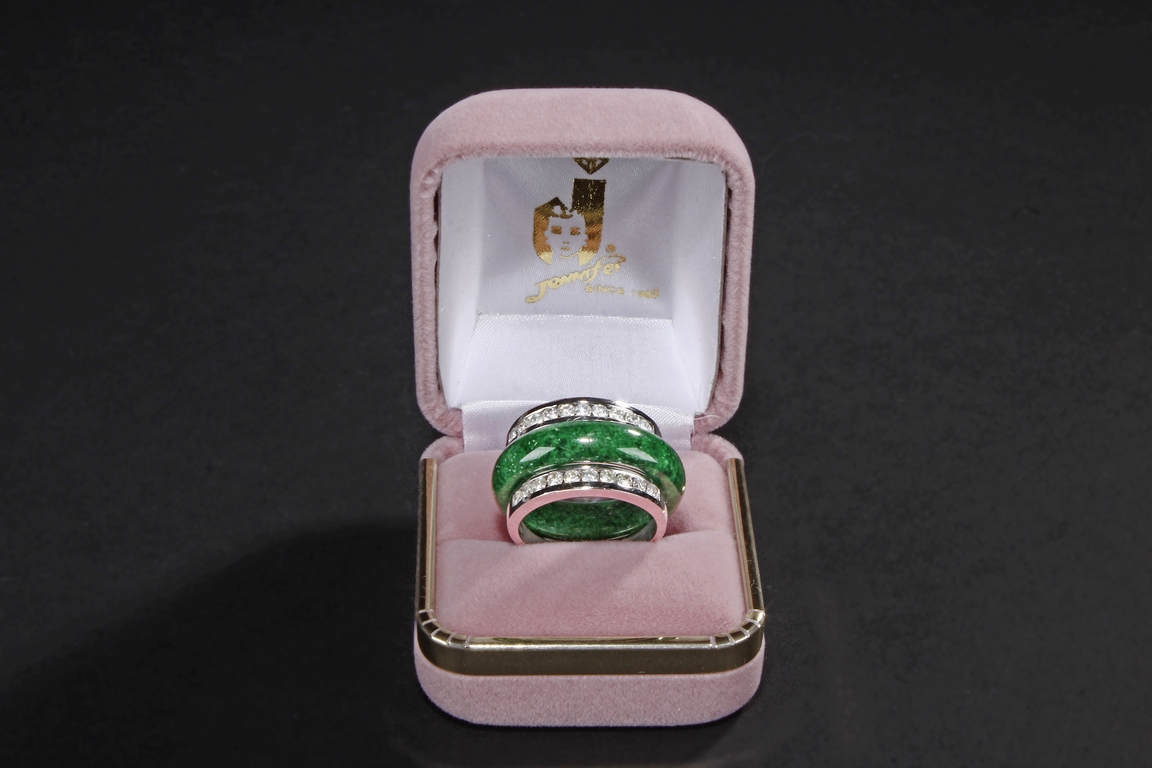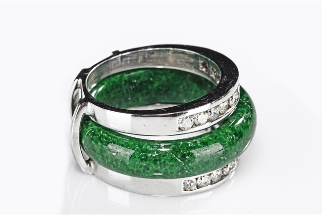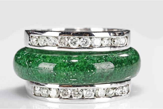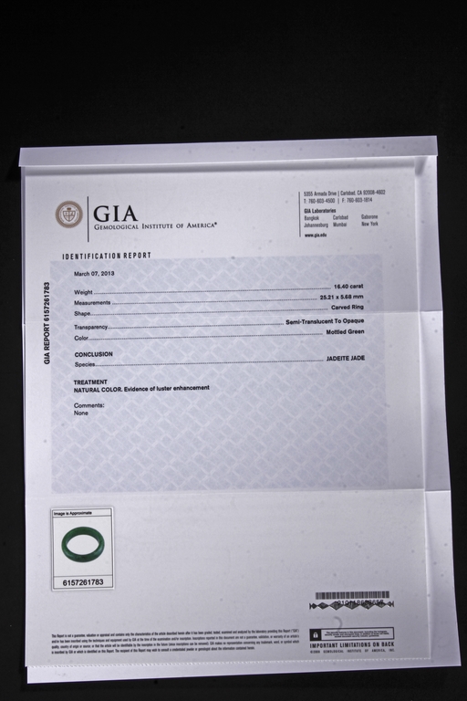 The jadeite carved ring measured at 25mm by 5mm has semi-translucent mottled green color, inset between 14k white gold bands decorated with diamonds. Includes GIA certificate 6157261783.
