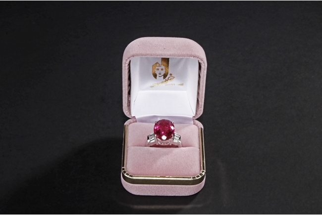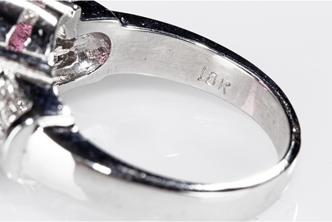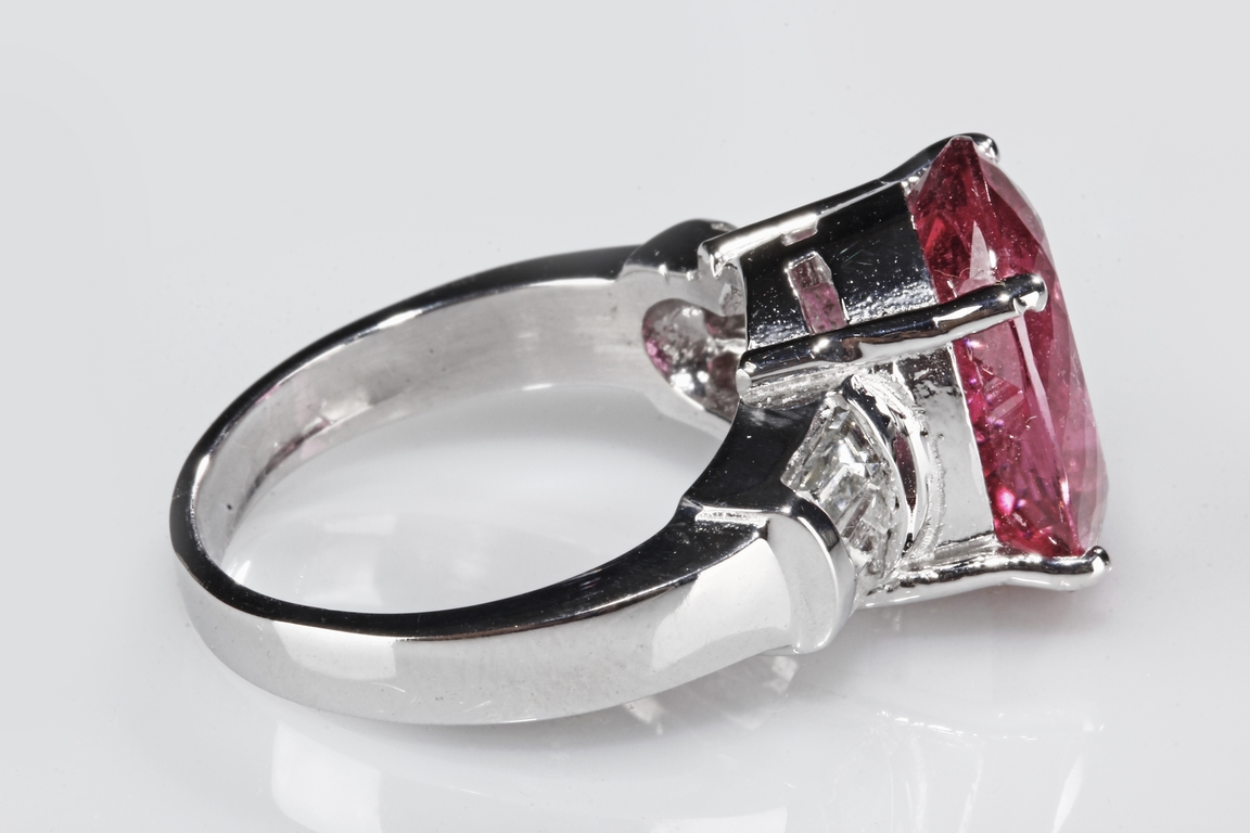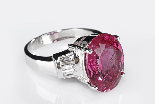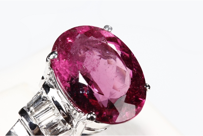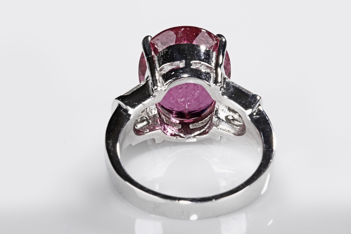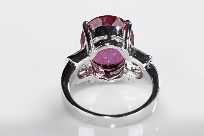 The oval-cut transparent purplish pink tourmaline measuring approximately 14.25 x 11.12 x 6.15 mm, with weight of 6.78 ct, flanked by diamond surrounds, mounted on 18 K white gold.