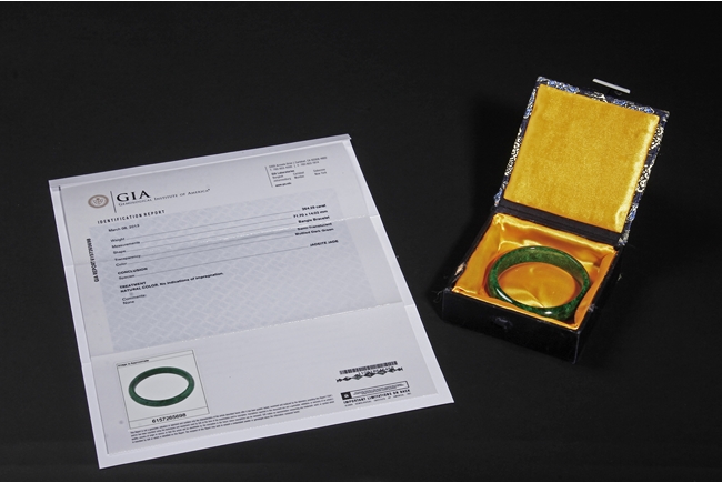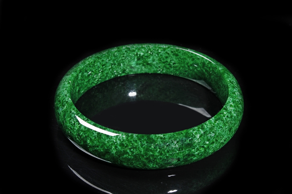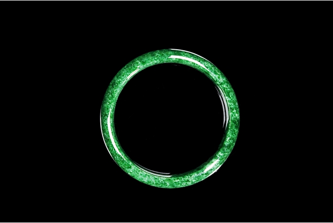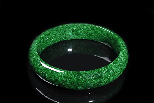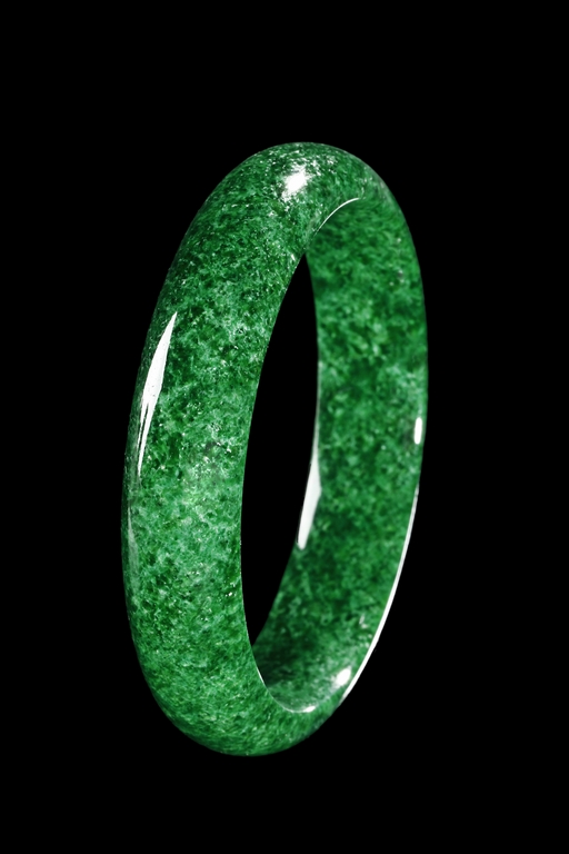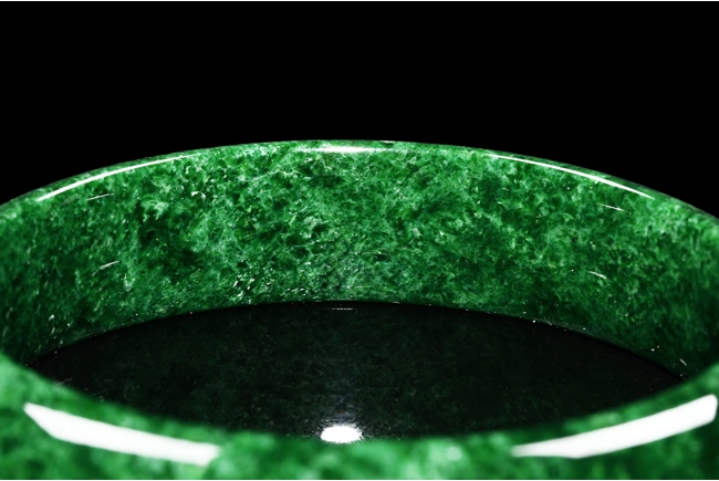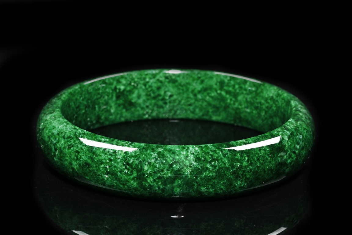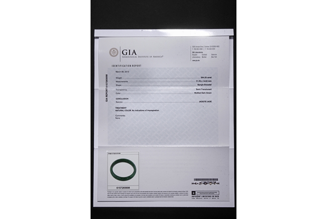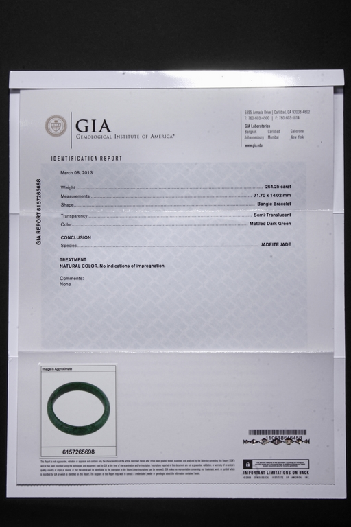 The mottled dark green jadeite bangle of semi-translucence, measuring 71.70 x 14.02 mm, with weight of 264.25 carat.