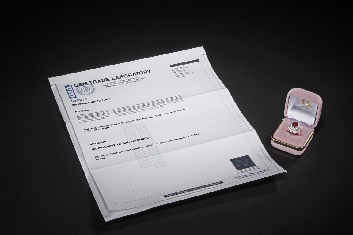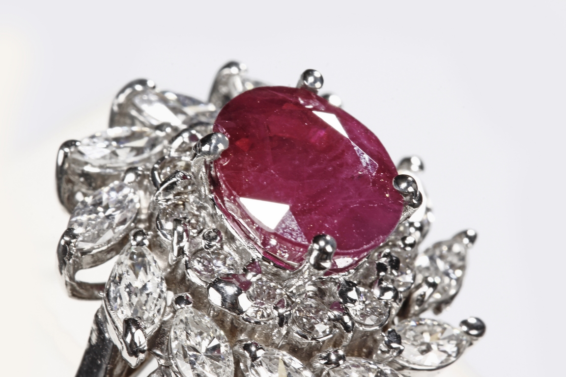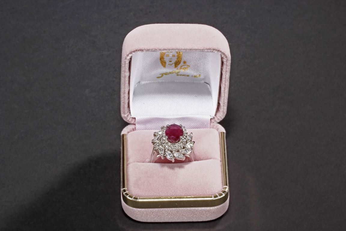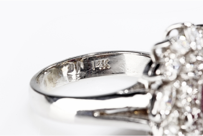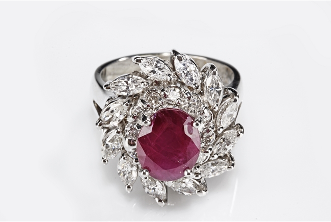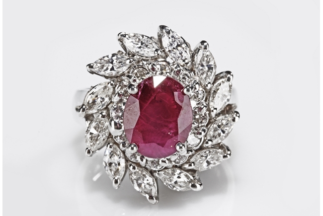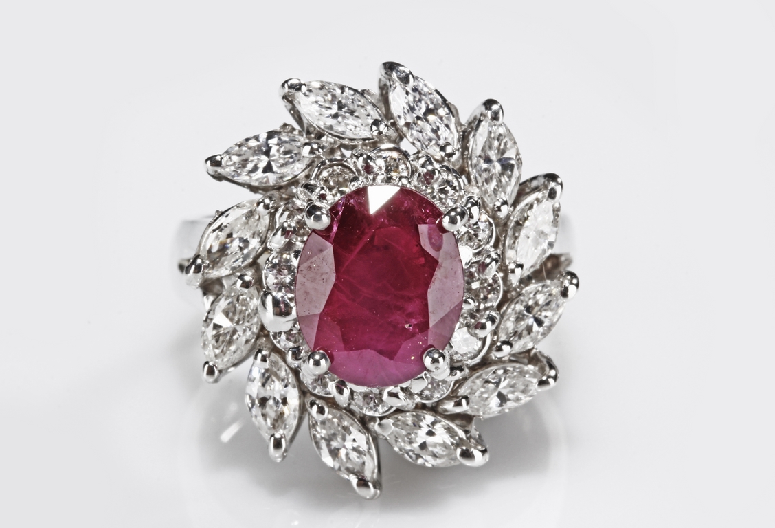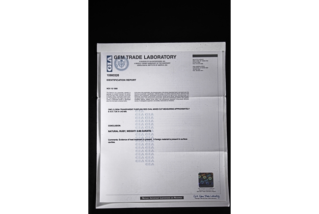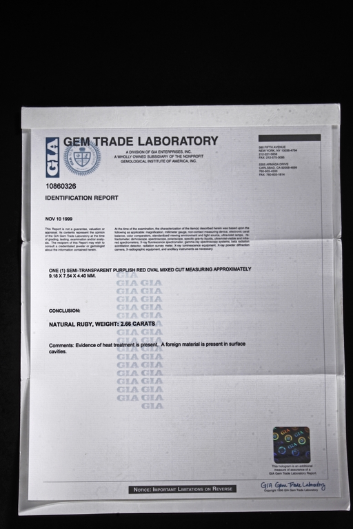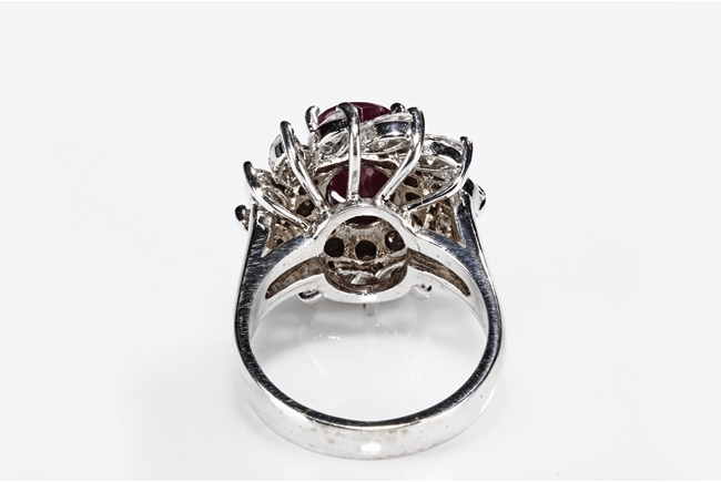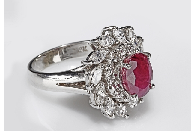 - Dimension: Diamond: 2.53 ct. 14k white gold Ruby: 9.18 x 7.54 x 4.40 mm 2.66 ct.