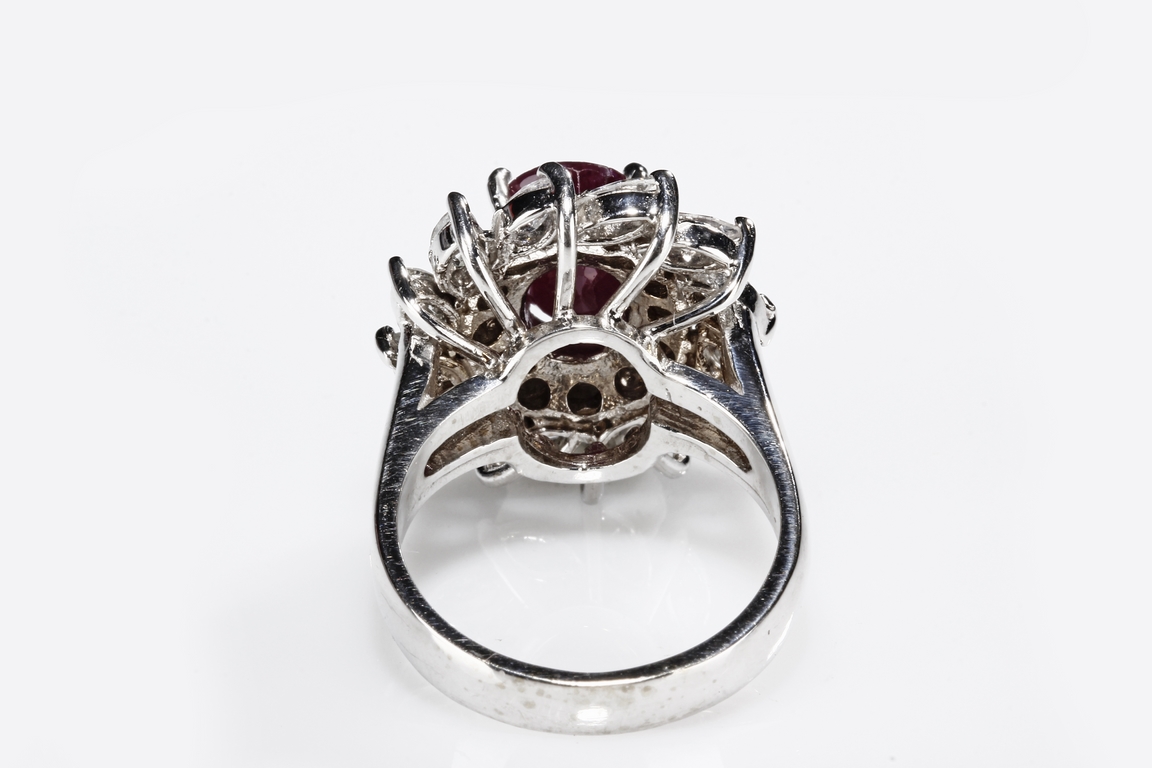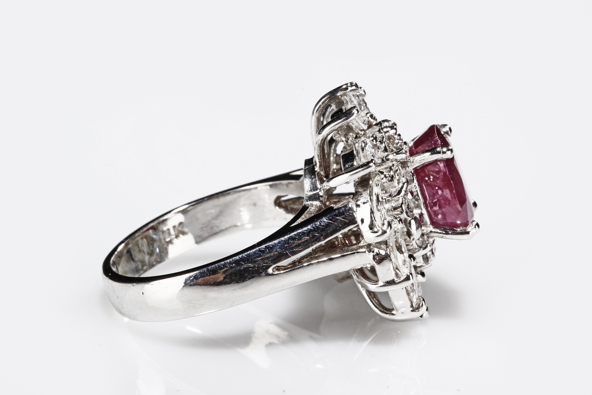 The oval-cut transparent ruby in center measuring approximately 9.18 x 7.54 x 4.40 mm with weight of 2.66 ct, within in 2.53 ct diamond surrounds, all mounted on 14K white gold.