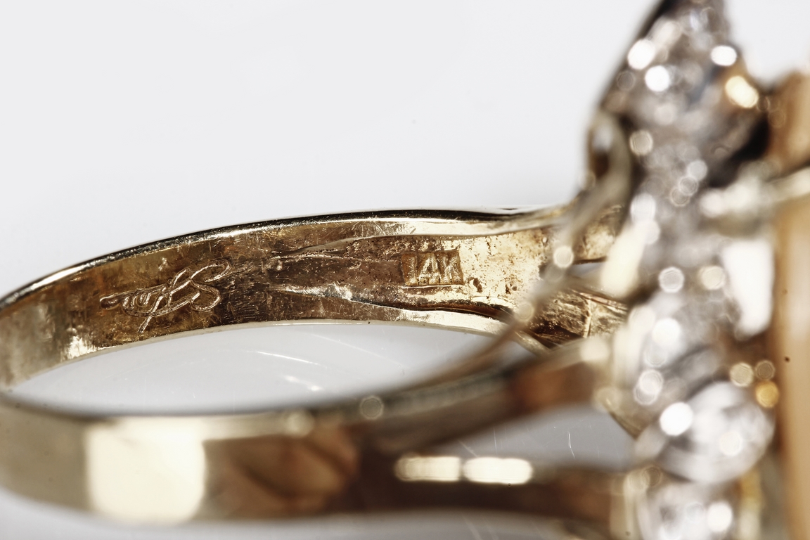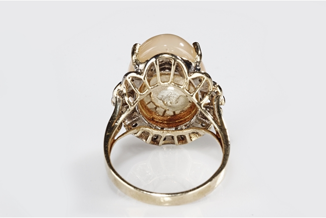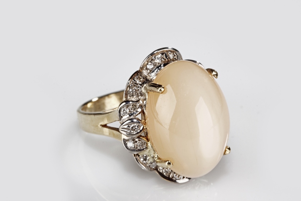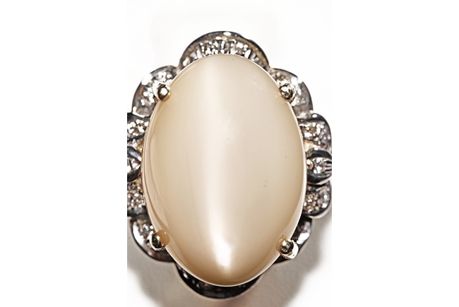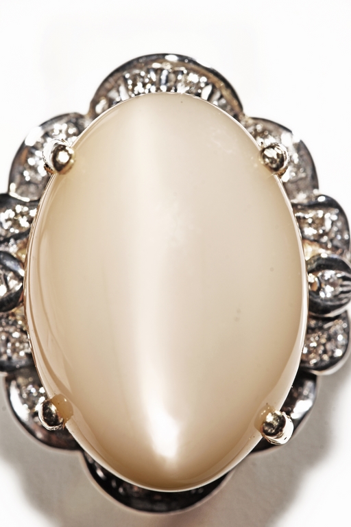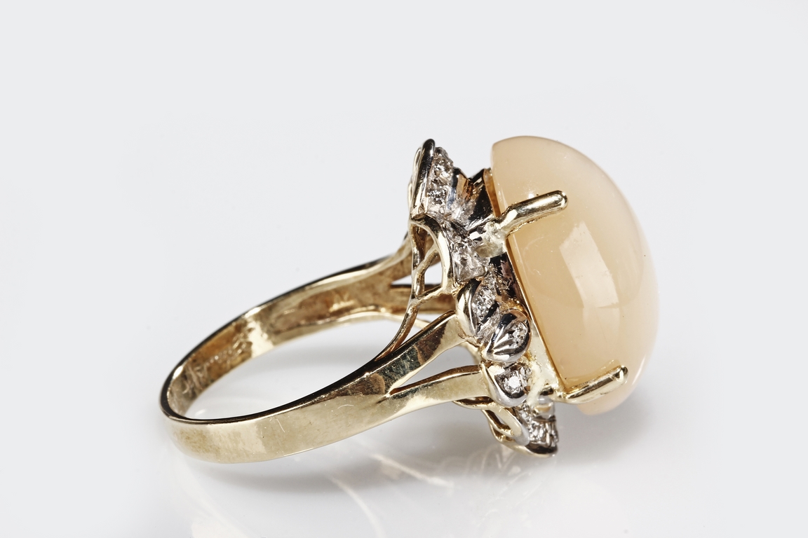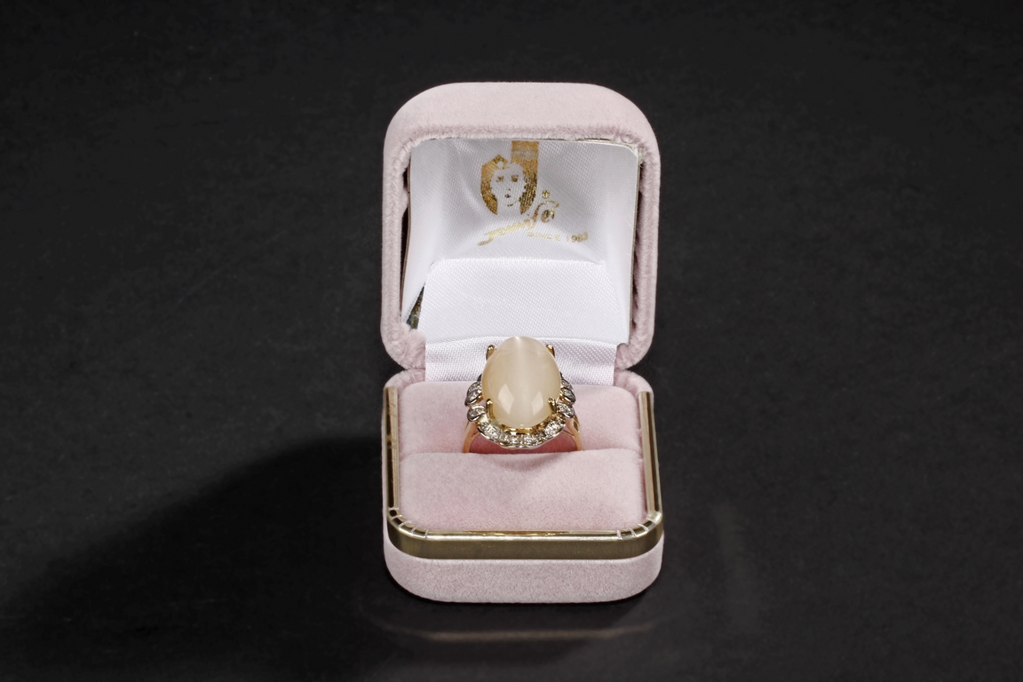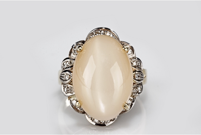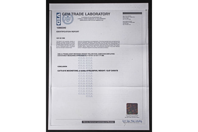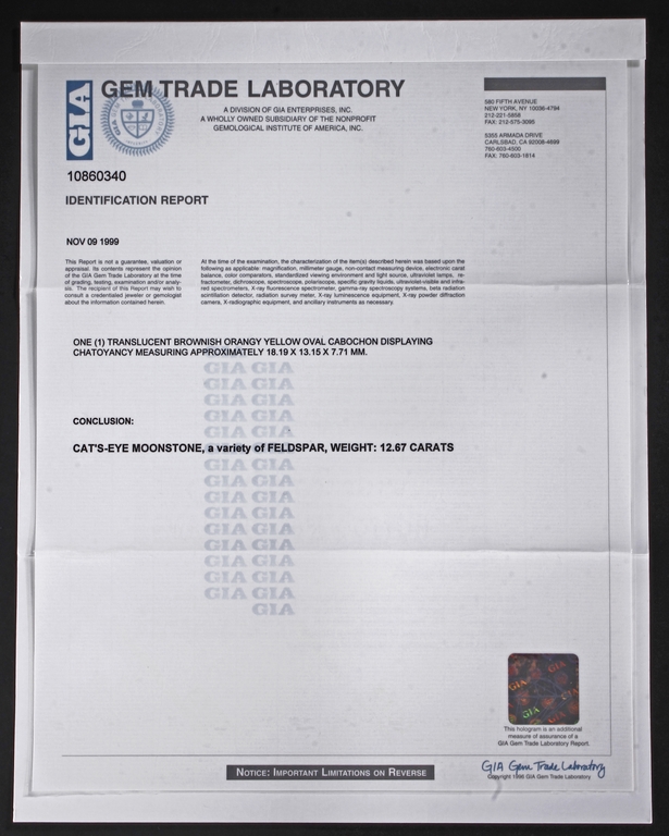 The ring includes a Brazilian 12.67 carats cat's-eye moonstone cabochon, set on 14k yellow gold setting, decorated with diamonds on the side. Includes 1999 GIA Certificate No. 10860340.