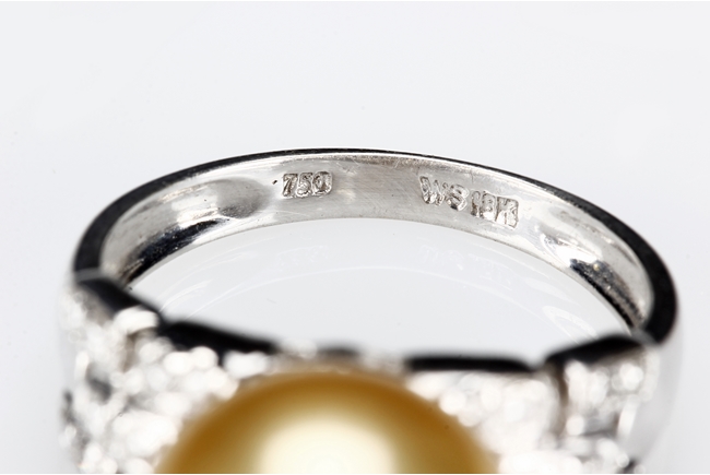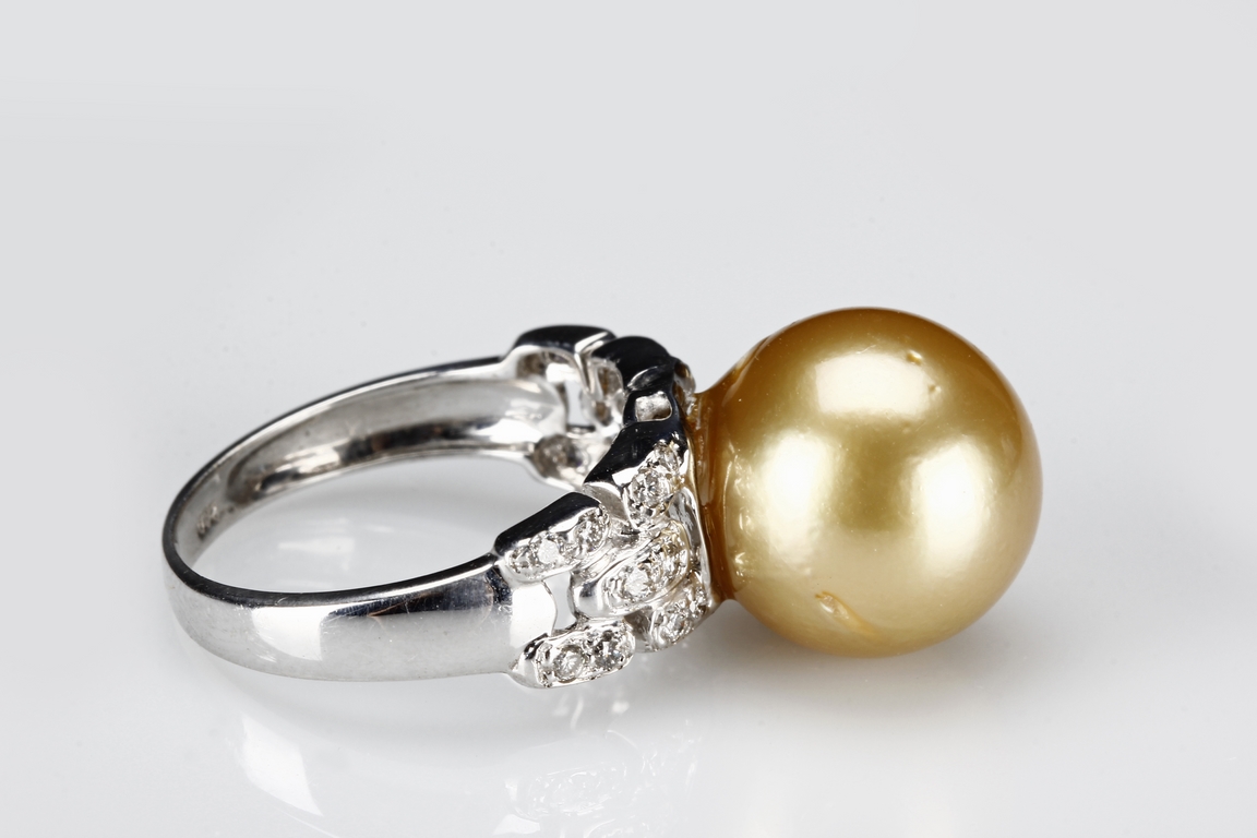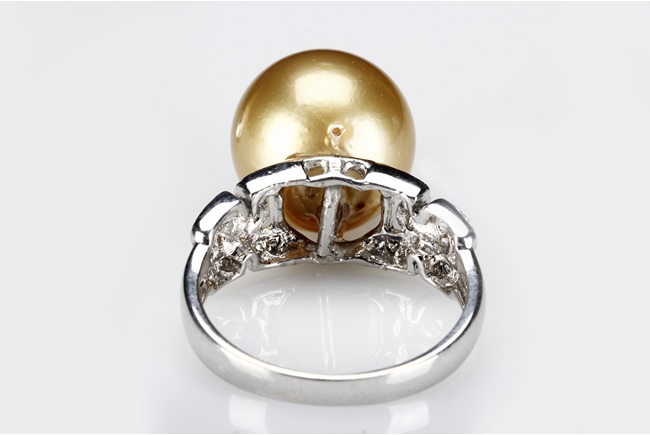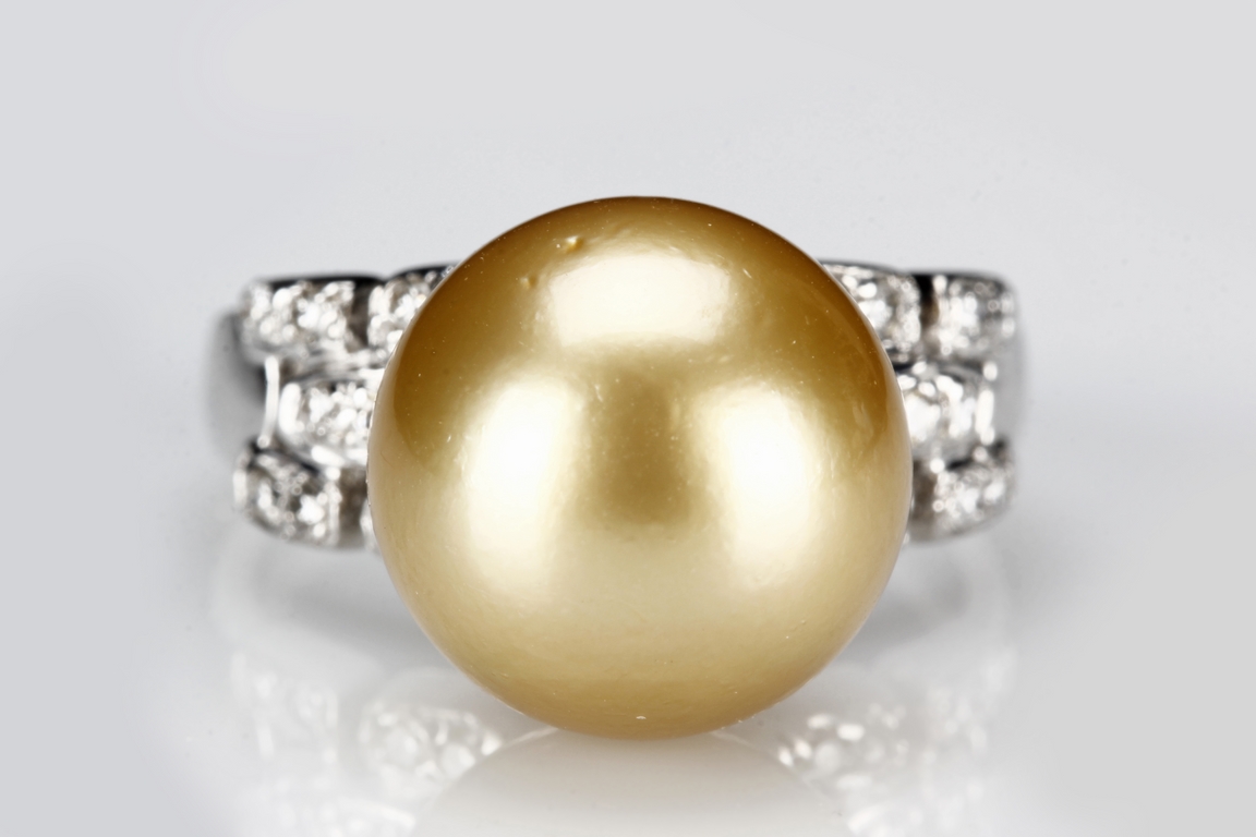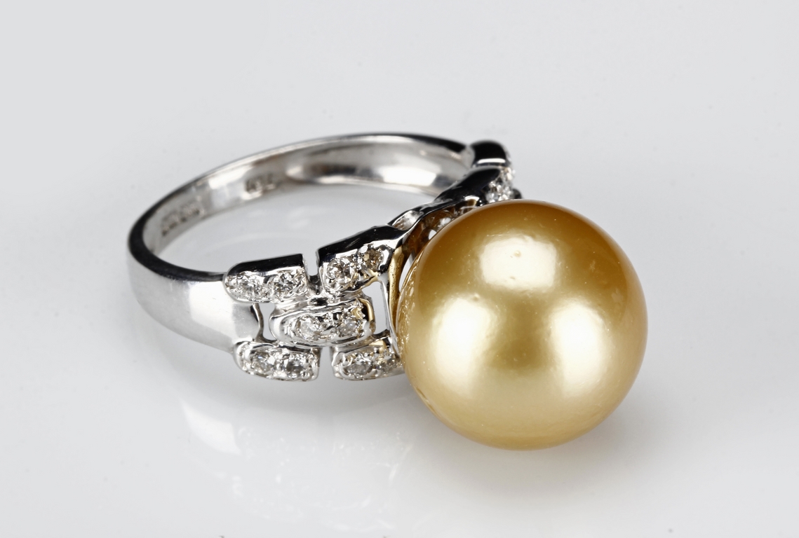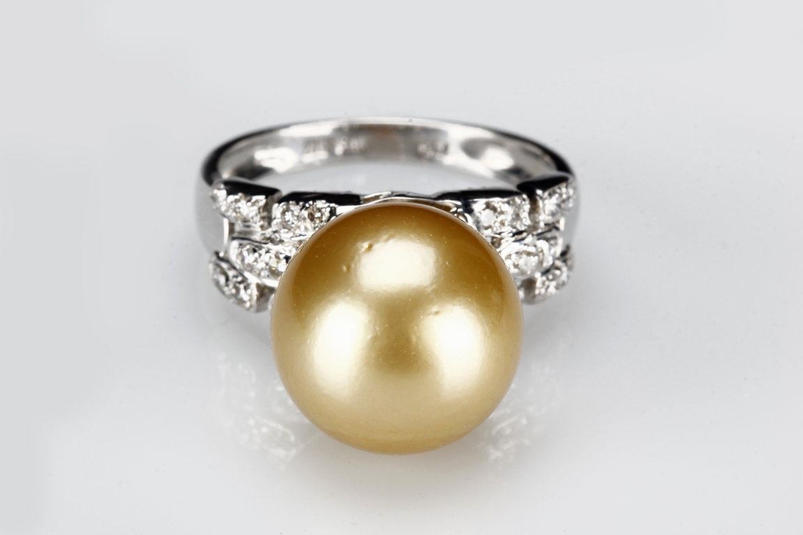 The large Australian Southern Sea Gold Pearl measured 13mm in diameter, set into 18k white gold band, and decorated with 0.70 carat of diamonds.