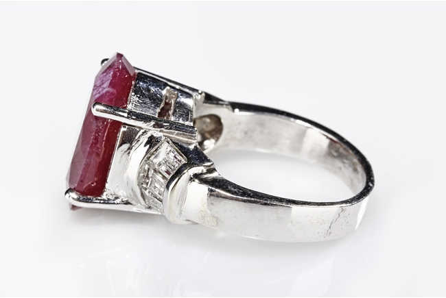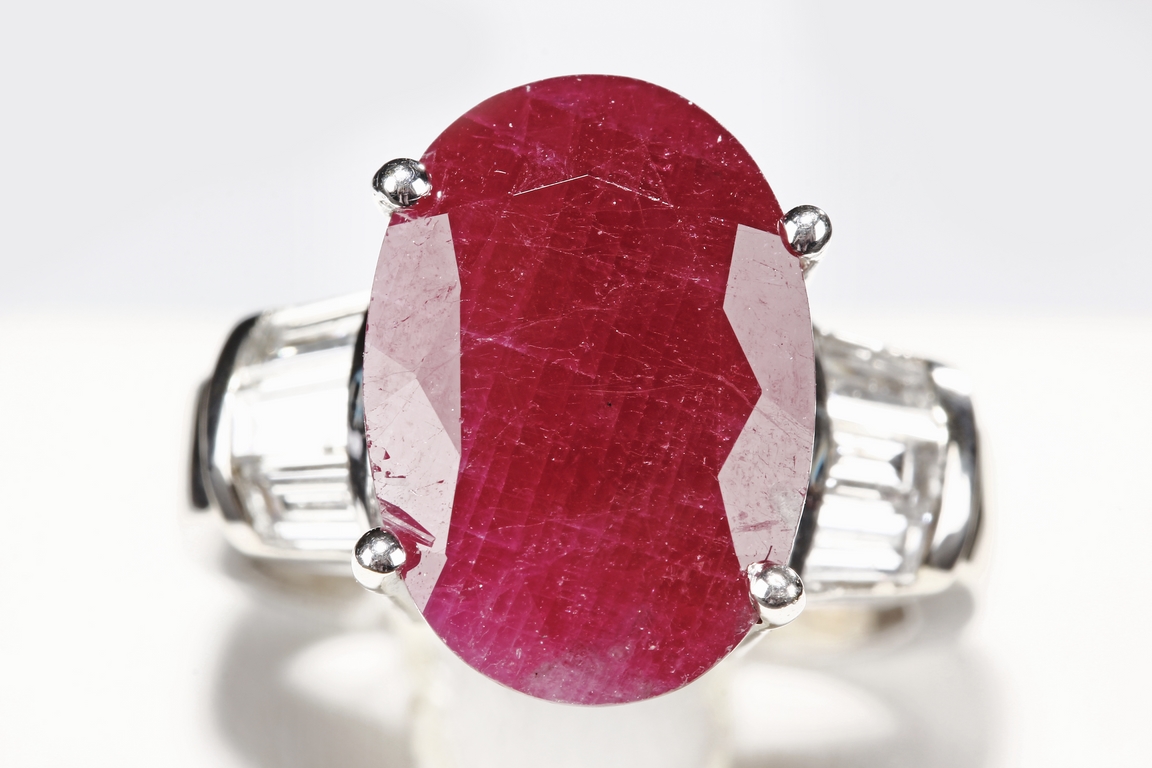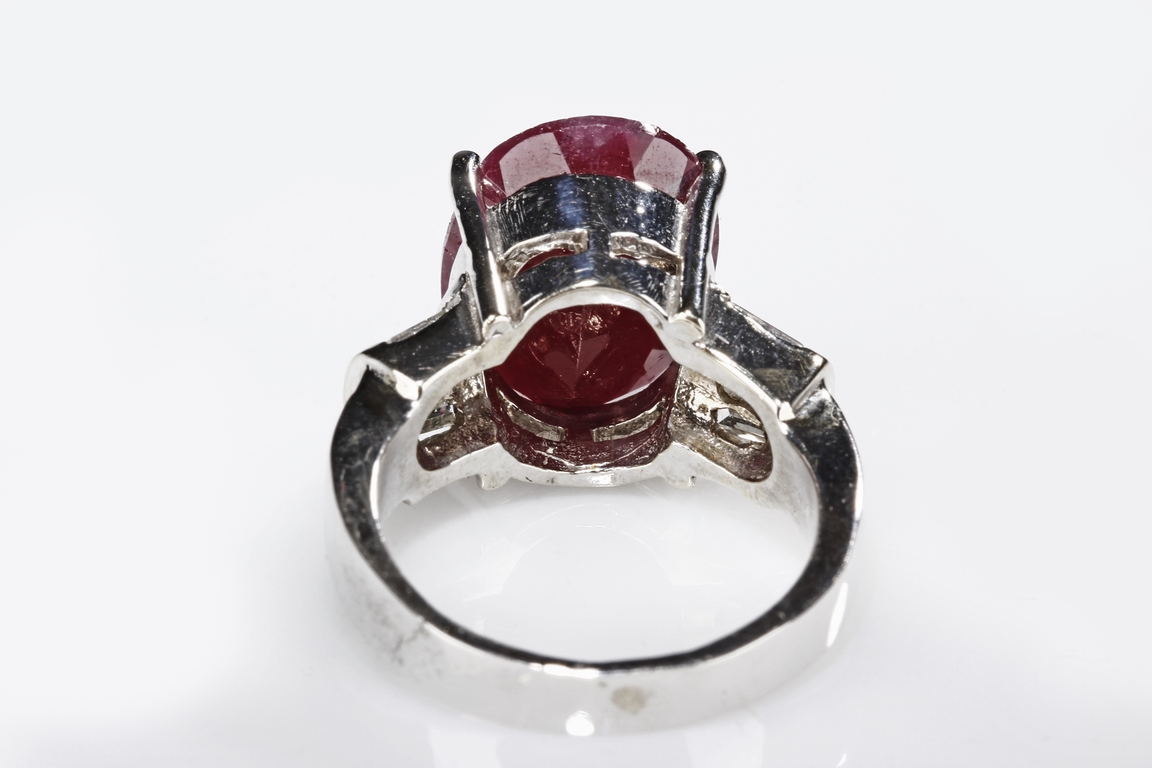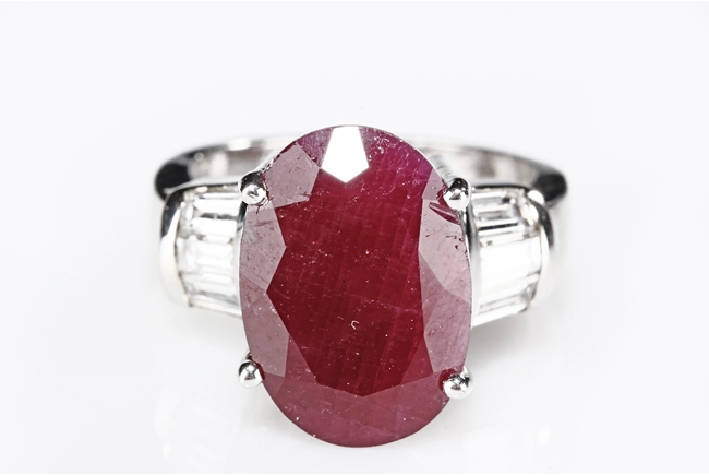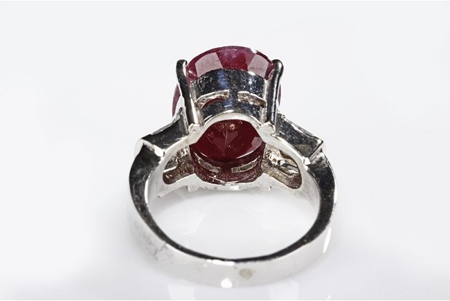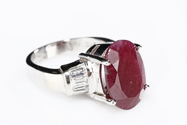 The 7.60 ct single oval-cut ruby in the center is flanked by 0.89 ct diamond on either side, all mounted on a 14 K white gold.