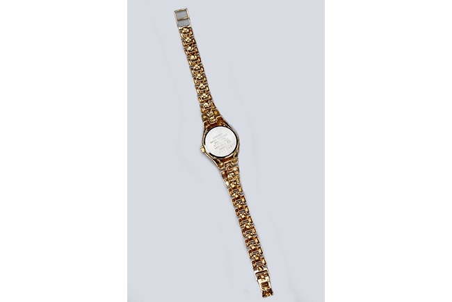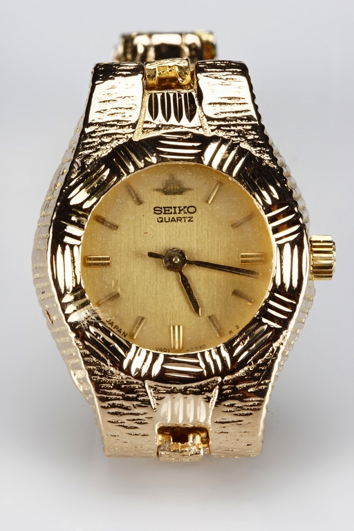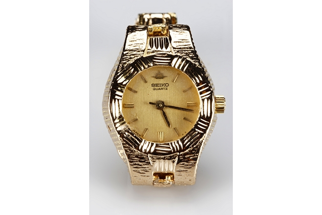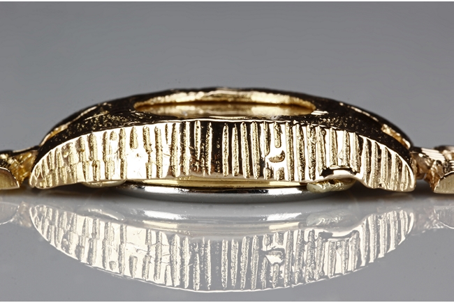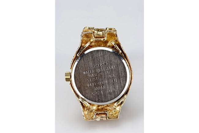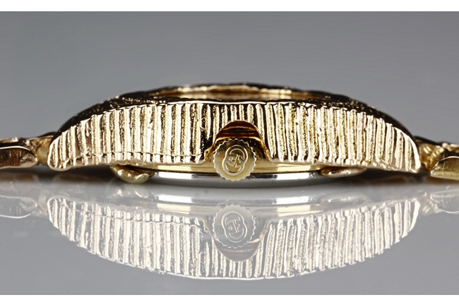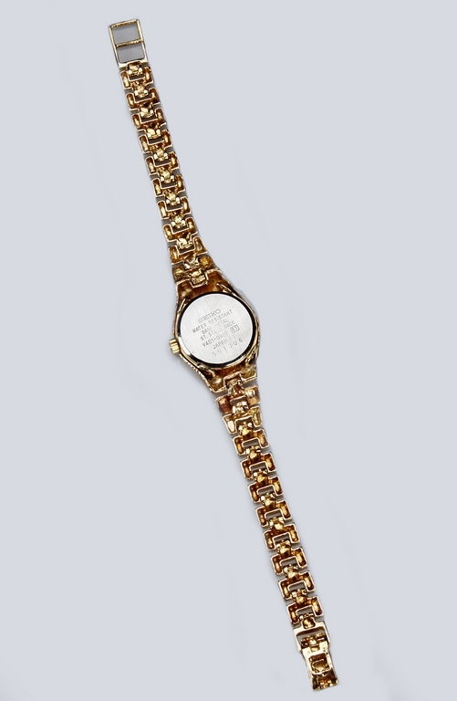 The vintage watch has 18k gold band and exterior, the back with model number V401-0920 R1.