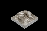 A MARBLE CARVED RECUMBENT LION FIGURE