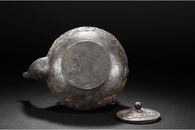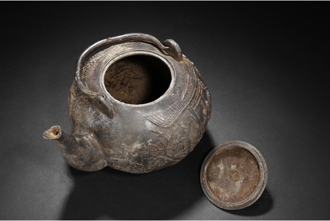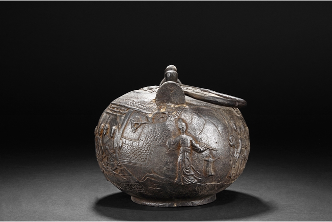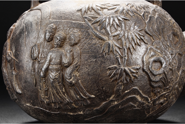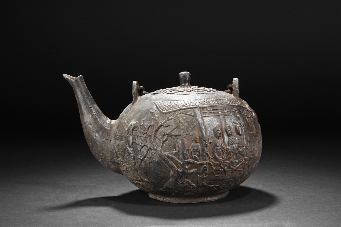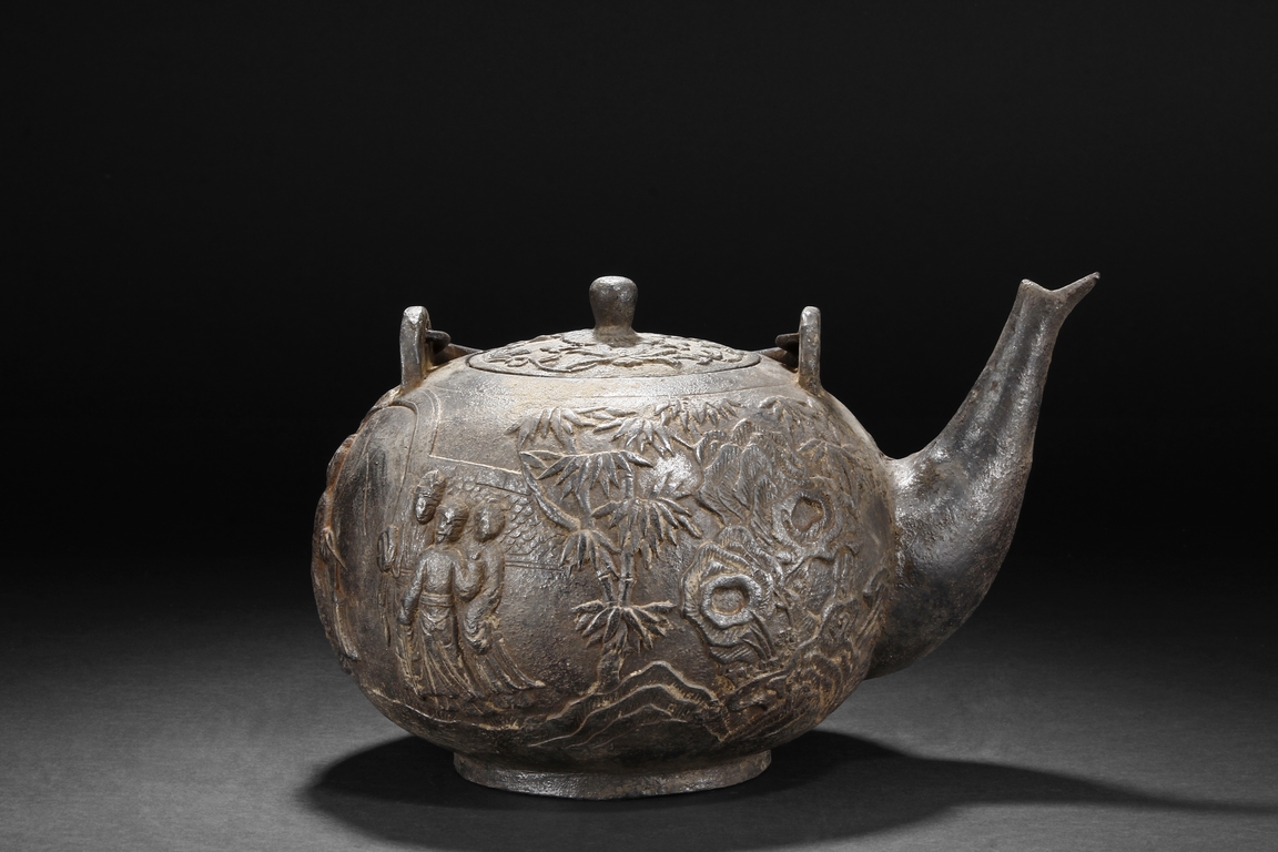 Well casted, the iron teapot is of globular form, the body depicts a scene of gathering in the garden, with the ladies on the side with bamboo trees and rocks, and men seated under a small pavilion, bottom bears four character mark. 18th Century.