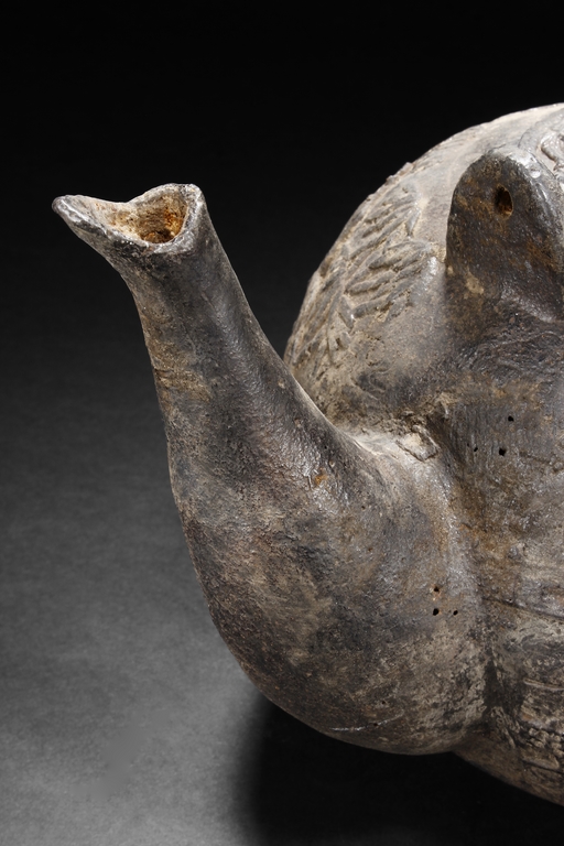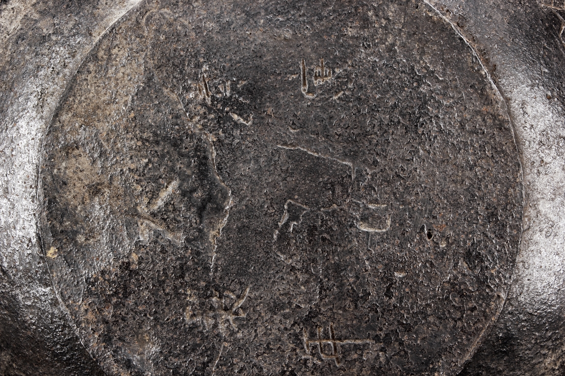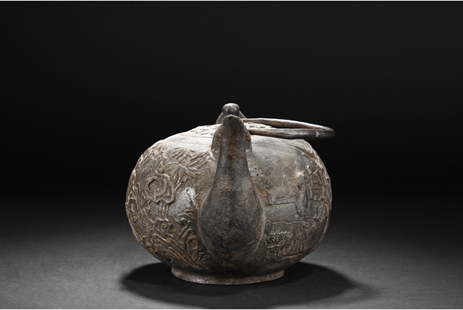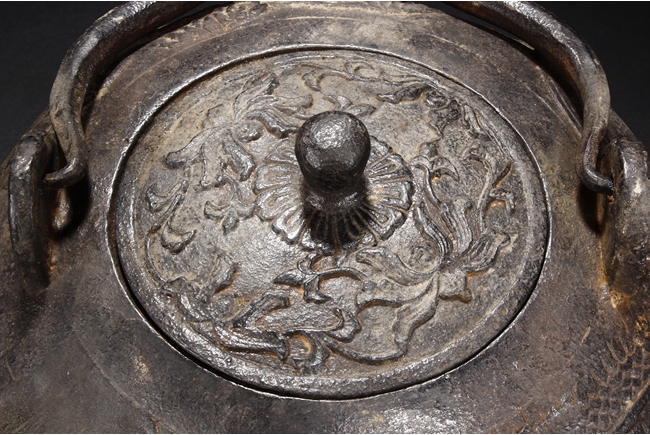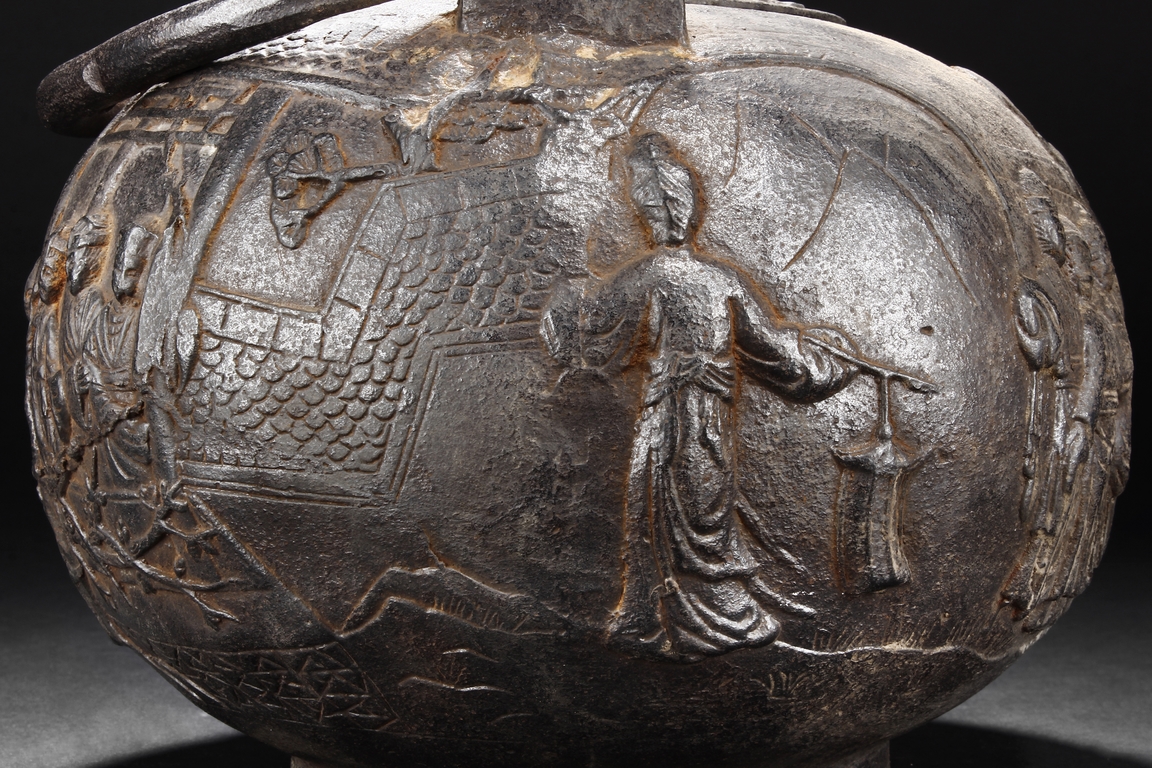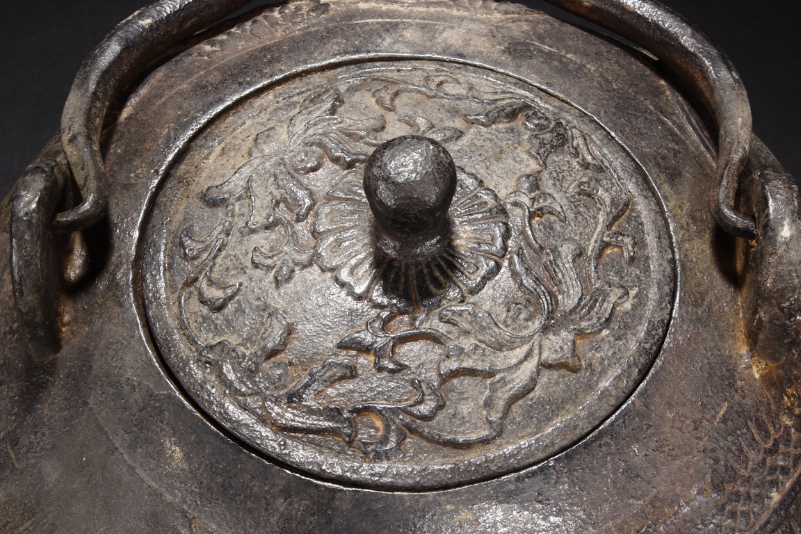 Well casted, the iron teapot is of globular form, the body depicts a scene of gathering in the garden, with the ladies on the side with bamboo trees and rocks, and men seated under a small pavilion, bottom bears four character mark. 18th Century.